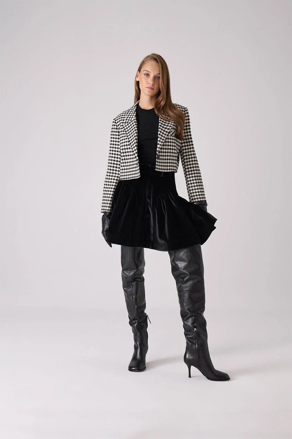 Önden fermuarlı ve kendi kumaşından düğmeli.