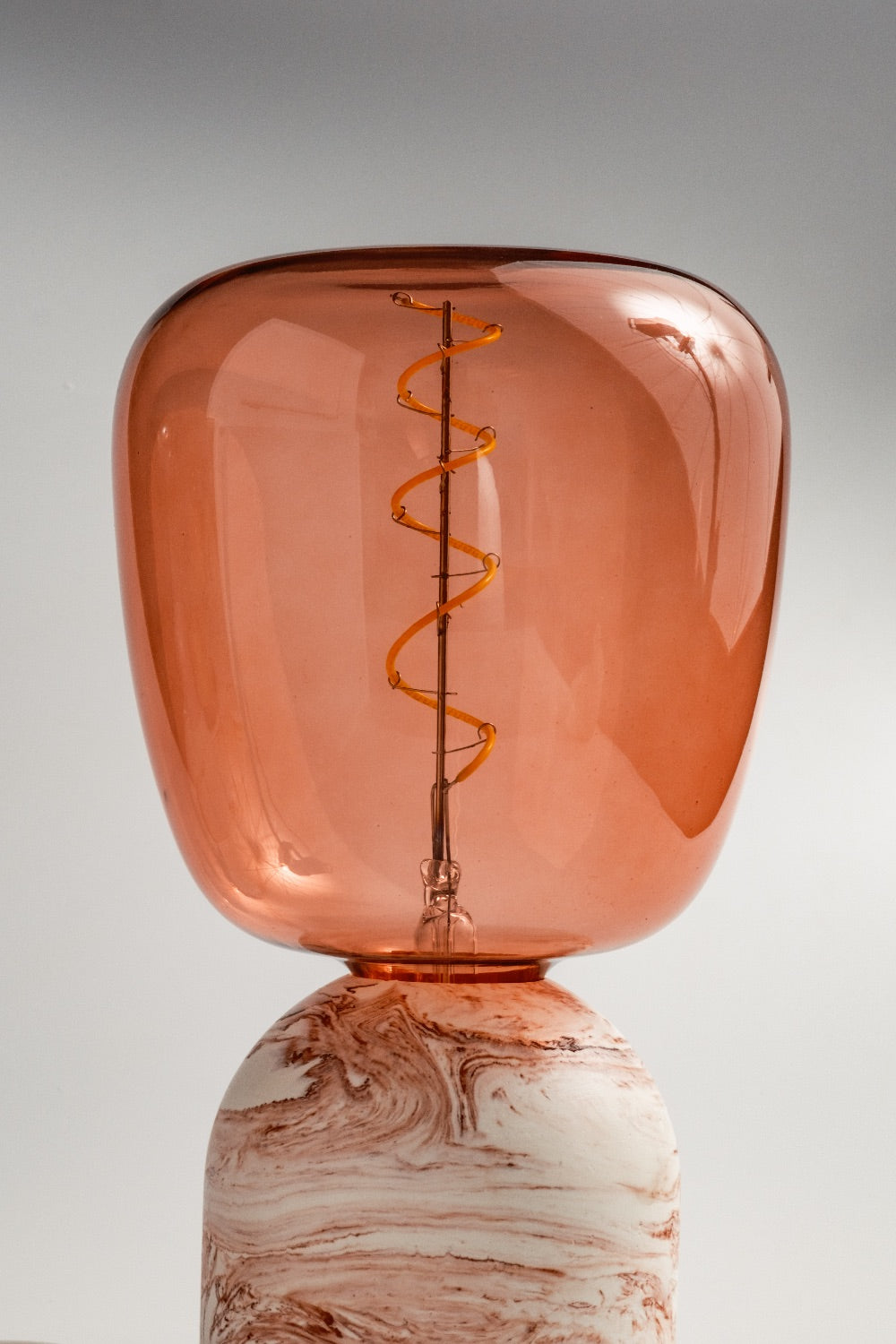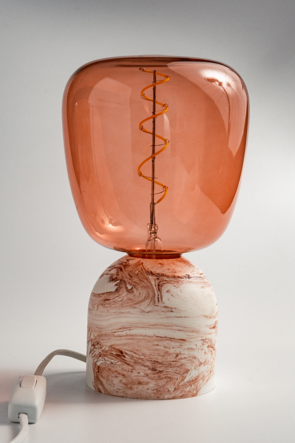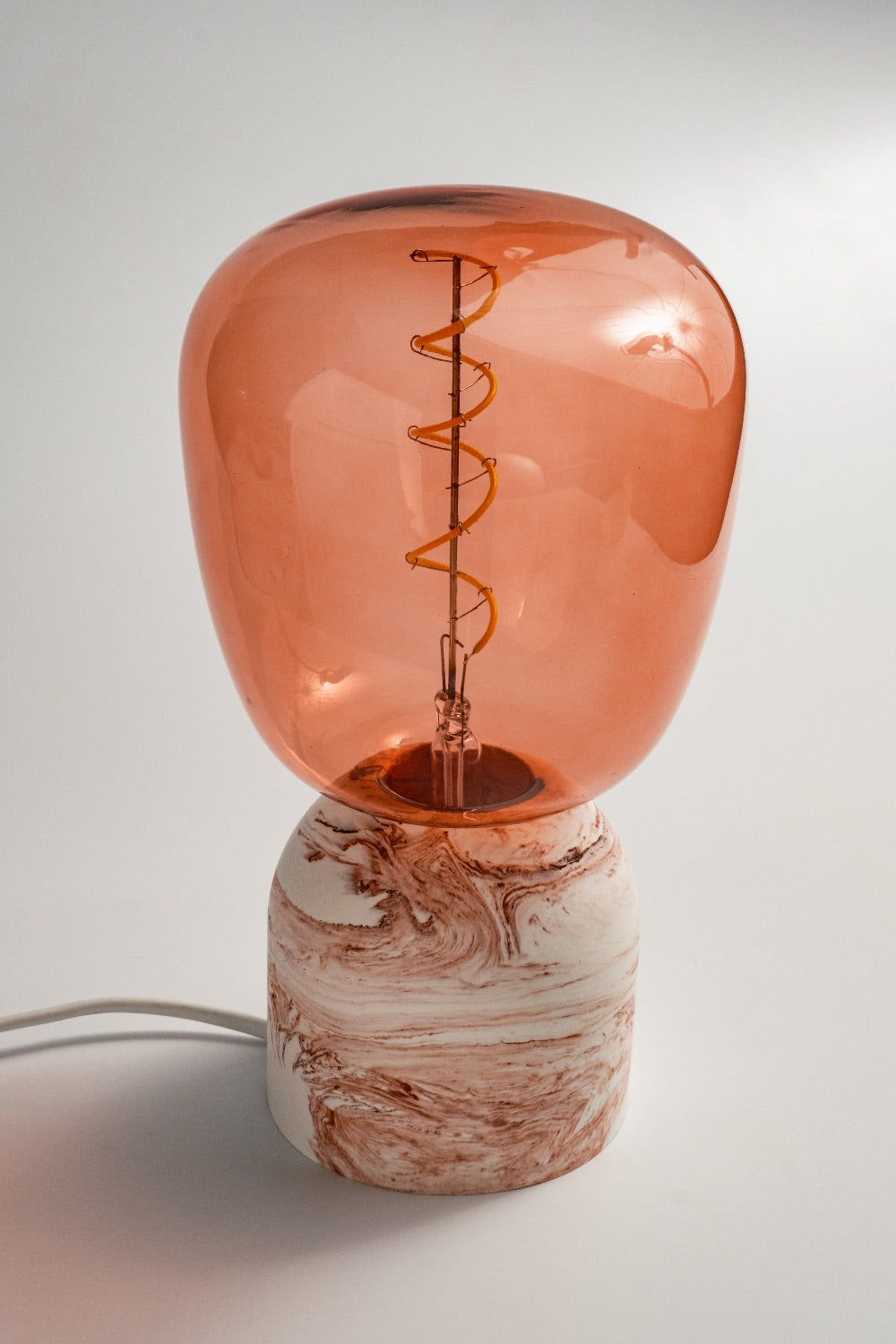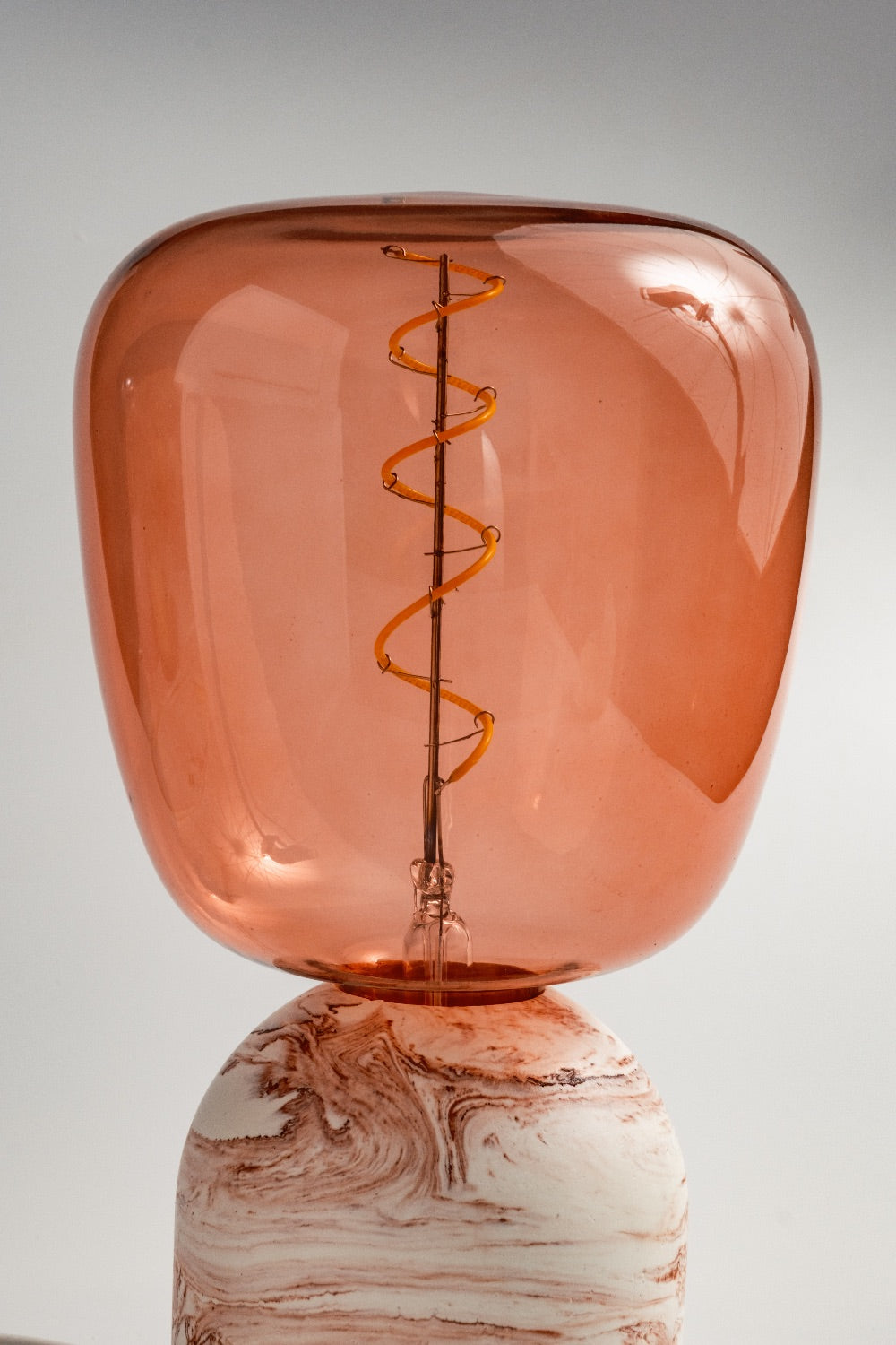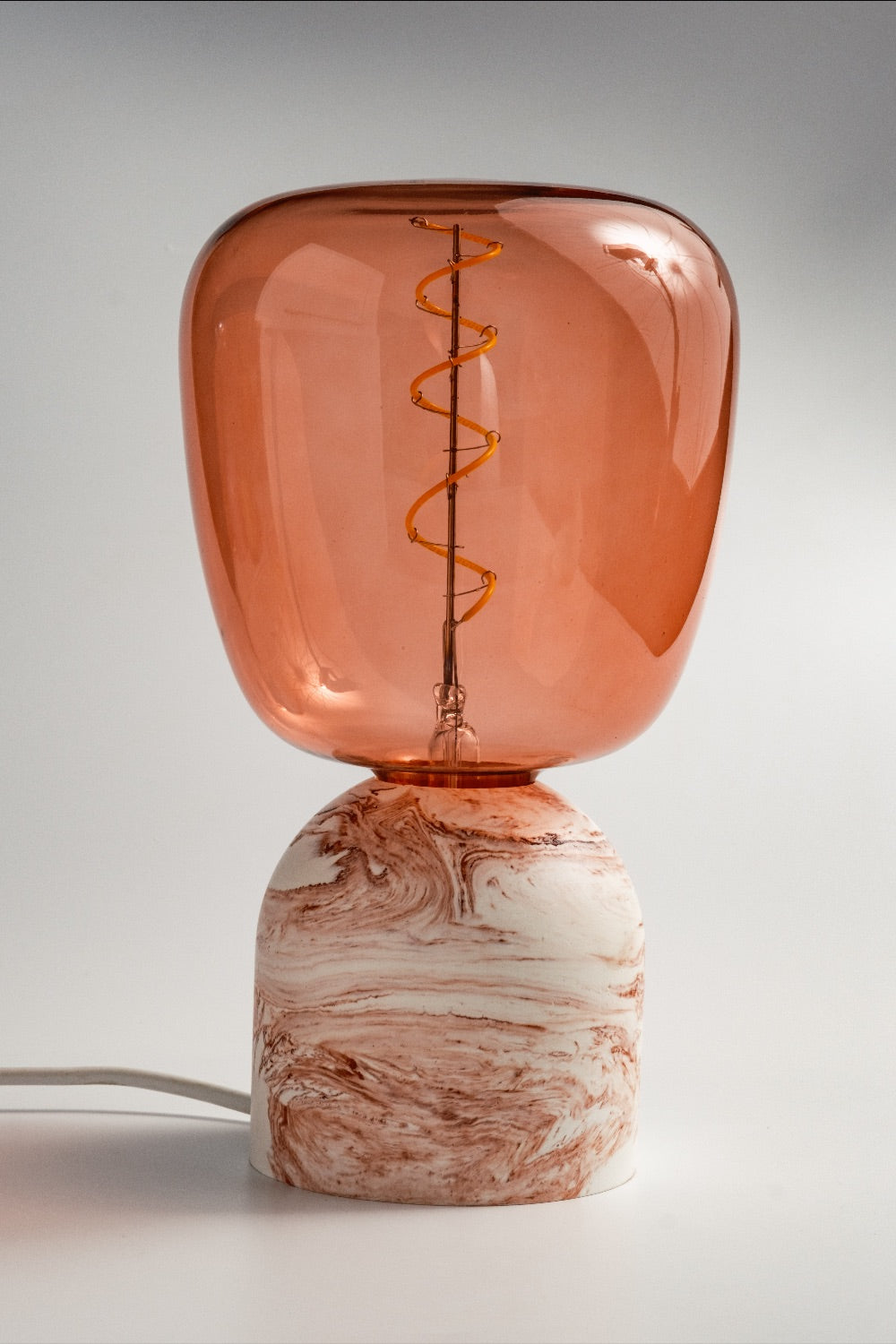 El yapımı beton kaide ve özel renkte seçilmiş cam şapka ile tasarlanmış masa lambası