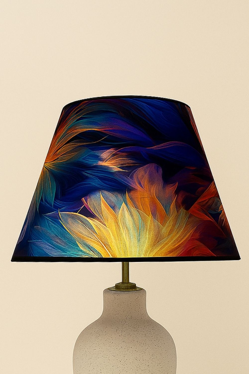 Flamara Şapka, zengin renk katmanları ve çiçeksi formlarıyla görsel bir şölen sunar.Sarı, turuncu, gece mavisi ve mor tonların iç içe geçtiği yüzeyi, ışıkla buluştuğunda güçlü bir atmosfer yaratır.Karanlık bir fonda yanan bir çiçeği andıran bu desen, hem romantik hem de dramatik dekorasyonlara uyum sağlar.