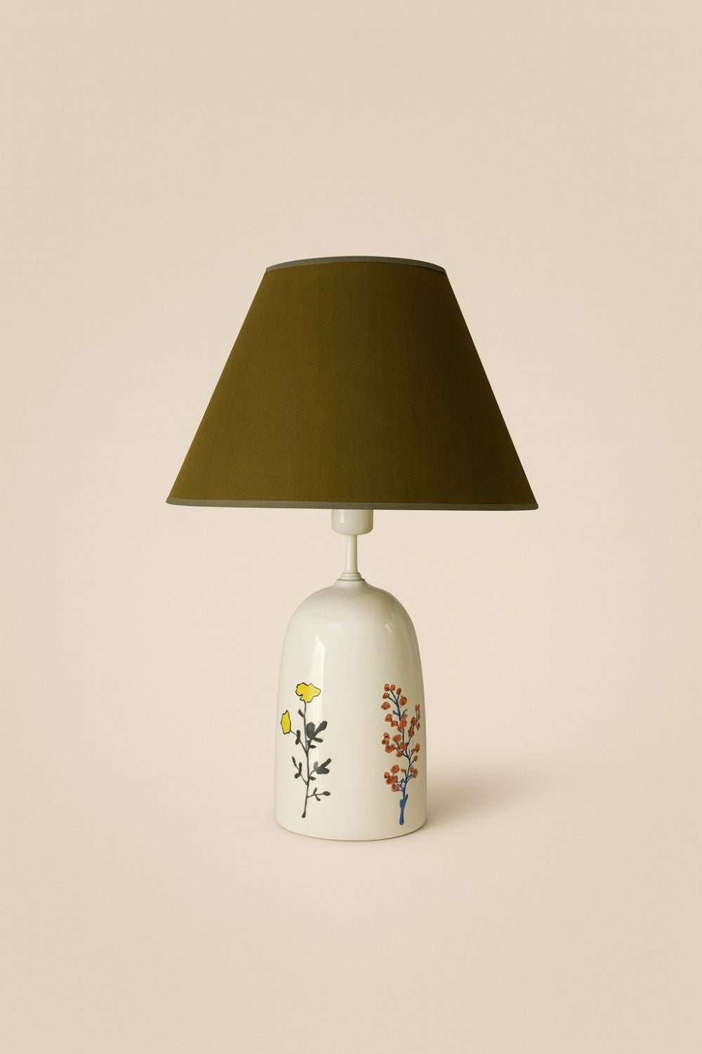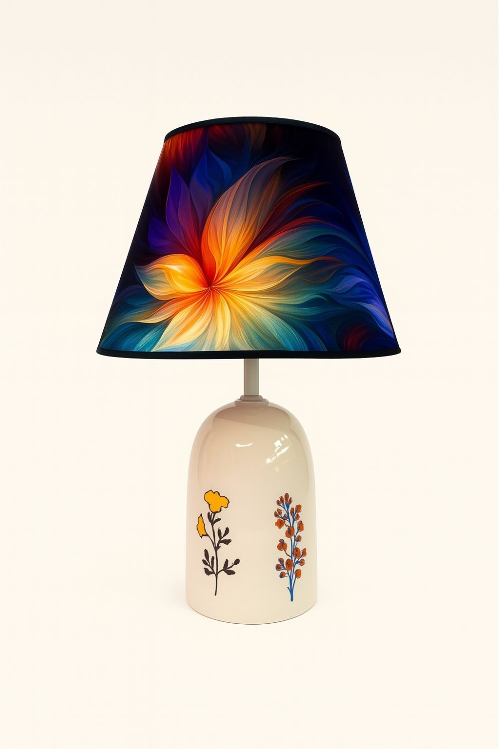 Pera Abajur, seramik gövdesindeki sade çiçek desenleriyle doğal bir sadelik sunarken, başlığındaki göz alıcı çiçek formuyla adeta sanatsal bir patlama yaratır. Gövde üzerindeki sarı ve pas tonlarındaki çiçek illüstrasyonları, doğaya saygılı bir estetik taşırken; başlıktaki dijital baskı, ışıkla birlikte mekânda şiirsel bir etki oluşturur.
