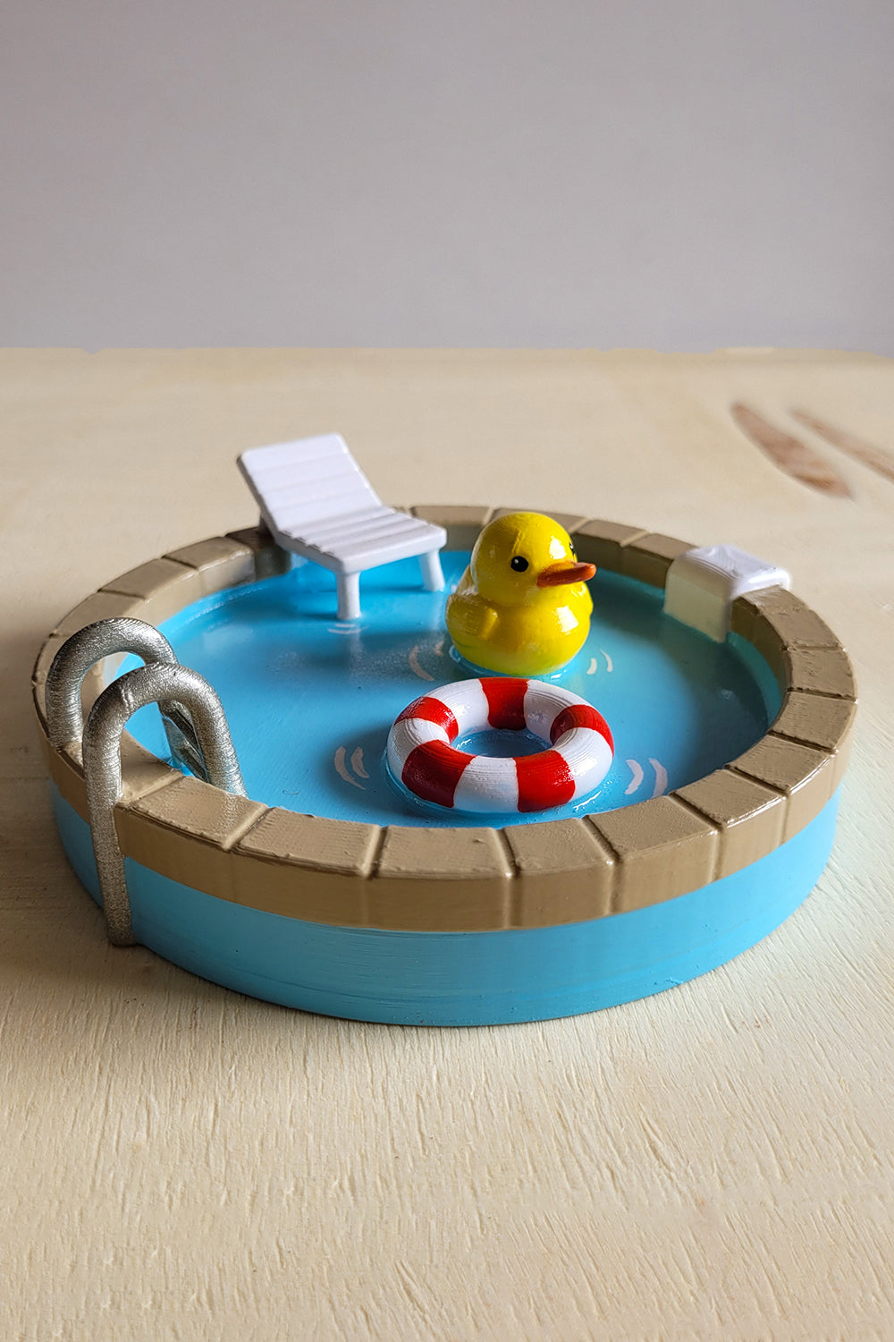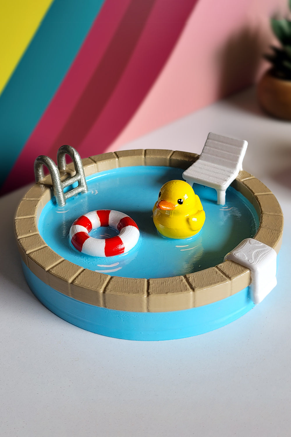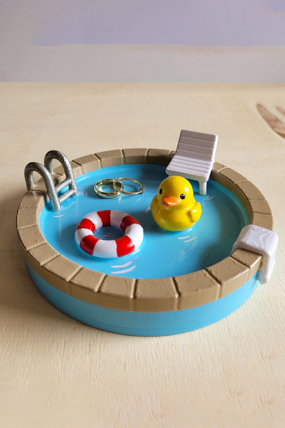 Bu eğlenceli mini havuz formundaki takılık, yüzme temalı detayları ve renkli objeleriyle hem yaz enerjisini yansıtıyor hem de mücevherlerini şık bir şekilde düzenliyor.