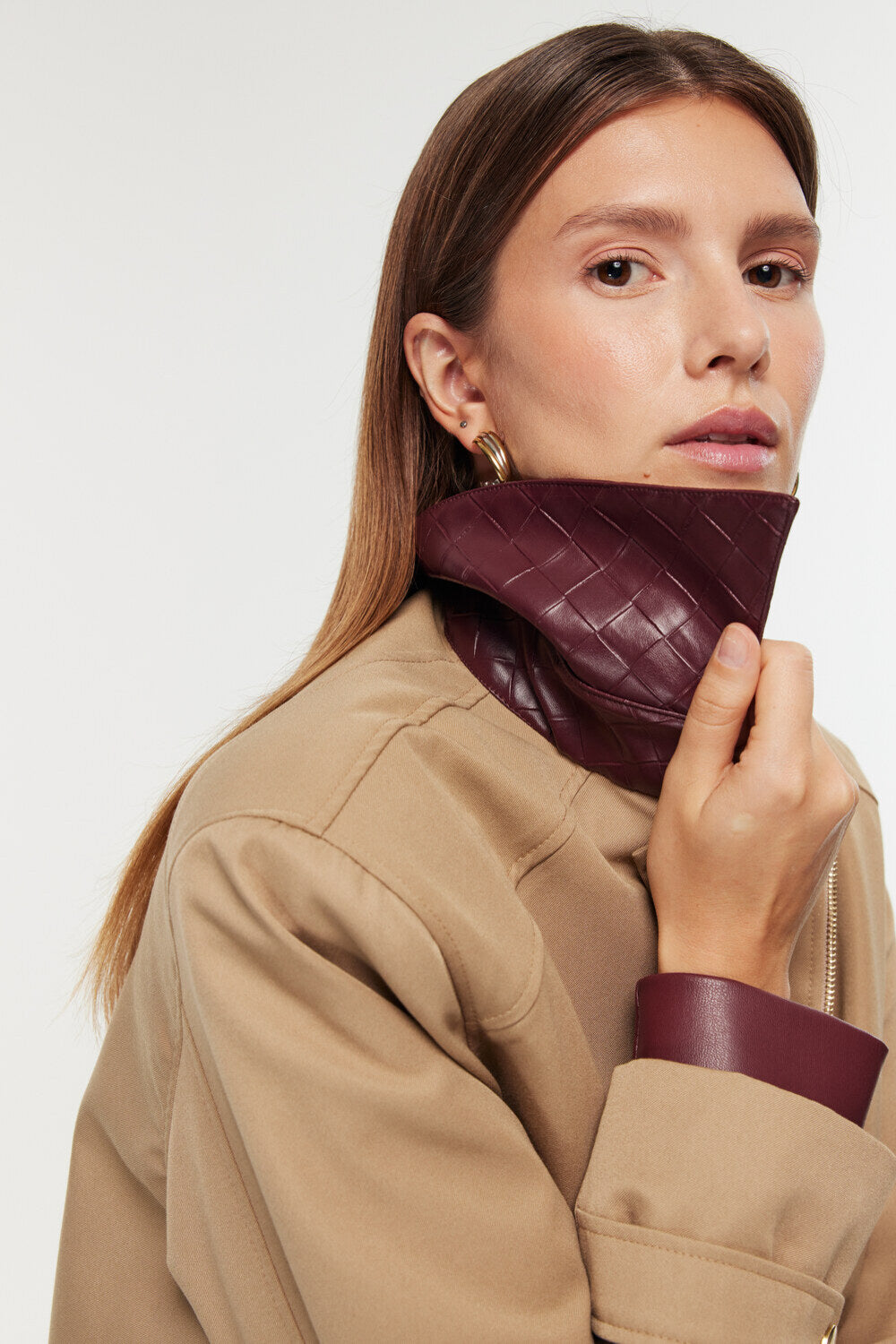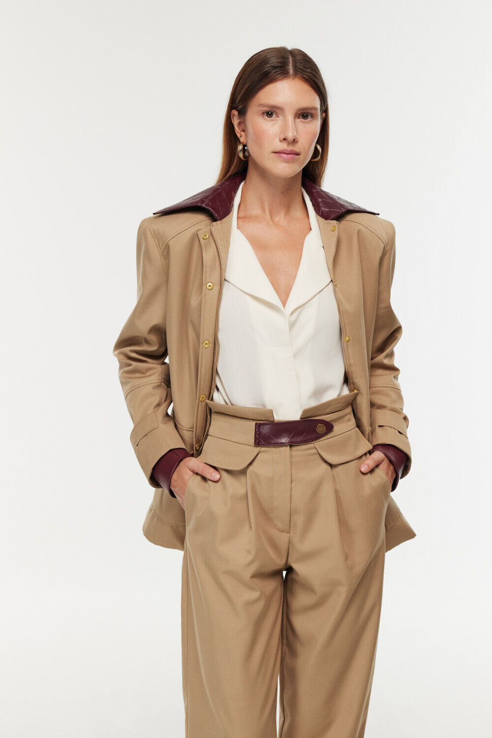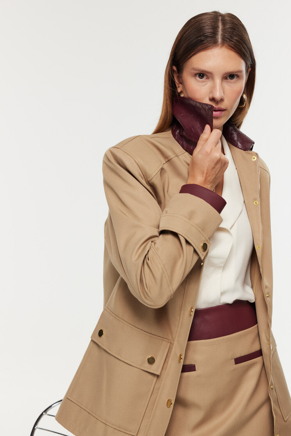 Ürün Bilgisi: Gabardin ve deri garni ceket. Bol kesim, gold çıtçıt ve fermuar kapamalı