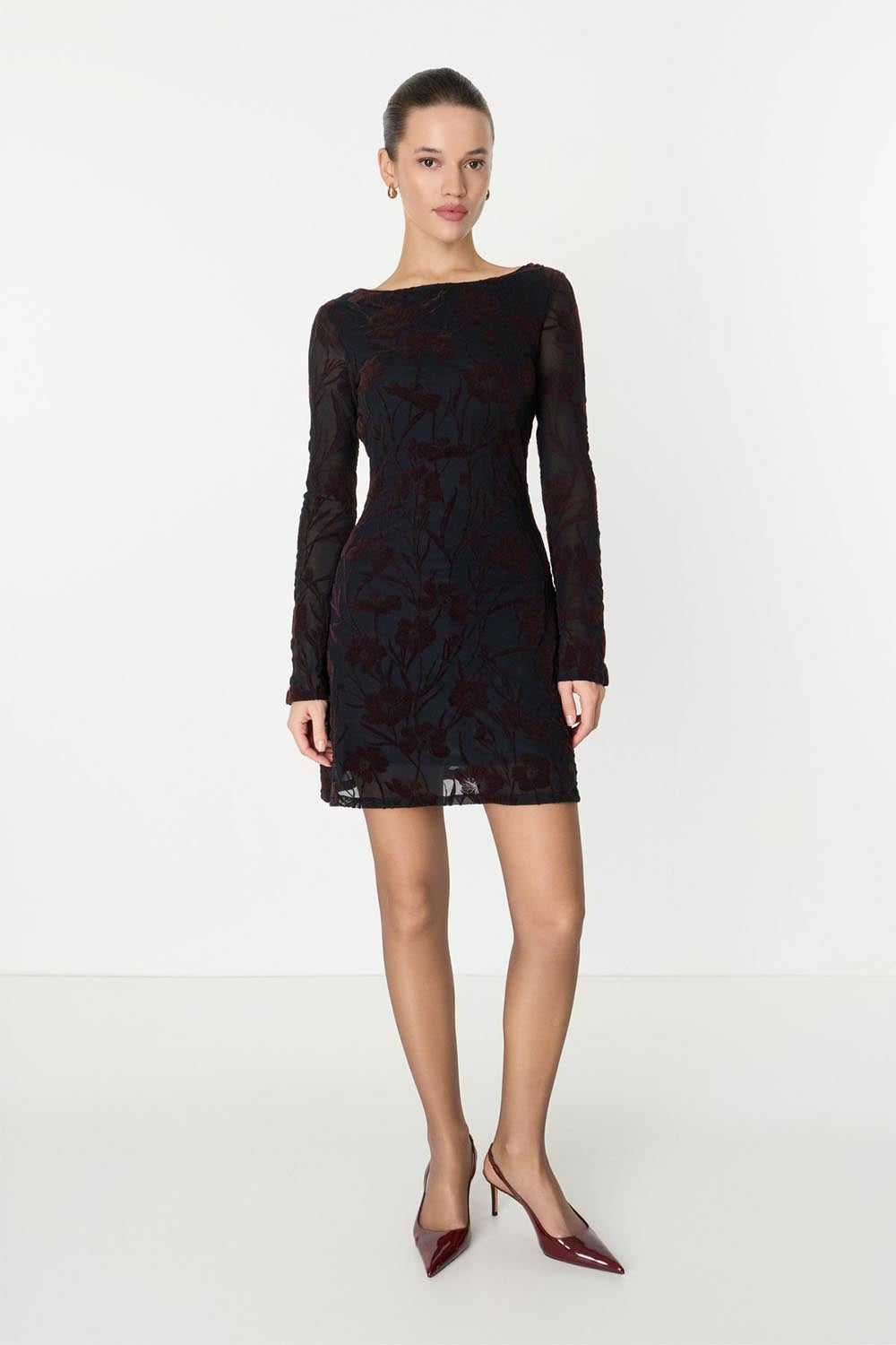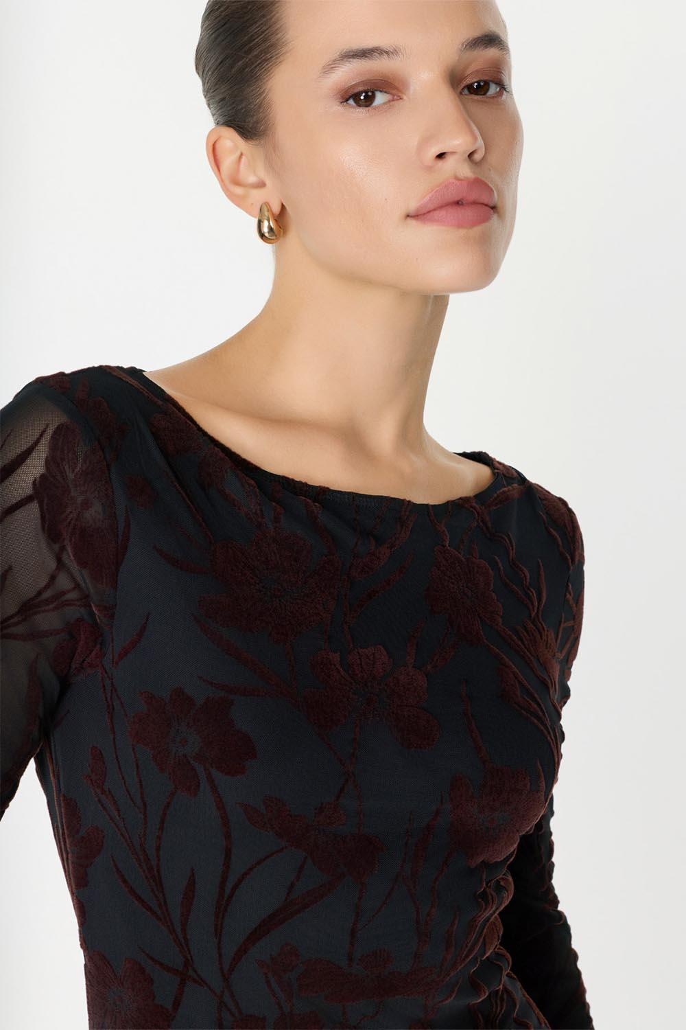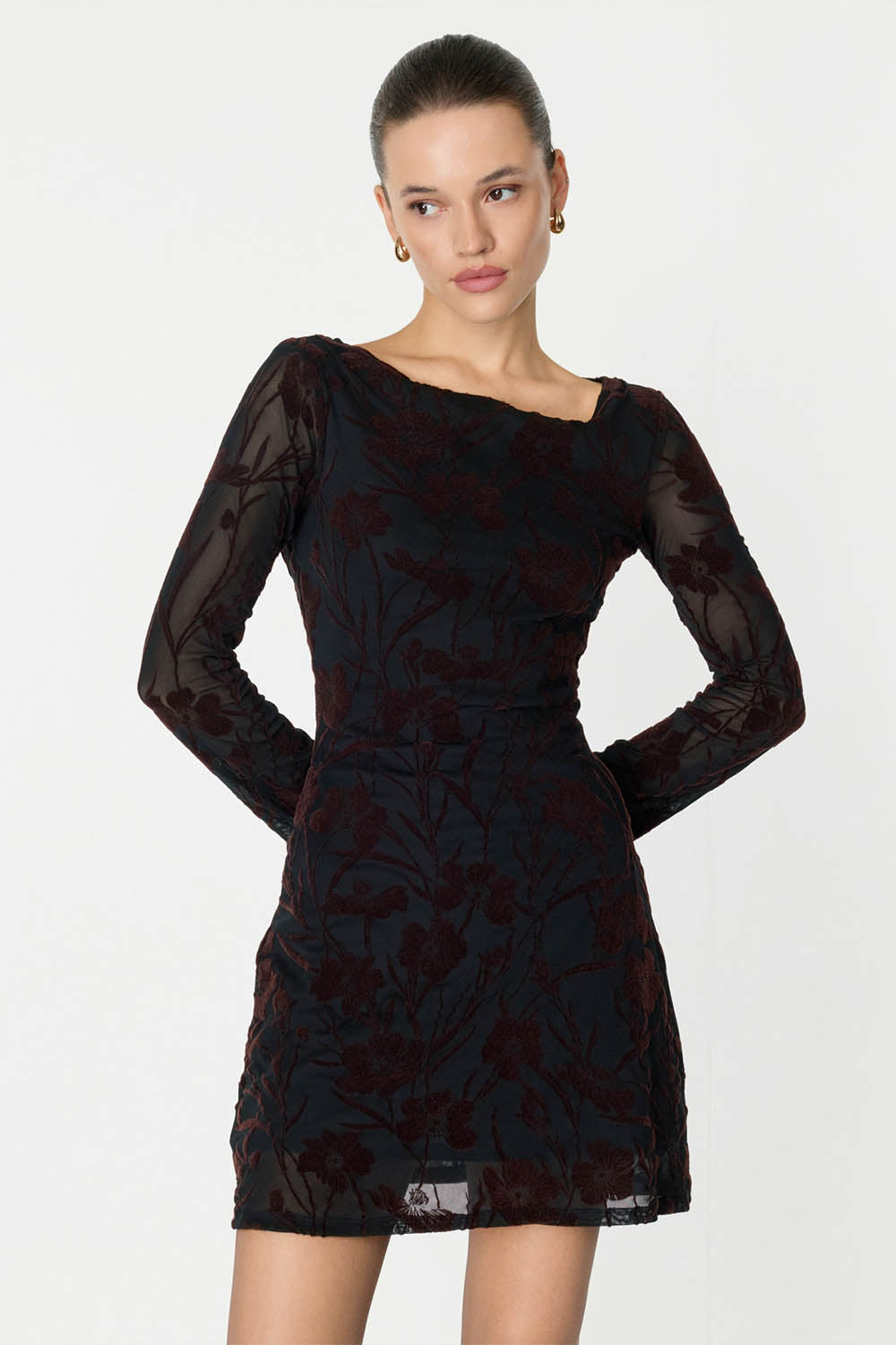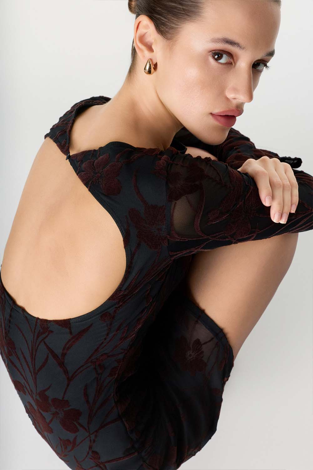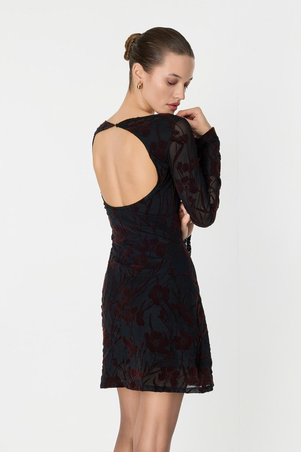 Sırt Dekolteli Çiçek Desenli Kahverengi Elbise