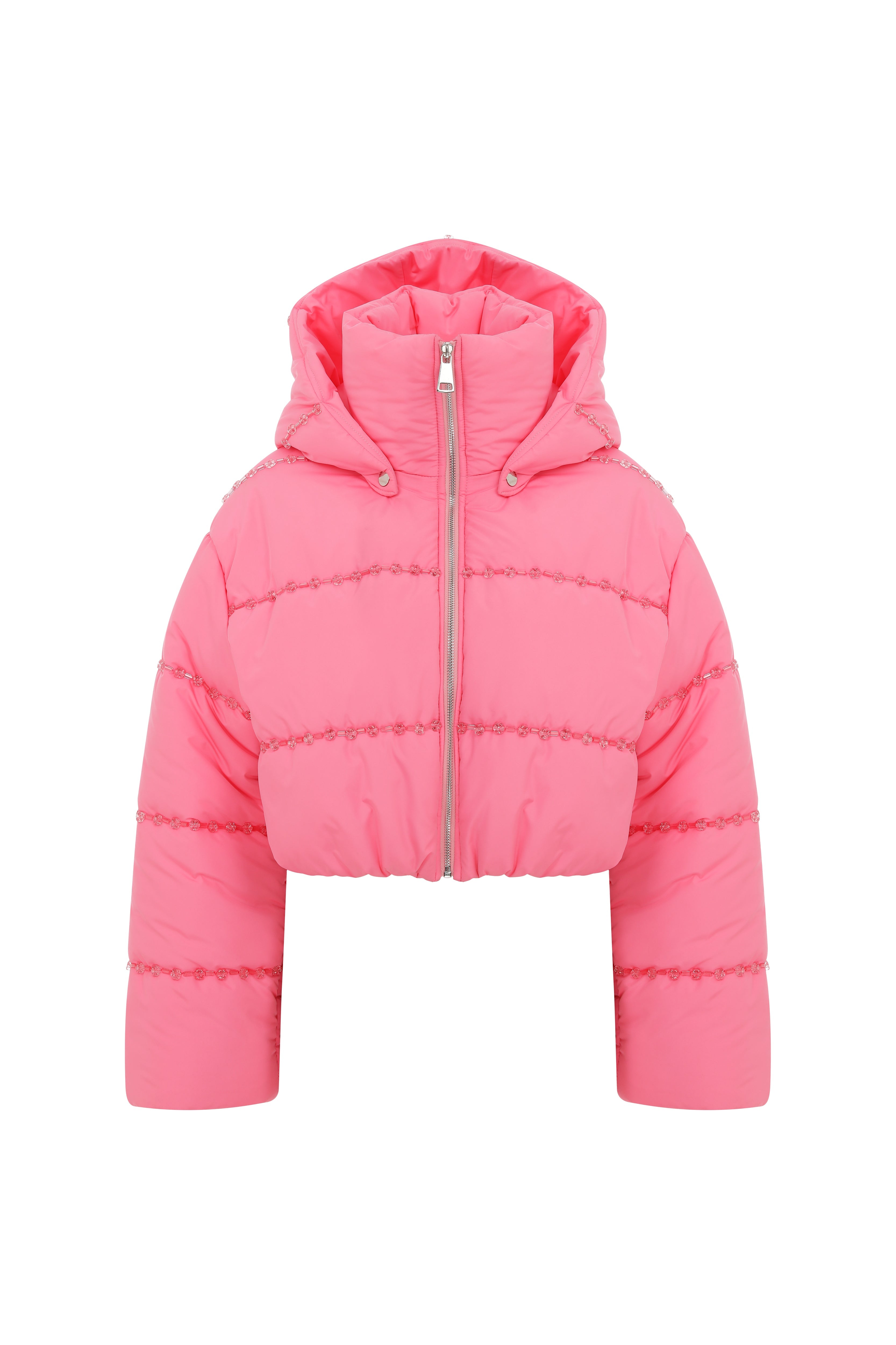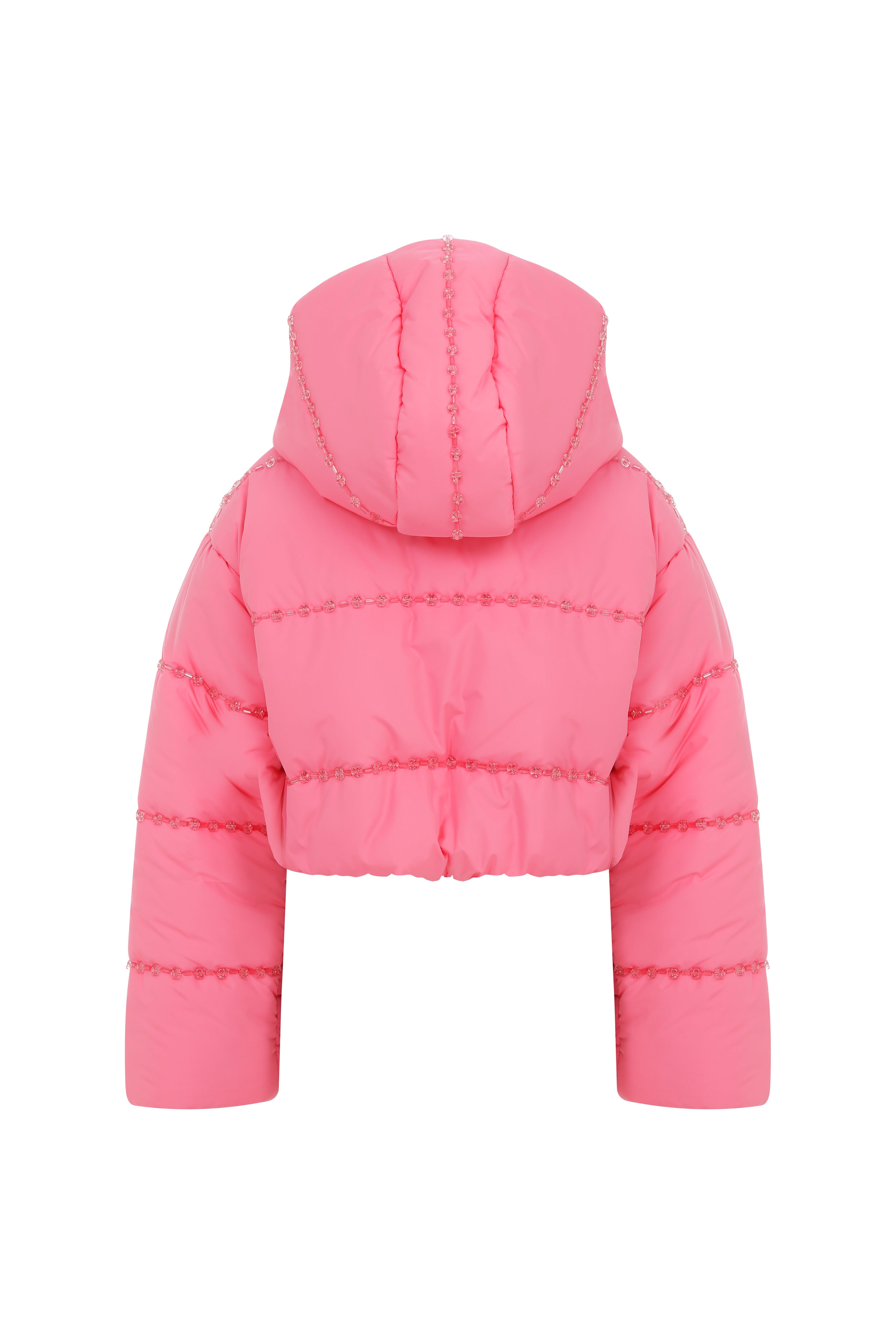 -Pembe Koleksiyona özel boncuk işlemeli crop şişme mont.
