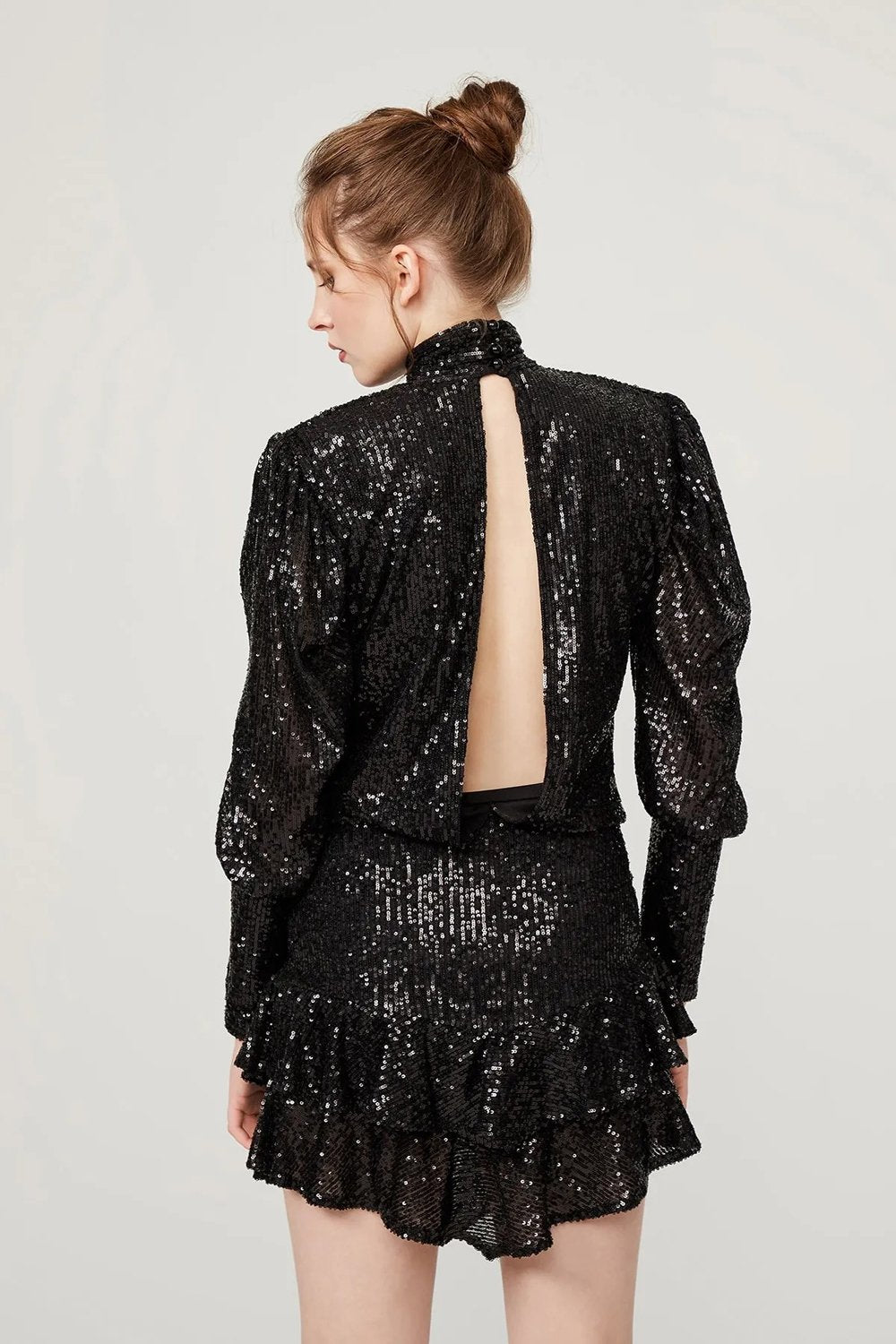 Siyah Payetli Sırt Dekolteli Mini Elbise