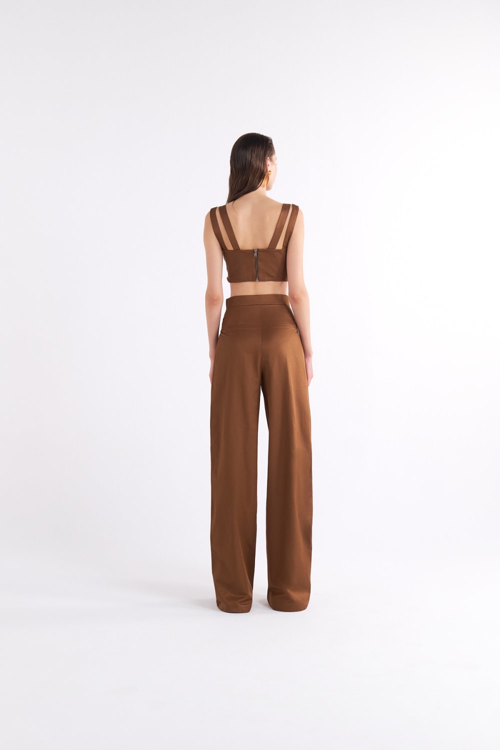 Kahverengi, yüksek belli, geniş paça pantolon.