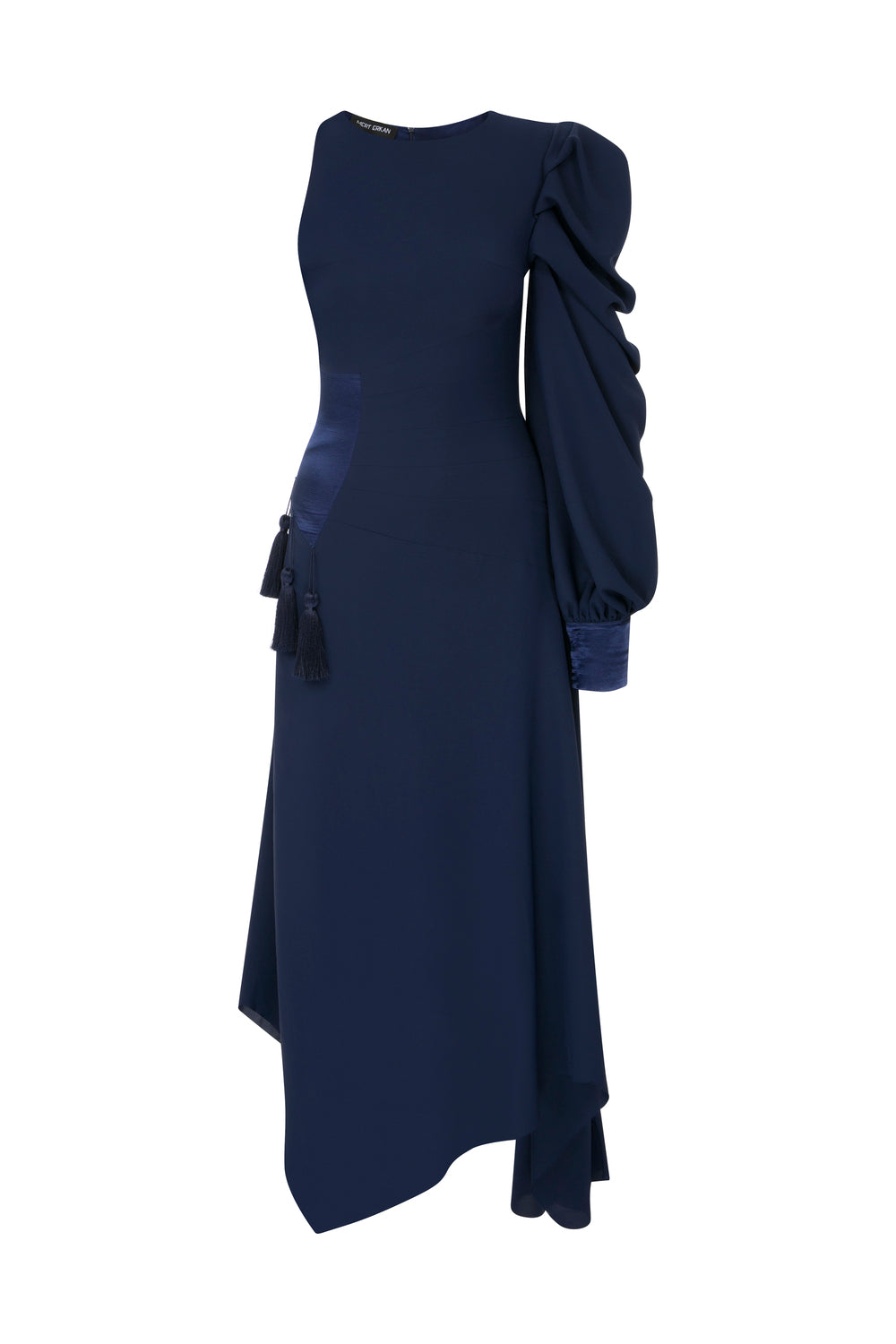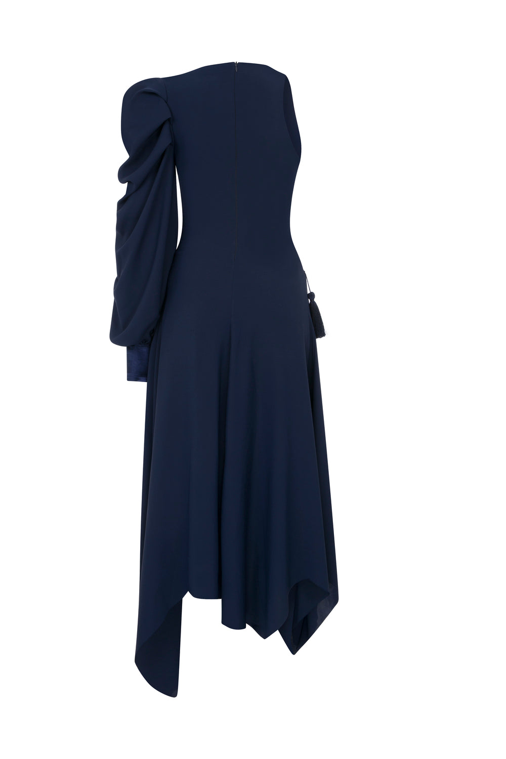 Asimetrik Etekli & Balon Kollu Lacivert Şık Davet Elbisesi