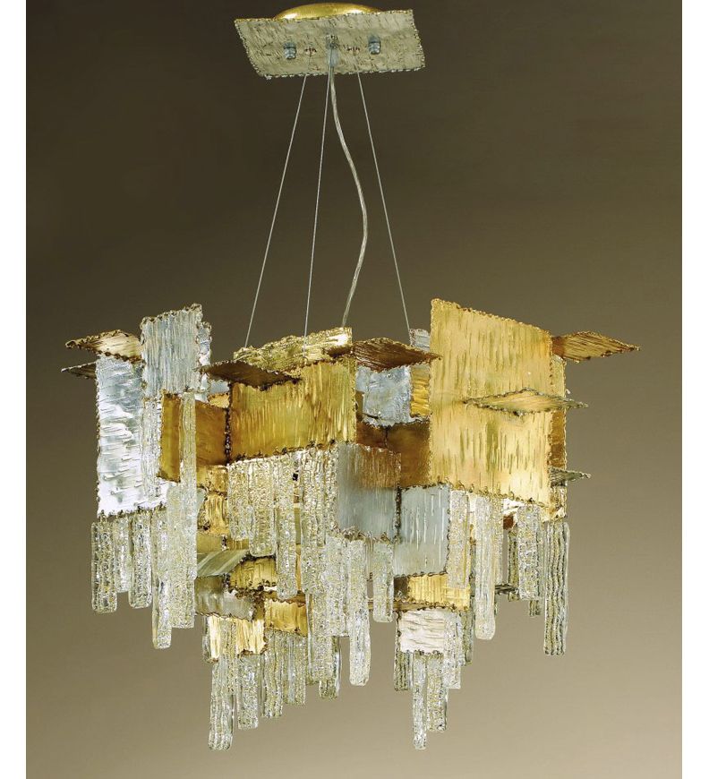 E. De Girardi tarafından tasarlanan ve İtalya’da City koleksiyonunun bir parçası olarak üretilen bu sarkıt aydınlatma, kare ve dikdörtgen metal levhaların el işçiliğiyle şekillendirilip altın ve gümüş varakla süslenmesiyle oluşturulmuştur. Modern ve ilgi çekici bir stile sahip olan bu avize, çerçeveyi güçlendiren cam eklentileri sayesinde ışık açıkken altı ampulün yarattığı dokusal ve oyunlu ışık yansımaları sunar.