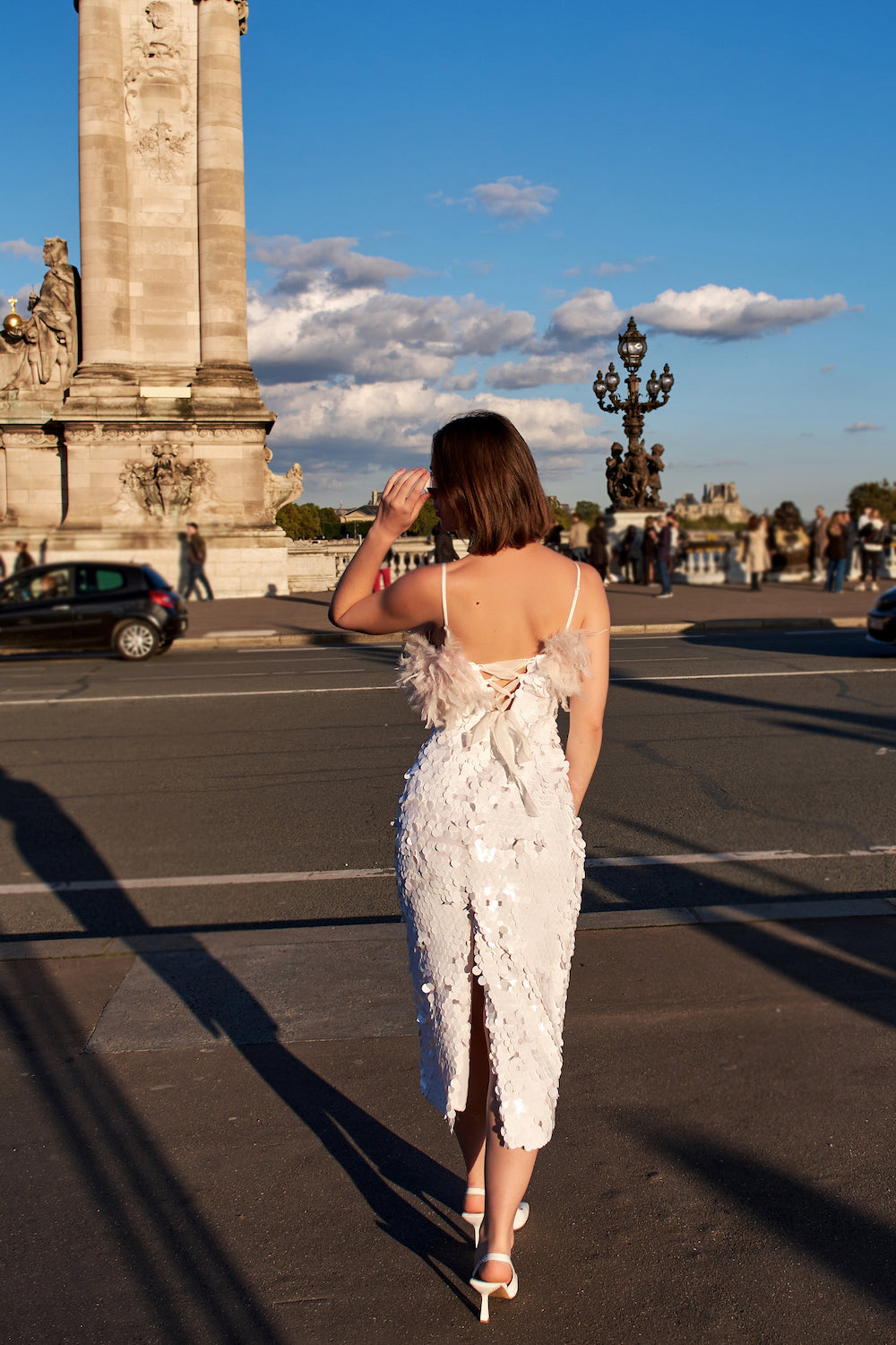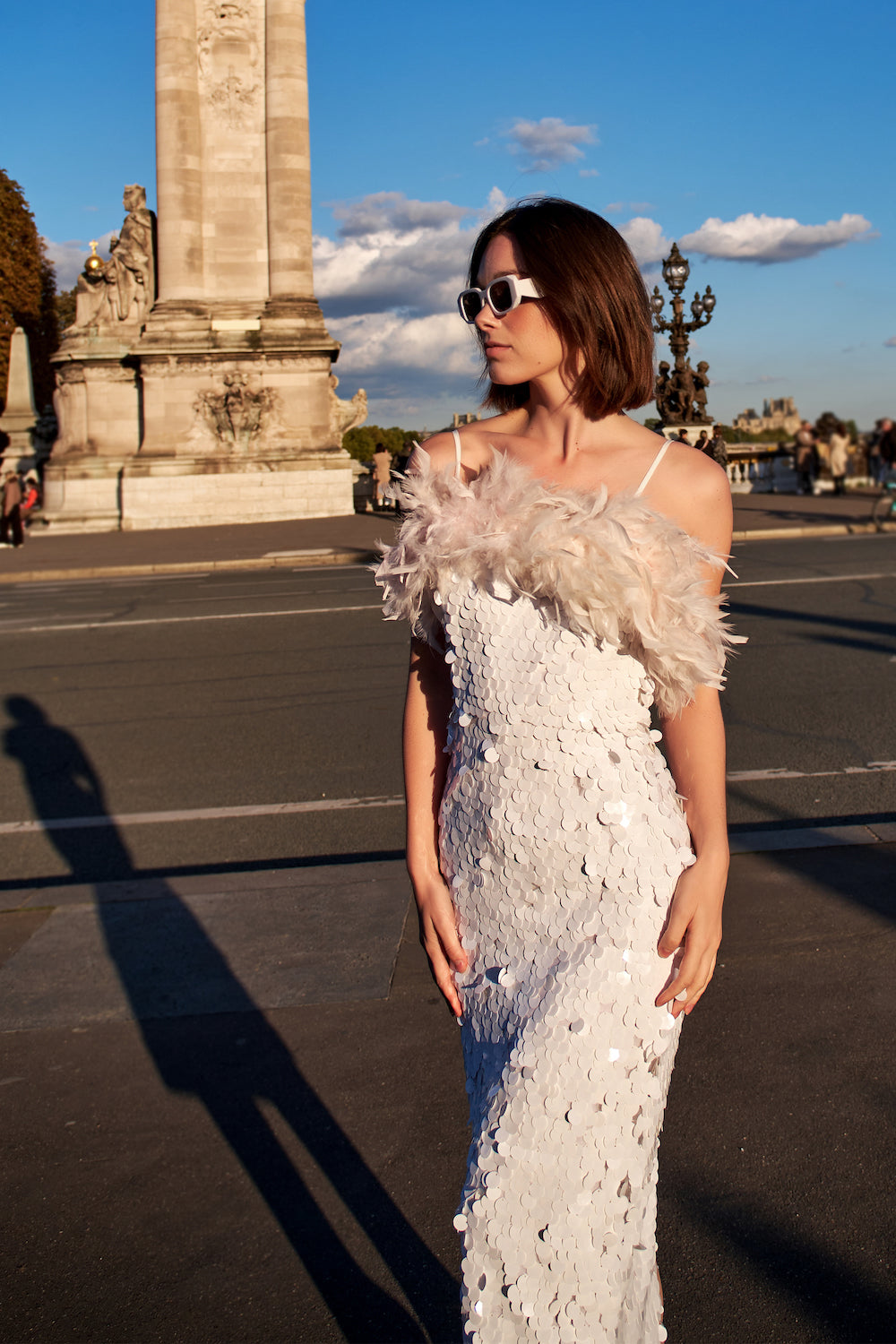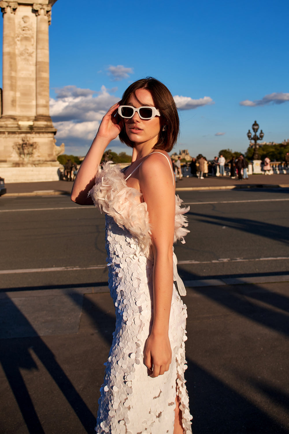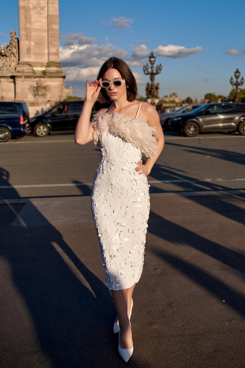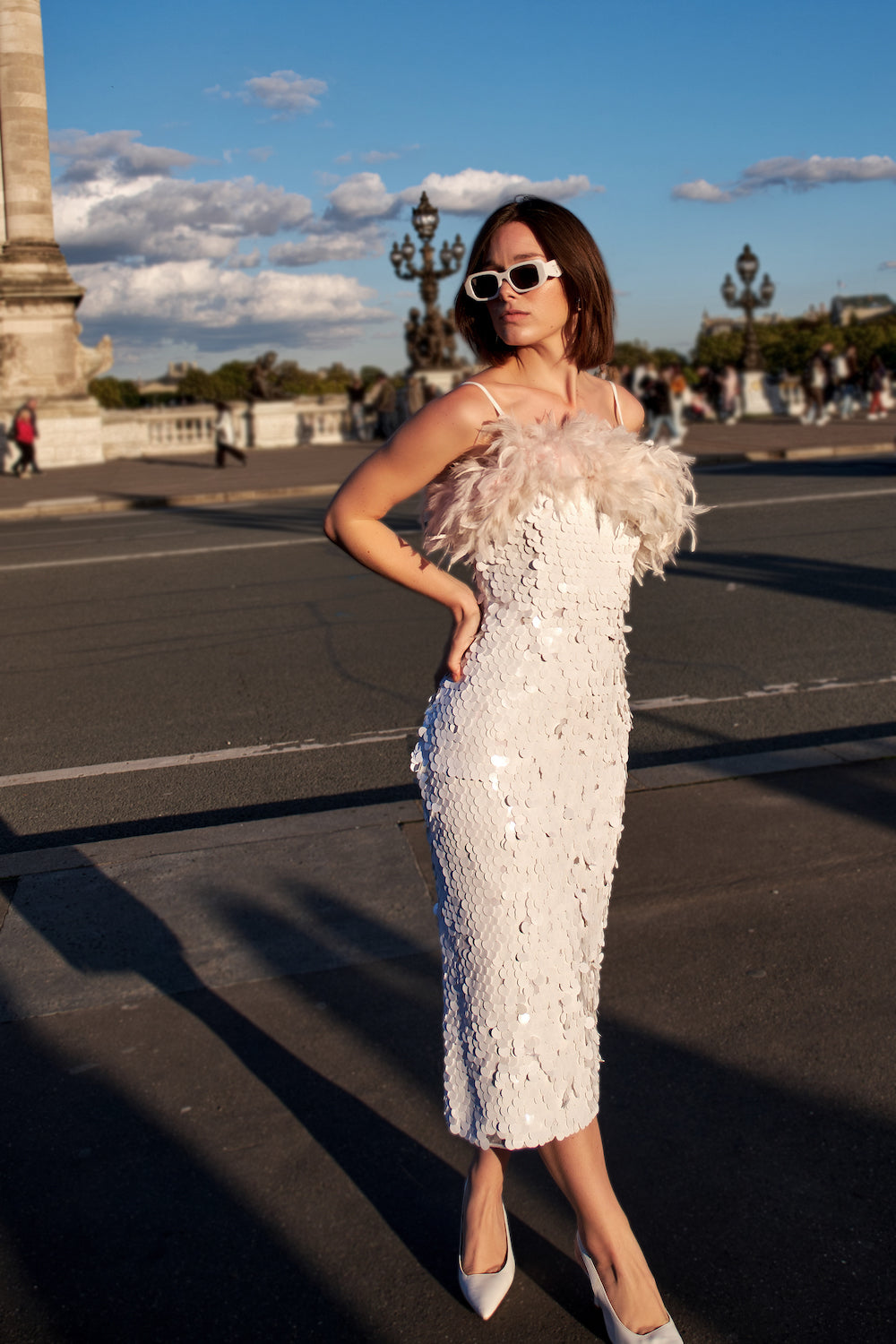 Beyaz Payetli Toz Pembe Boa Otrişli Midi Elbise Ariel