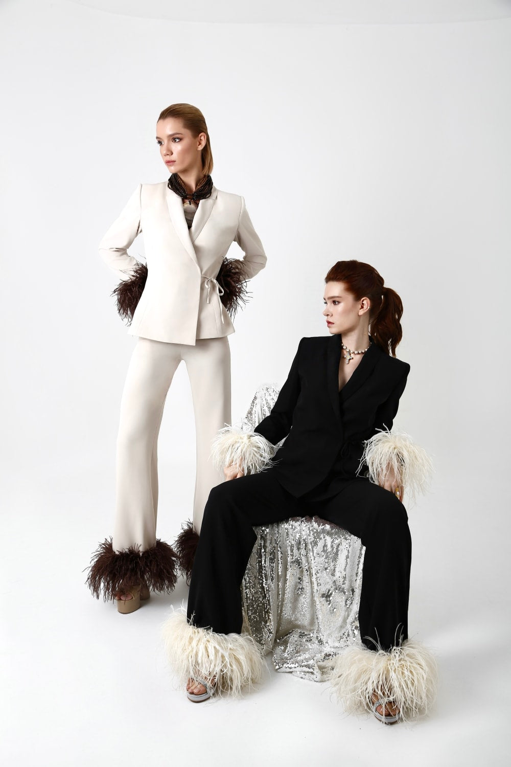 Bu şık palazzo kesim pantolon, paça uçlarına zarifçe eklenen lüks devekuşu tüyleriyle (otriş) cesaret ve zarafeti bir araya getiriyor. Düşük bel formu modern bir siluet sunarken, tüy detayları stilinize eğlenceli ve sofistike bir dokunuş katıyor. Şık bir blazer ile tamamlandığında opera geceleri veya gala davetleri için kusursuz bir görünüm yaratır.
