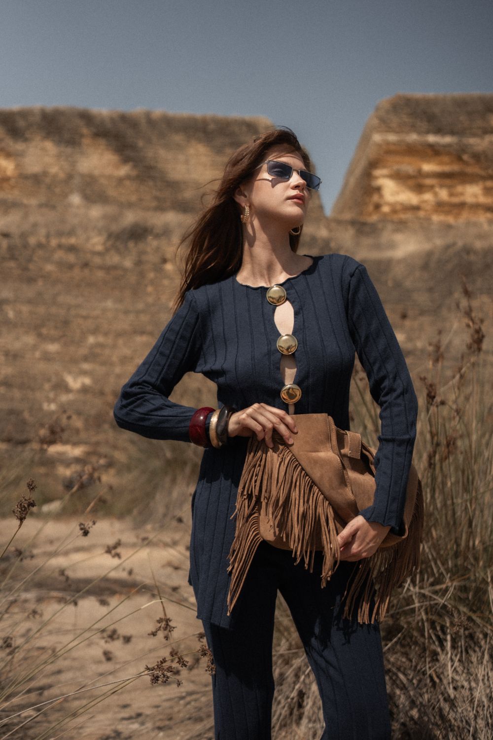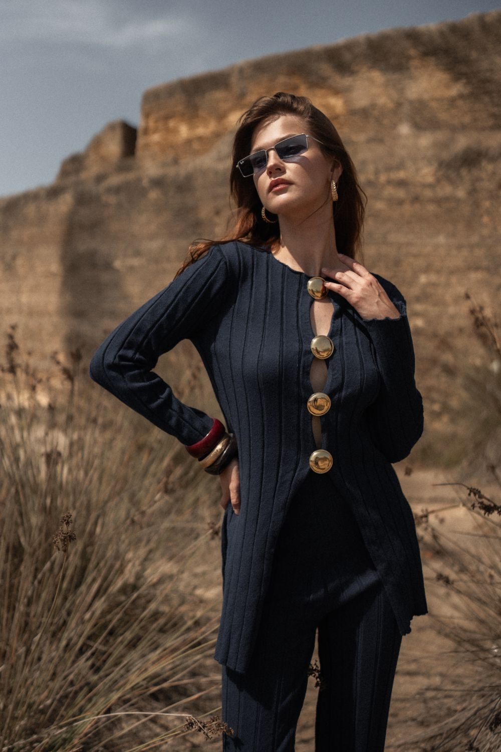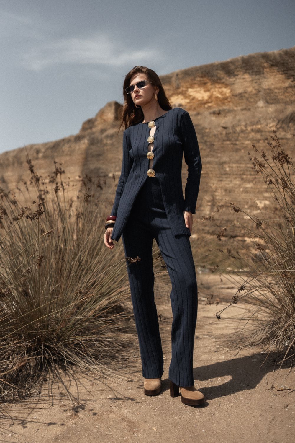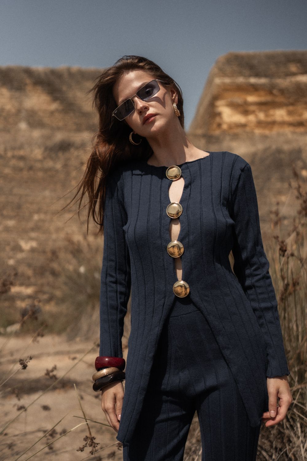 Altın Renkli Düğme Detaylı, Lacivert Triko Set