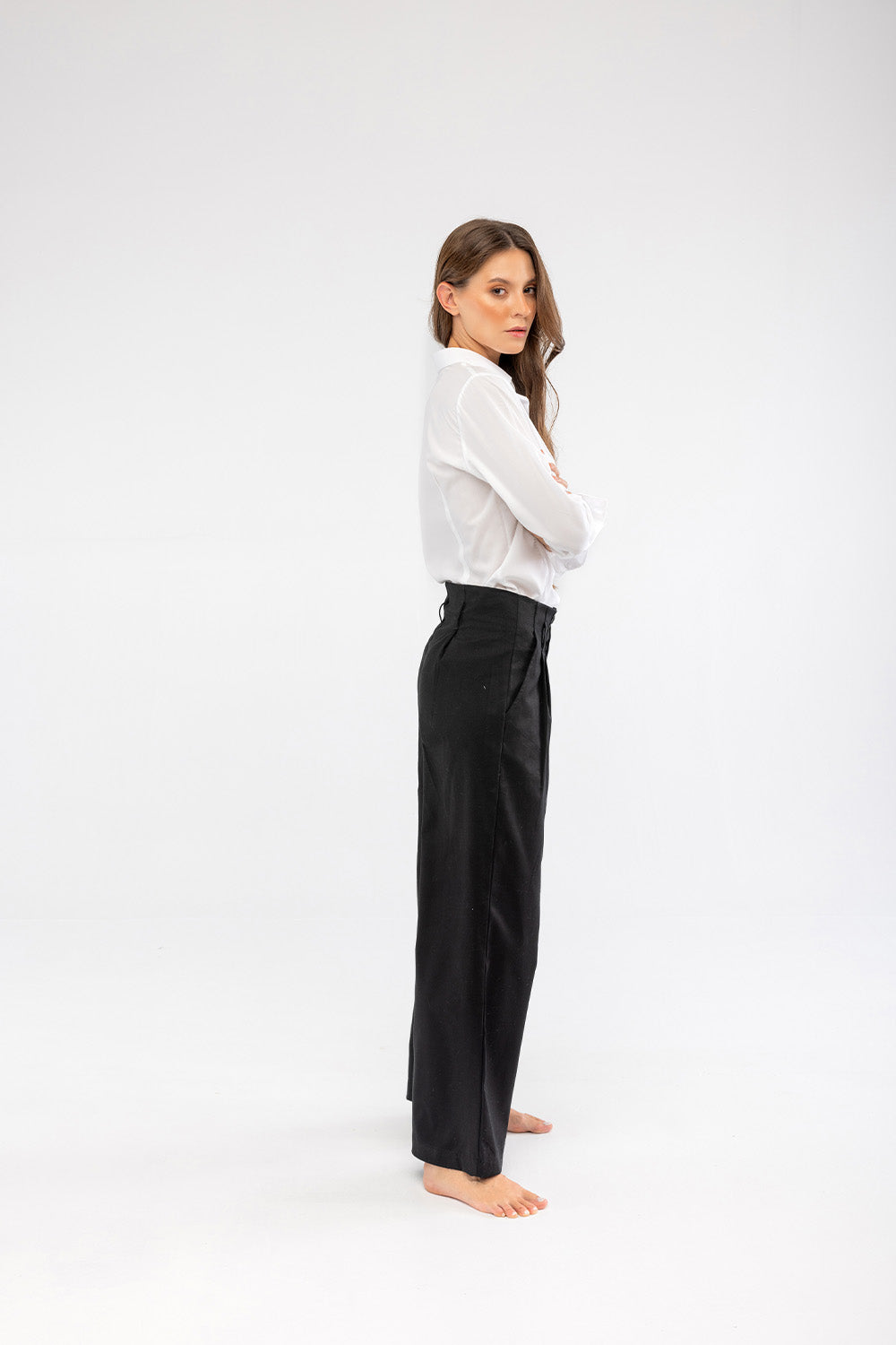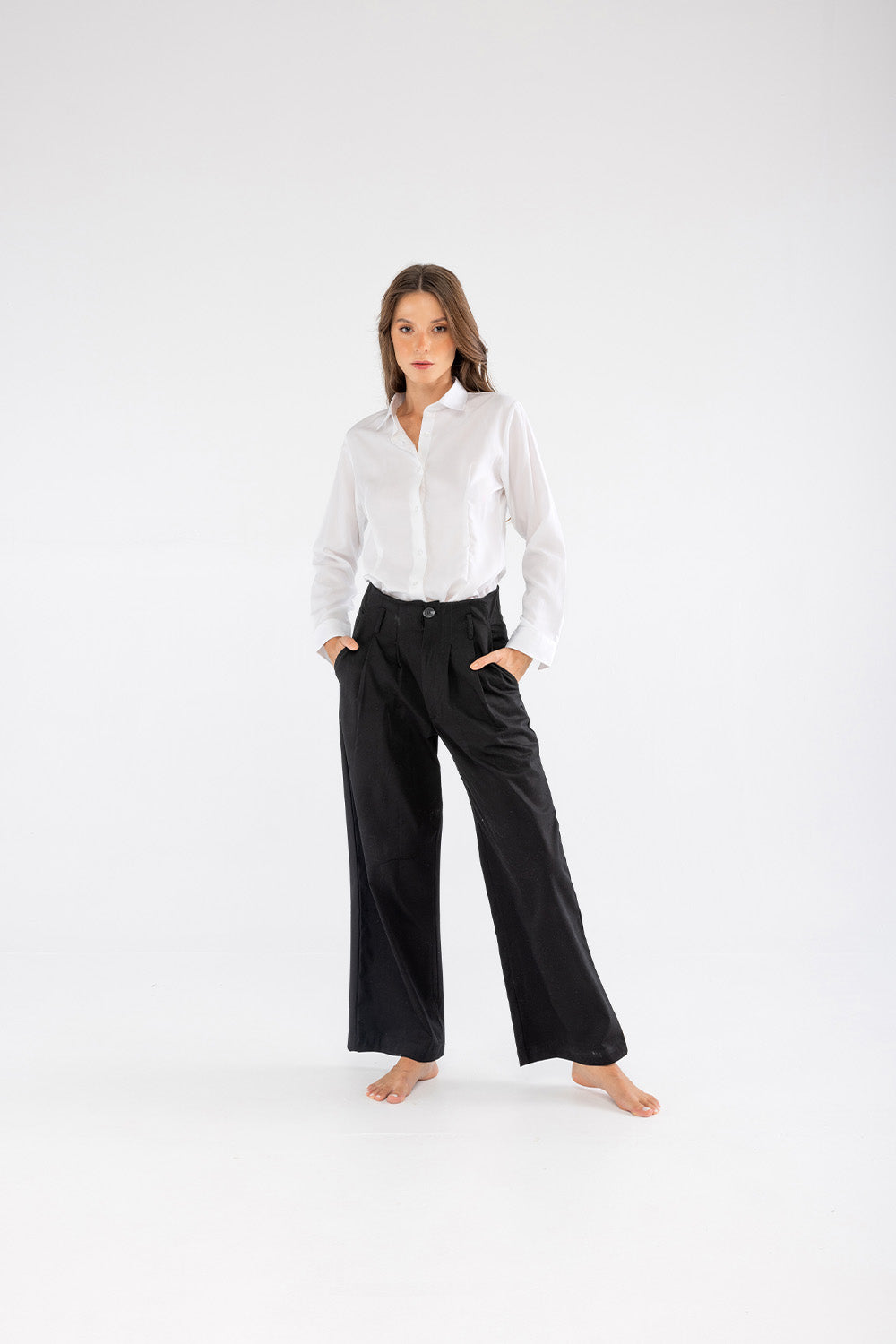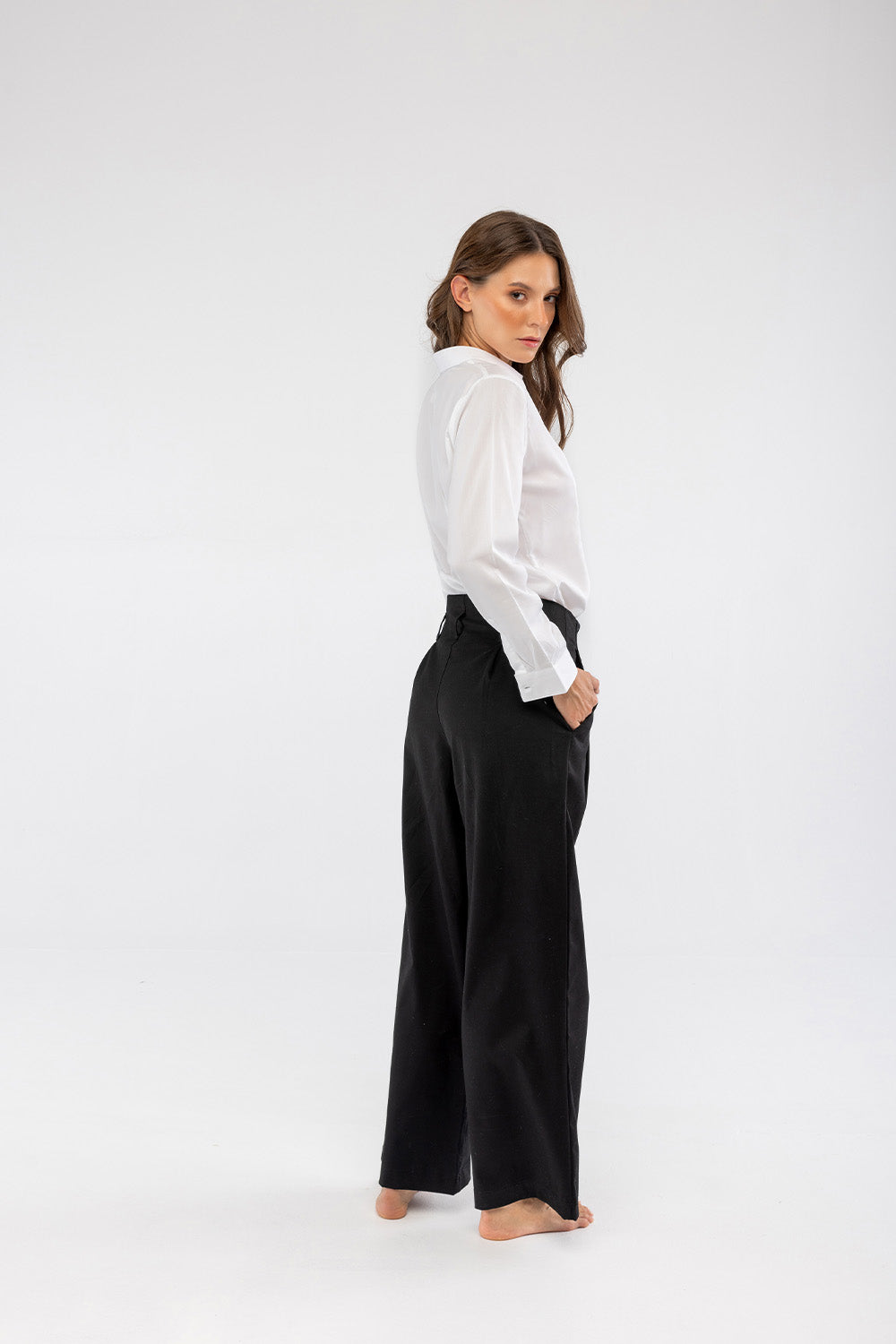 Siyah Geniş Paça Pileli Pamuk Kadın Palazzo Pantolon