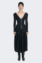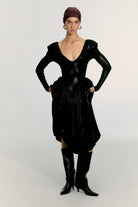Balon etekli uzun parlak siyah elbise. Esnek kumaşlıdır, omuzları vatkalı.