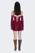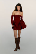 Kabarık etekli bordo elbise. Üst kısmı balenlidir.