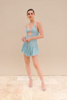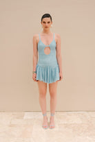 Esnek payet kumaşlı dekolteli kısa elbise.