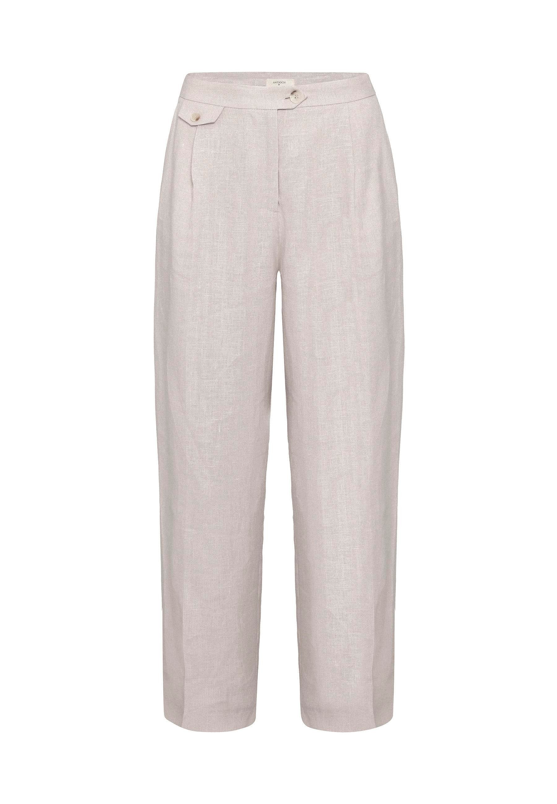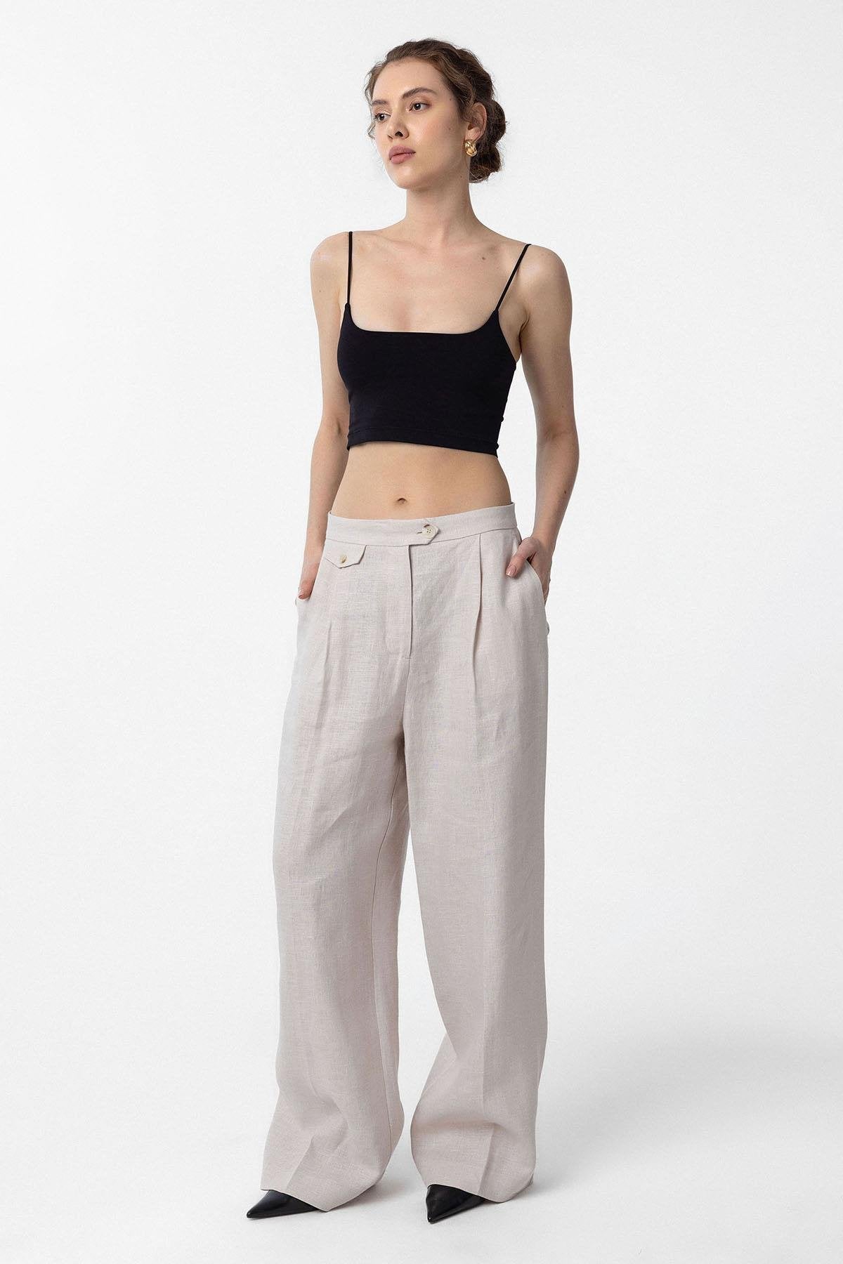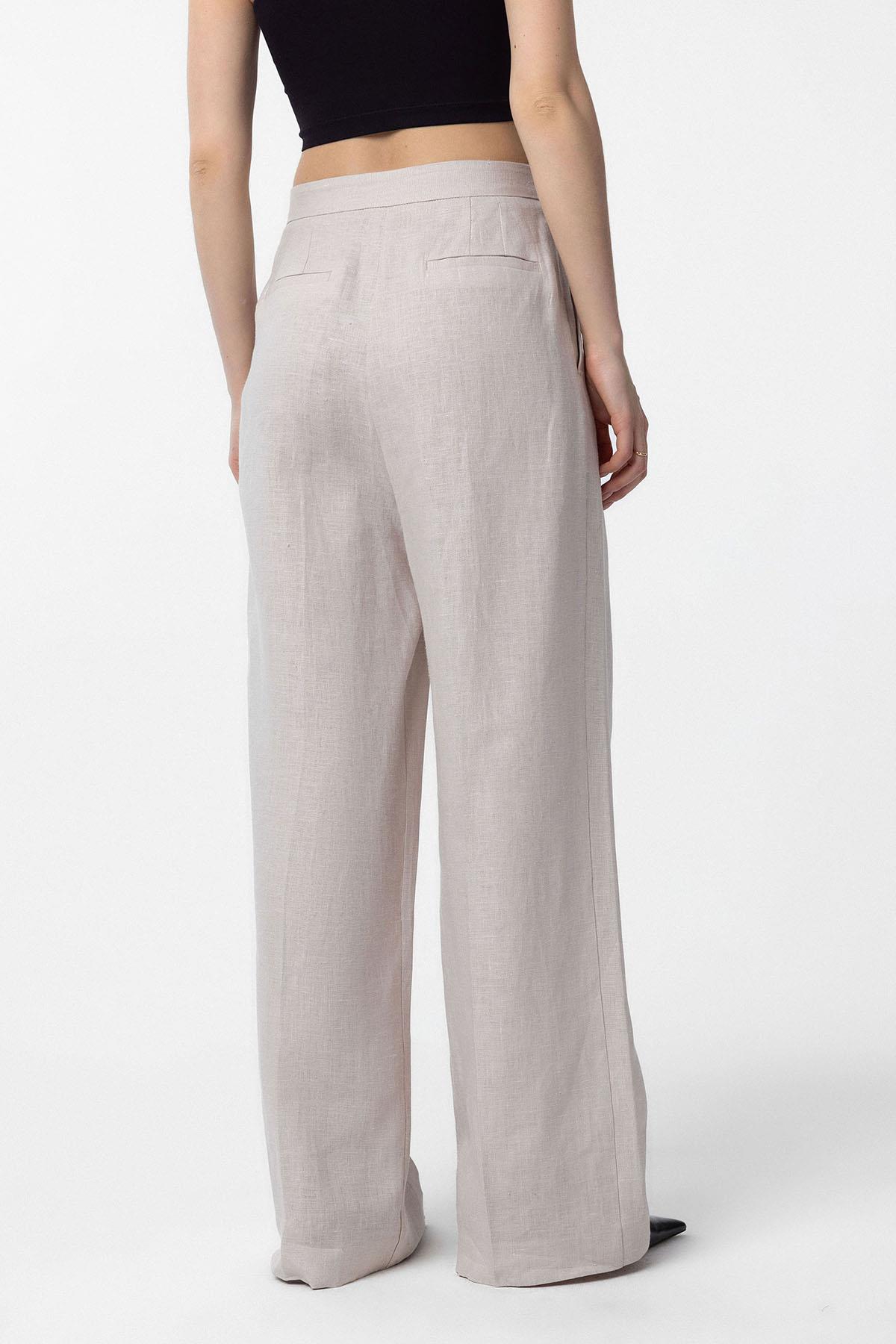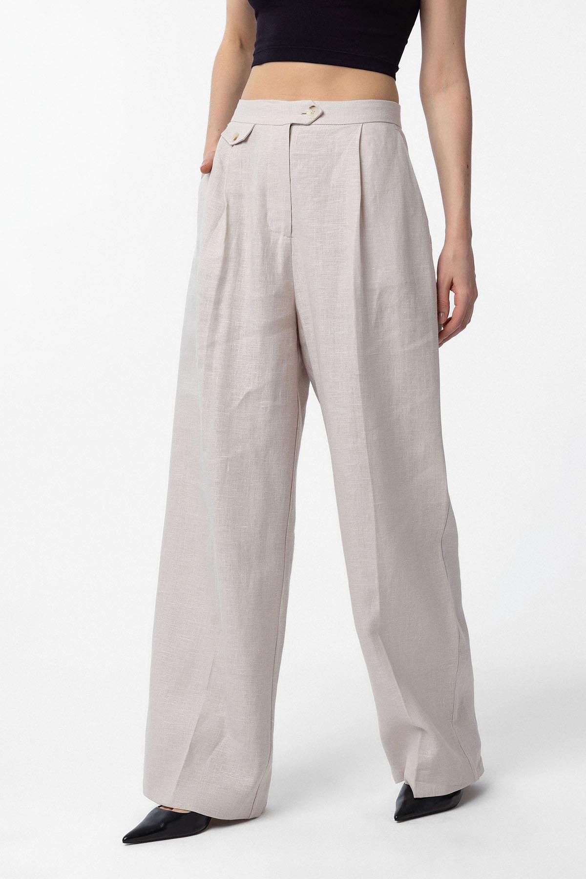 Bej 100% Keten Yüksek Bel Pilili Kadın Pantolon