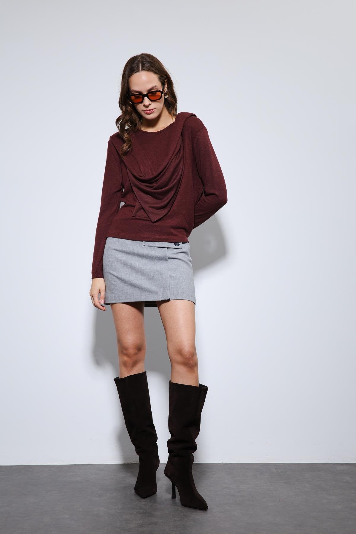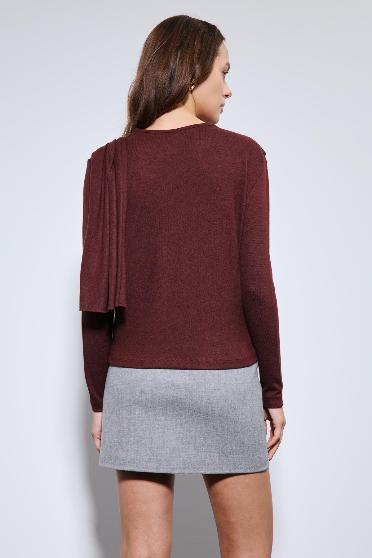 Bordo renkte, drapeli şal detaylı tasarıma sahip kadın top modelidir. Modern silüeti ve akıcı formu ile hem günlük hem de şık kombinlerde rahatlıkla kullanılabilir. Esnek yapısı sayesinde gün boyu konfor sunar. Türkiye’de üretilmiştir.