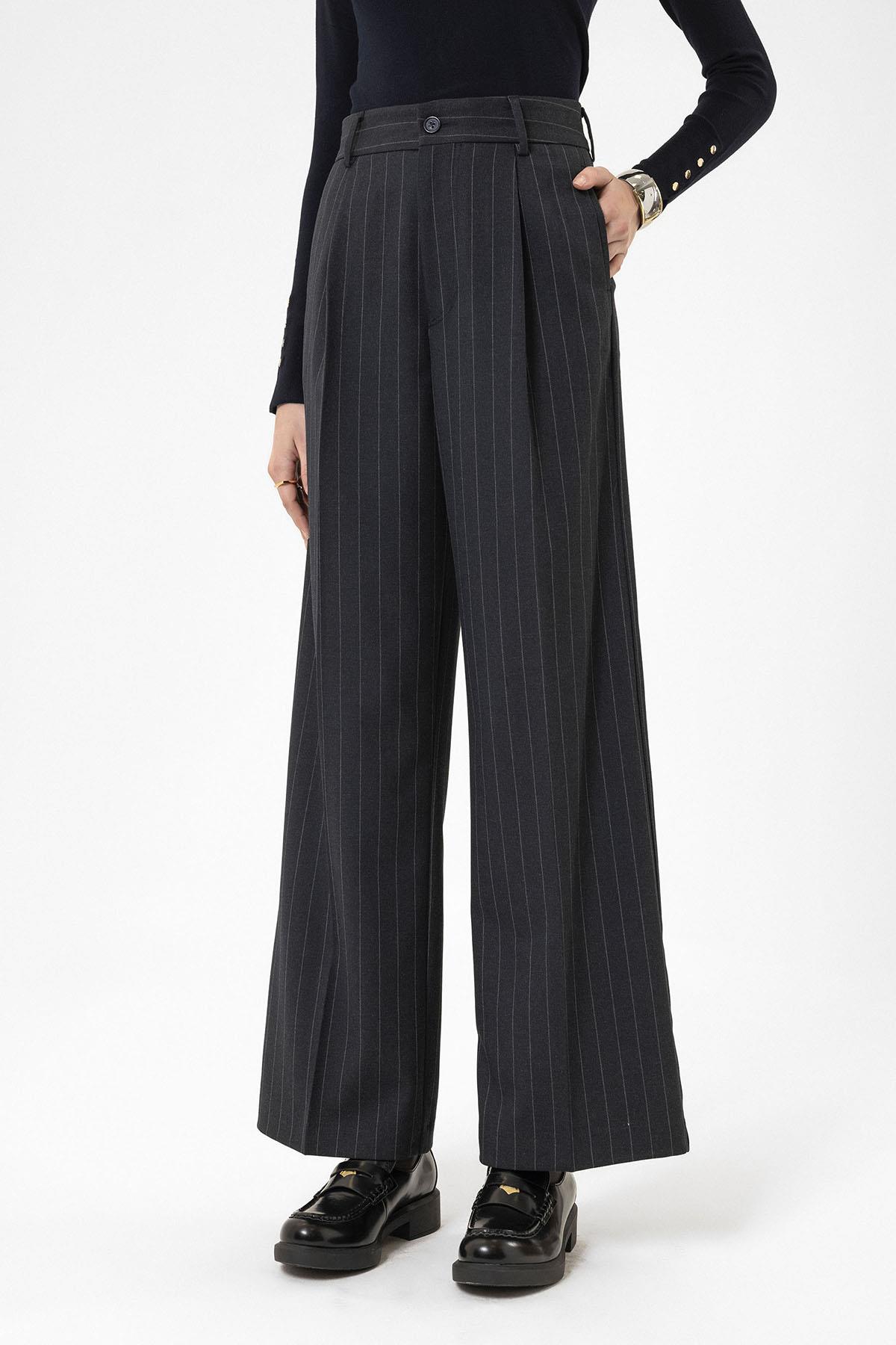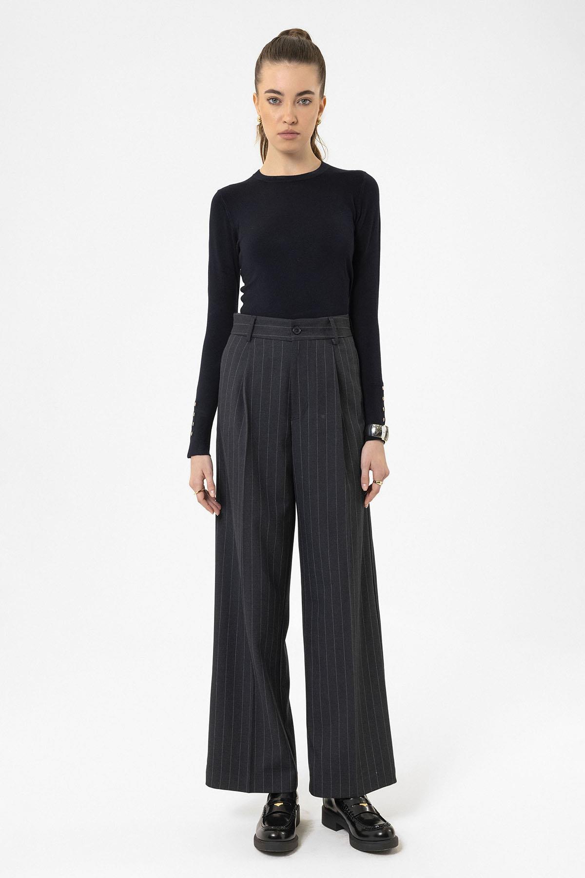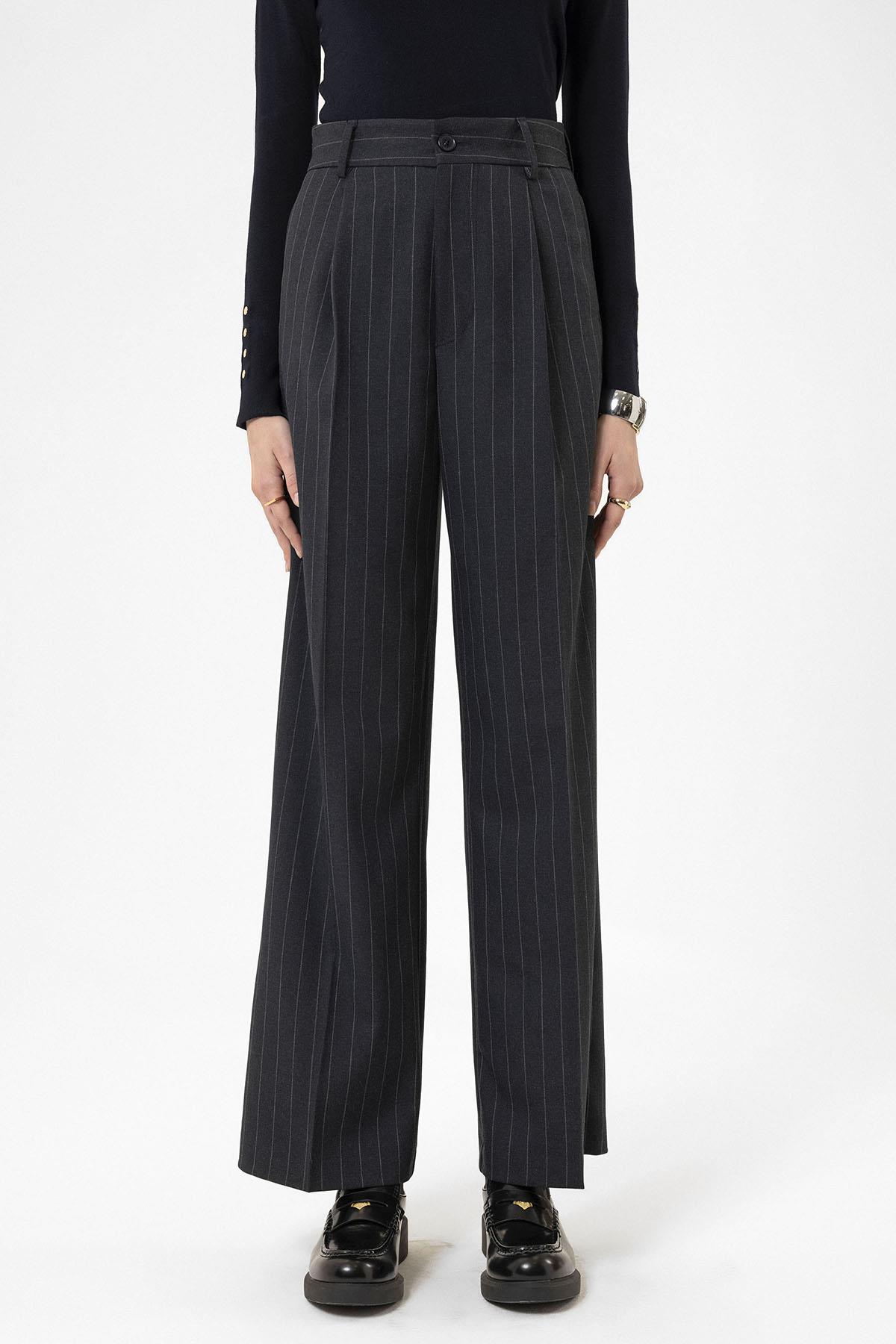 Lacivert Kadın Yüksek Bel Pileli Çizgili Pantolon