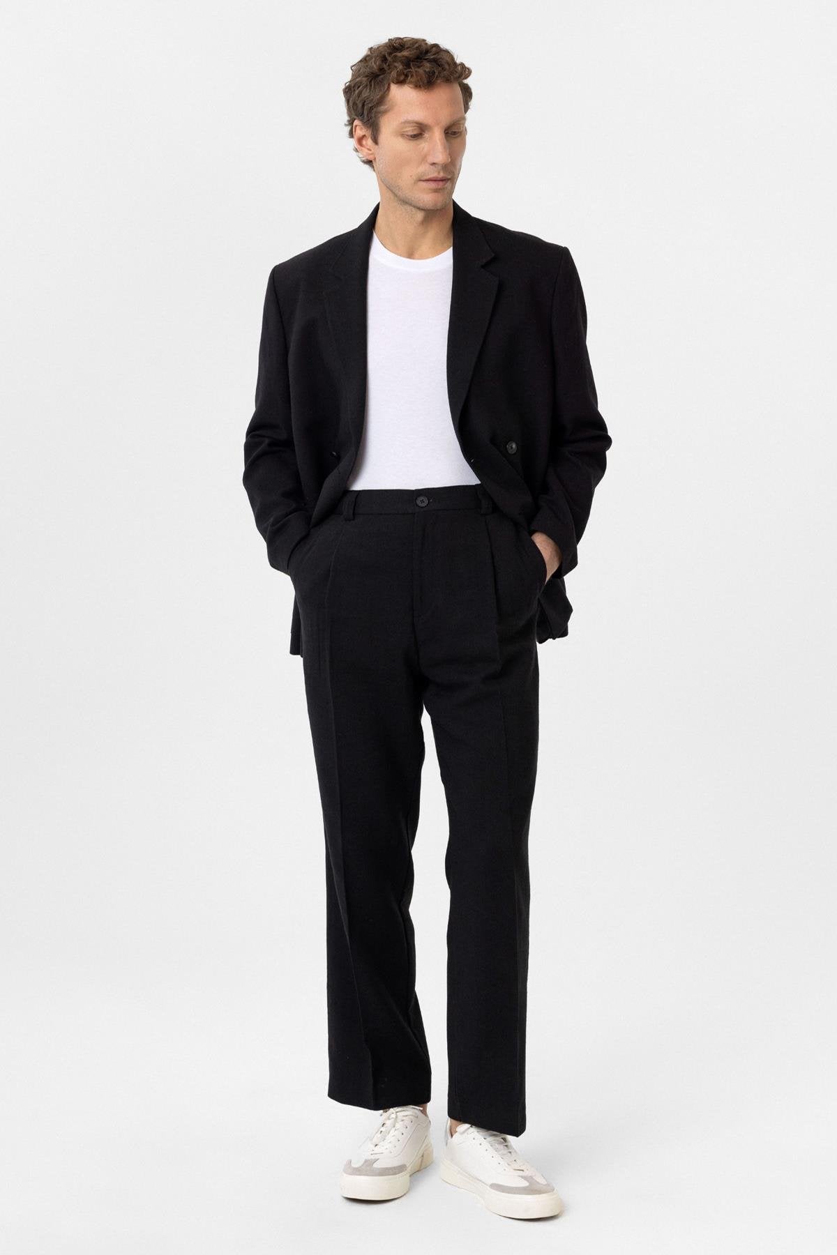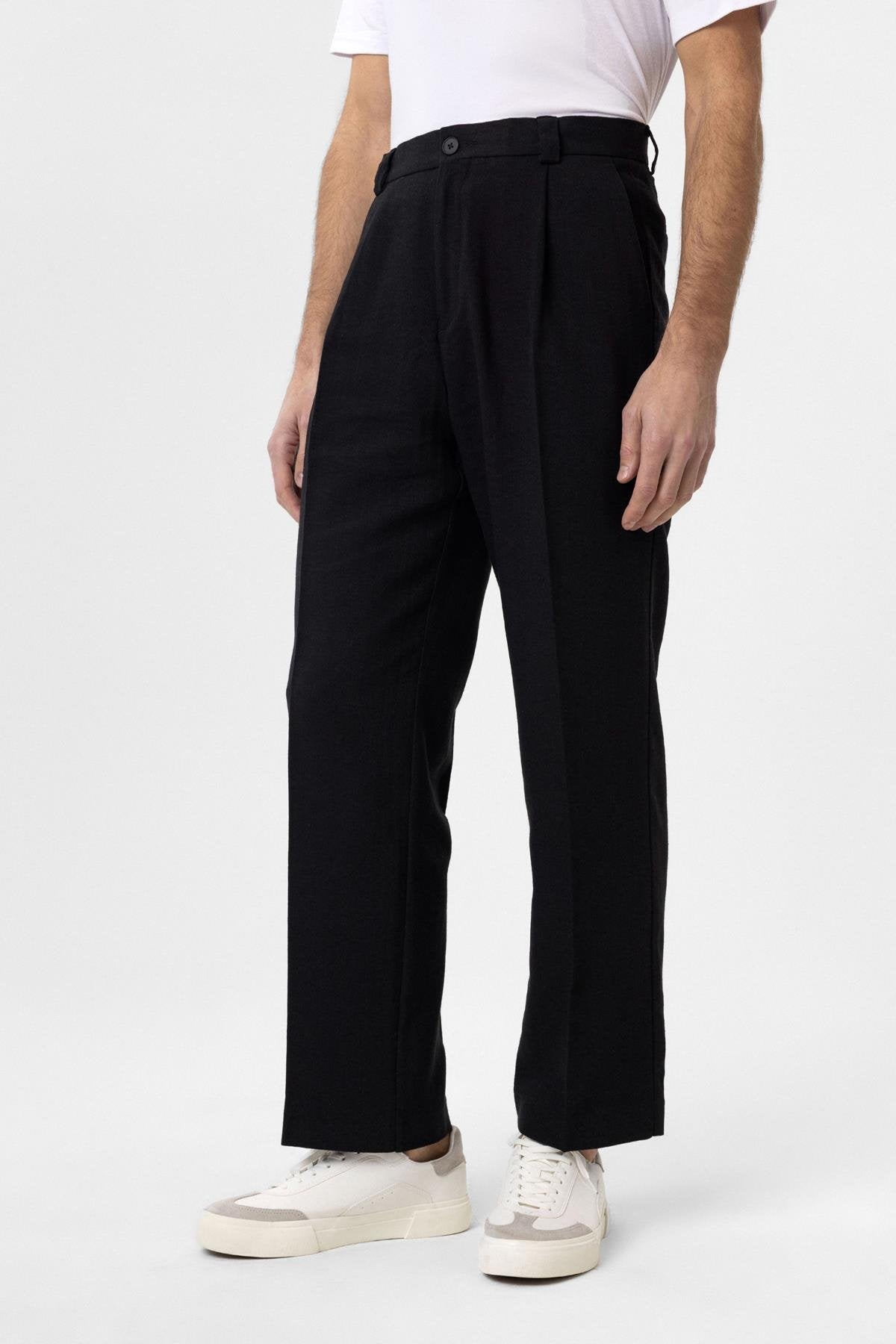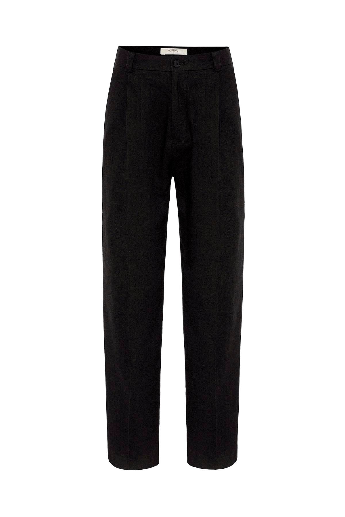 Siyah Yüksek Bel Keten Karışımlı Erkek Pantolon