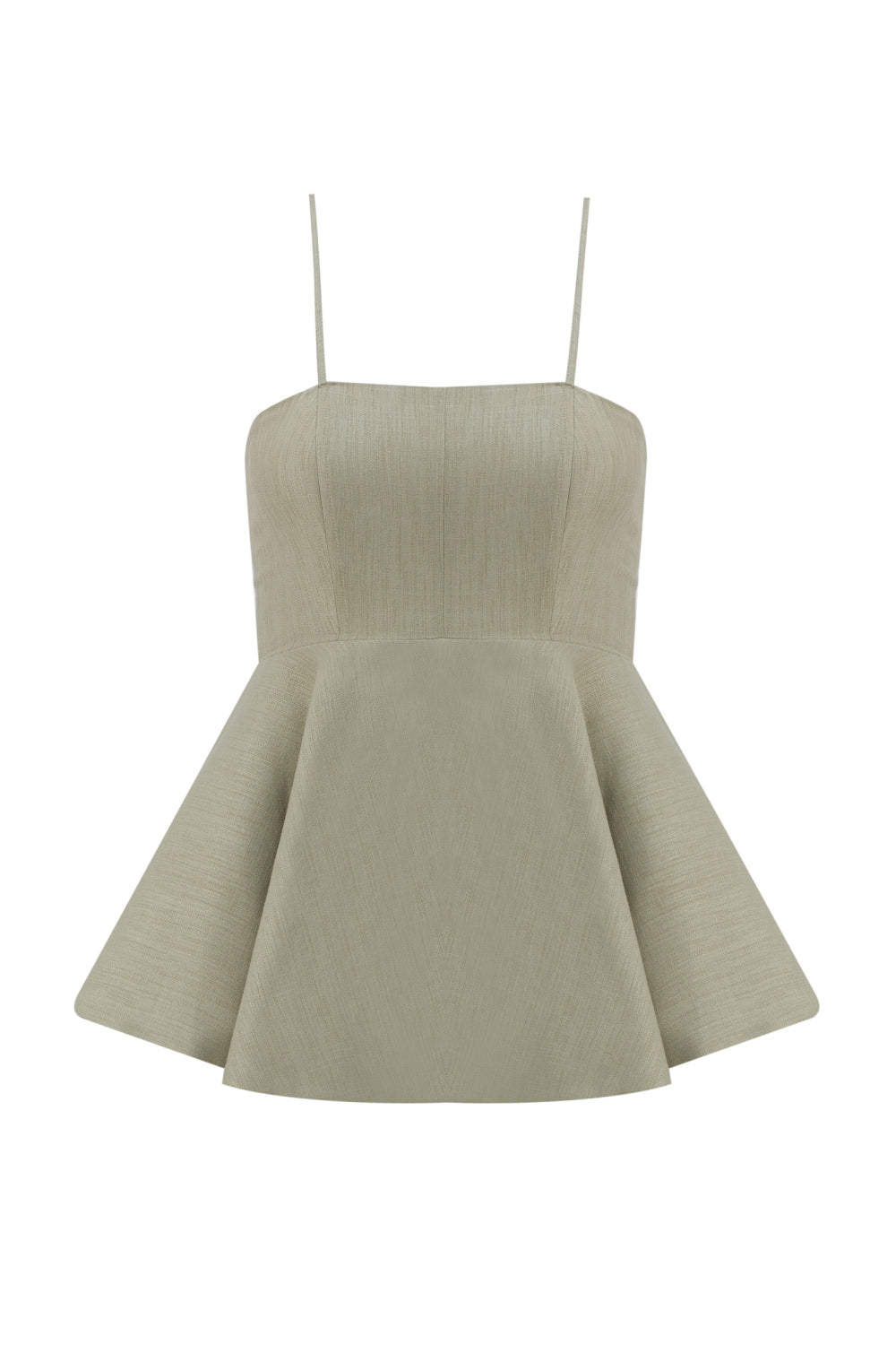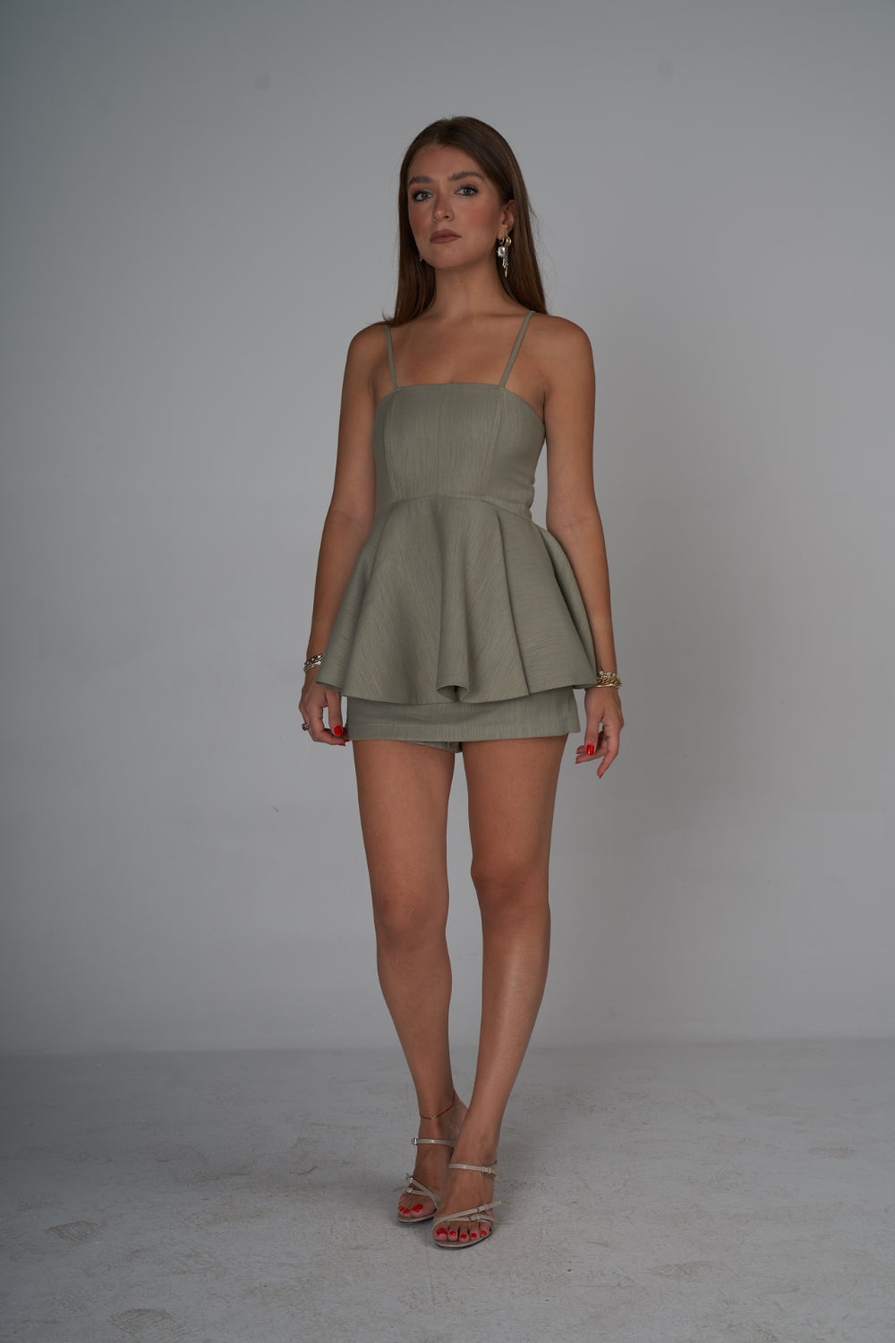Ürün Bilgisi: Peplum kesim, volanlı, göğüs kısmı balenli ip askılı bluz. Cep detaylı, yandan fermuarlı, bel arkası lastikli şort etek