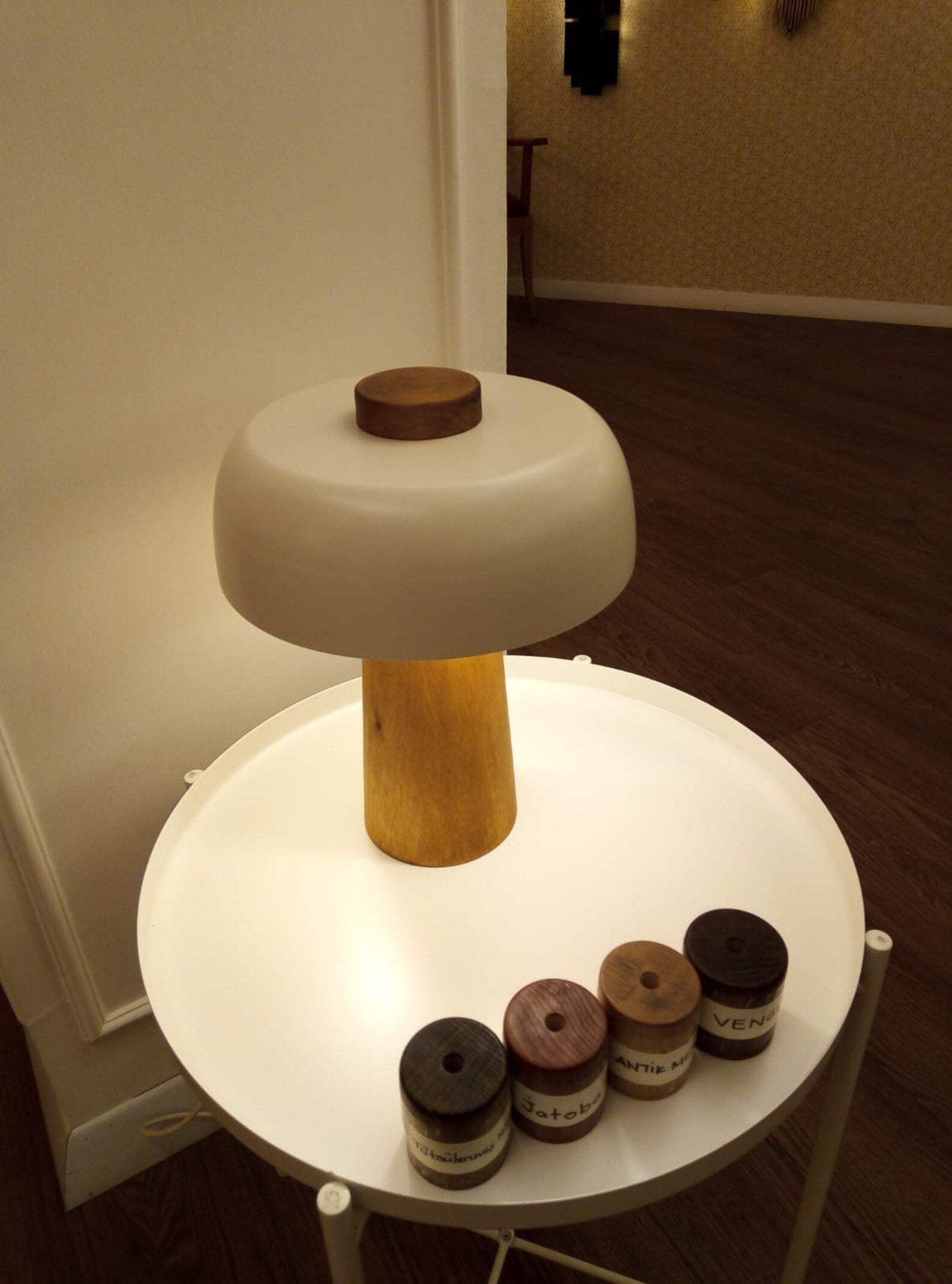 Atolye tarafından ahşap gövde ve metal başlık ile satışa sunulan masa lambası farklı renklerle sunulmaktadır.