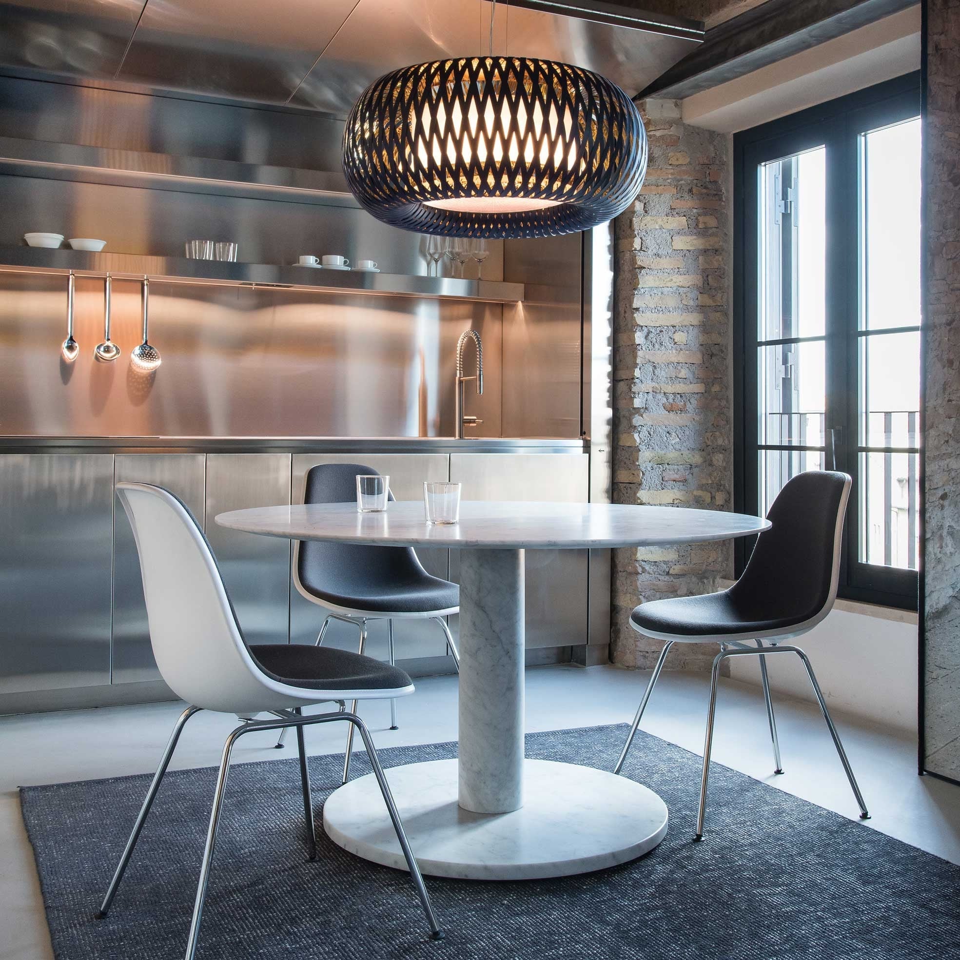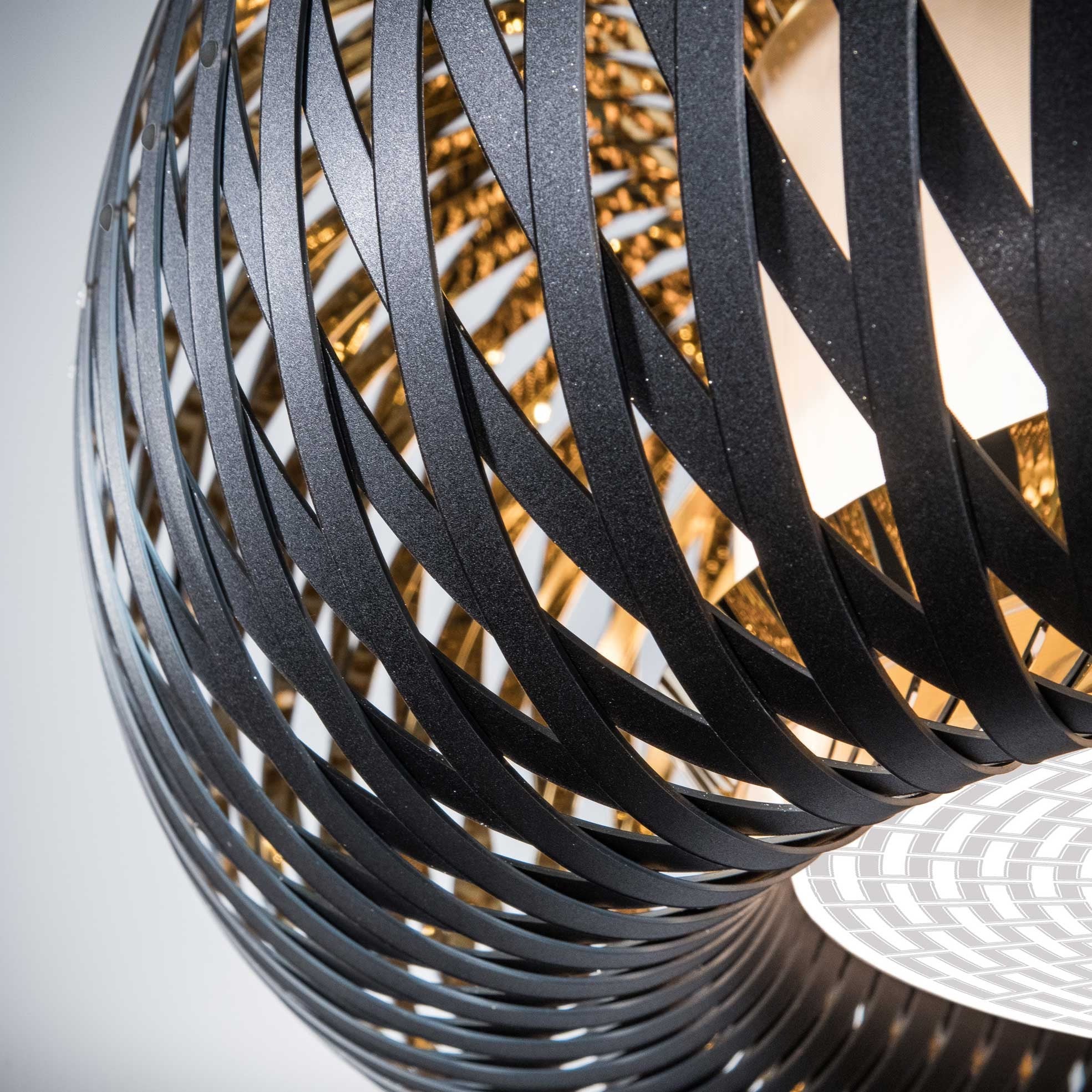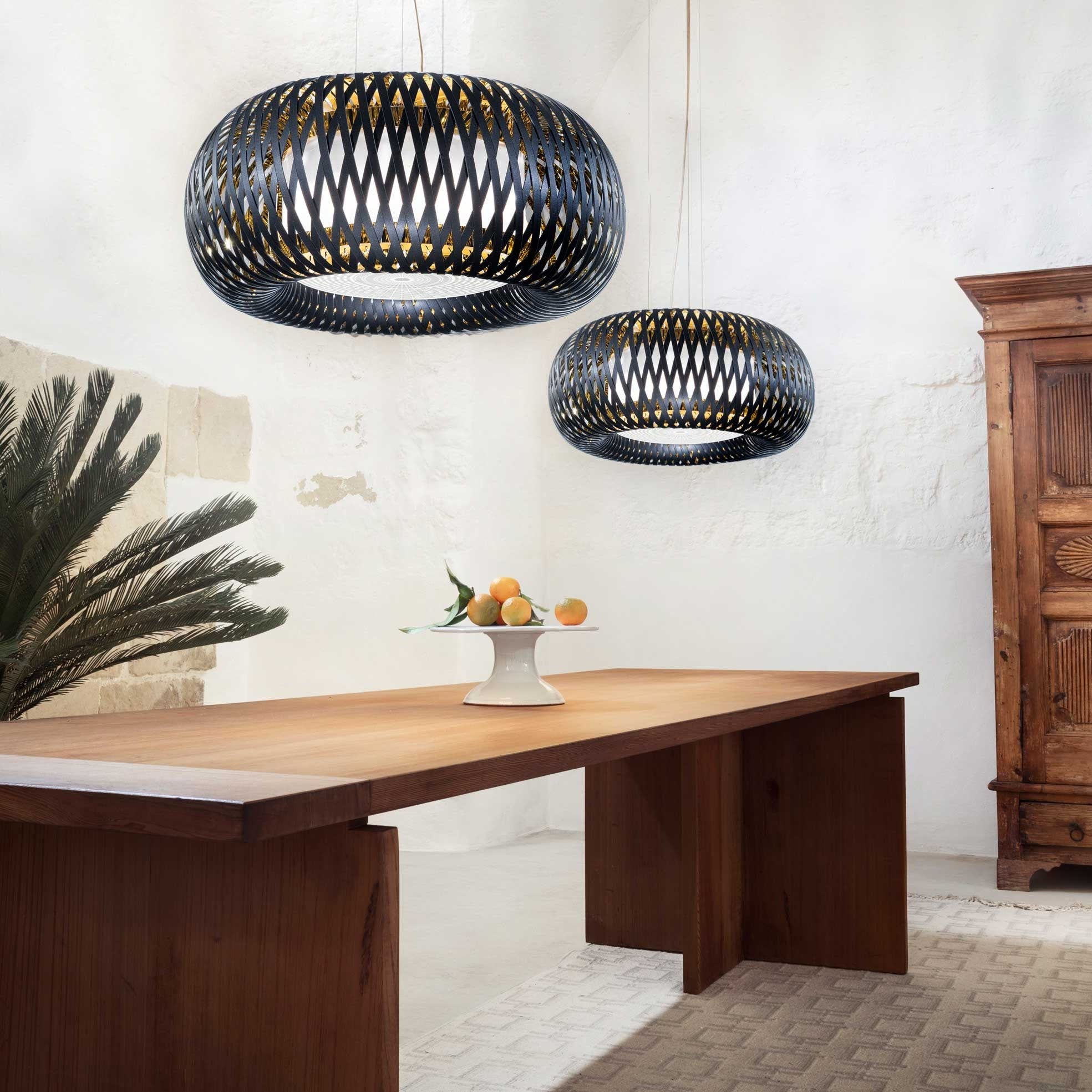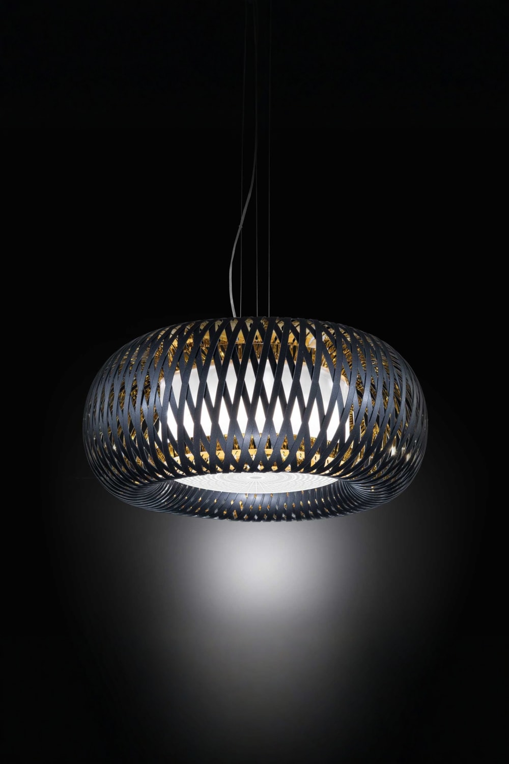 Sepetler ve kamış çuvalları şeklinde tarih öncesi çağlardan beri insanlığın bir parçası olan dokuma sanatından ilham alan Kalatos, Slamp'ın gelişmiş teknopolimerlerini kullanarak bu arketipleri modern bir yaklaşımla yeniden ele alıyor; Koleksiyonun hem asma hem de tavan versiyonları bulunuyor. İki renk kombinasyonuyla sunulurlar: iç kısmı altın kaplamalı mat siyah veya şeffaf Lentiflex kaplamalı beyaz.