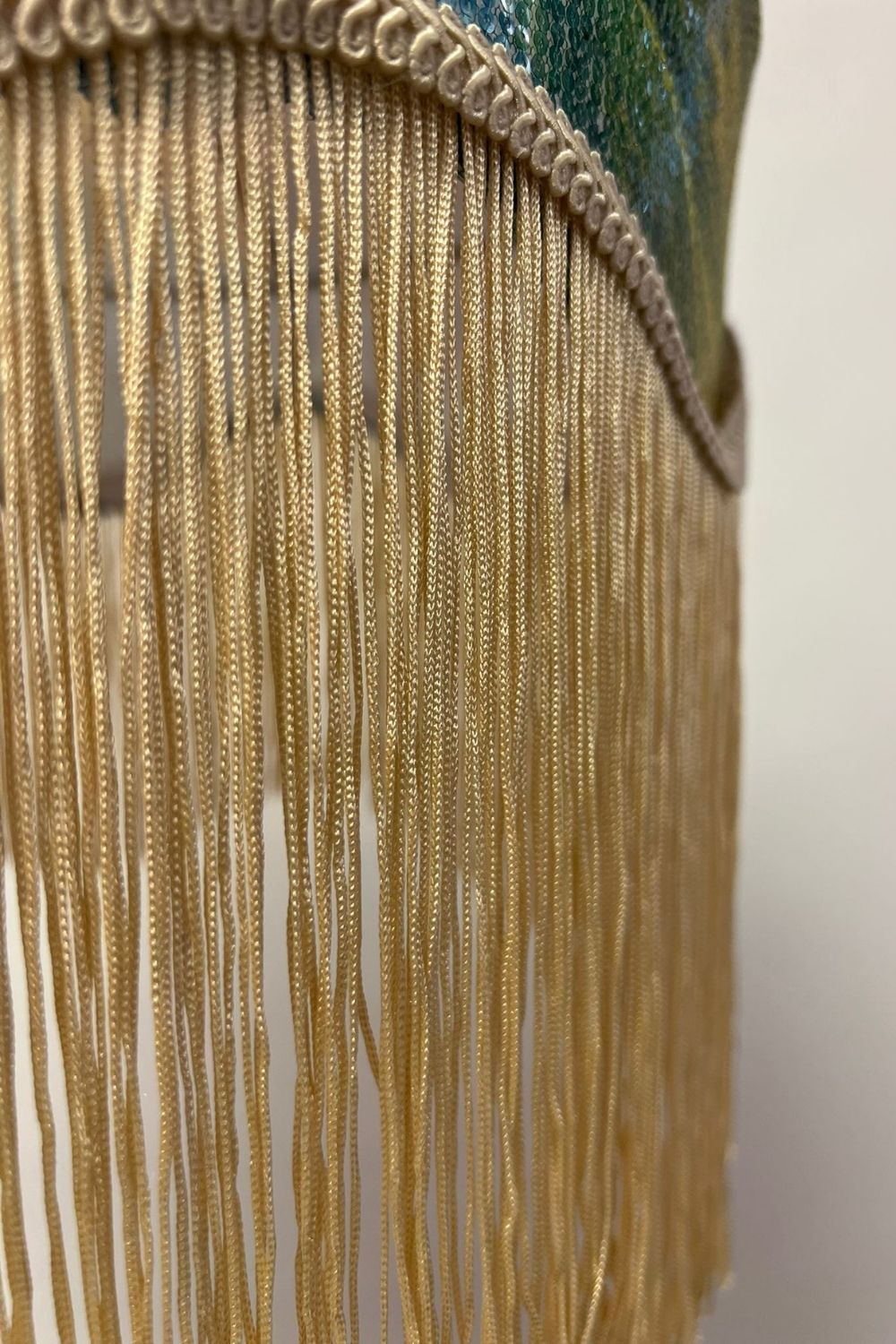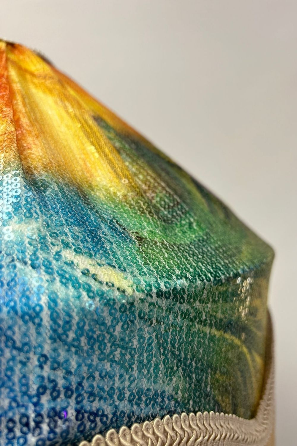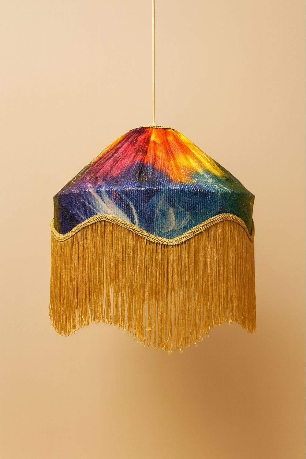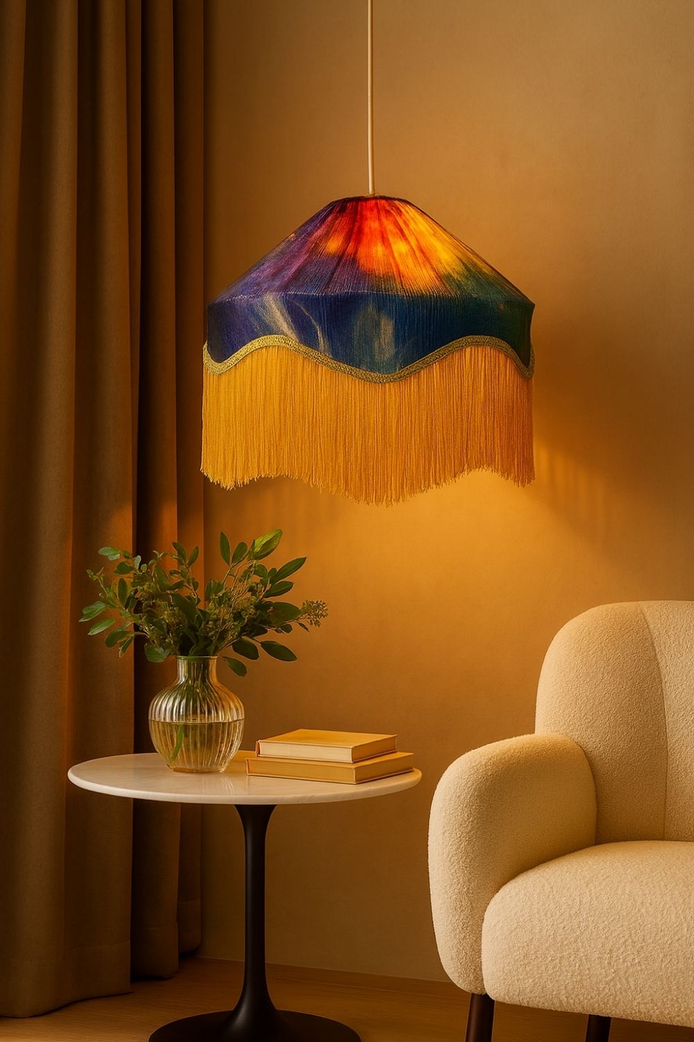 Virella Sarkıt Avize, sanat eseri gibi görünen çok renkli yüzeyi ve altın sarısı dalgalı püskül bordürüyle dekorasyona canlılık katıyor.Yoğun turuncu, mavi, mor ve sarı tonlarının organik geçişlerle oluşturduğu kumaş yüzey, altın şerit bordür ve dalga kesimli püsküllerle zarifçe tamamlanmış.Vintage estetikten ilham alan bu tasarım, eğlenceli ve özgün atmosfer yaratmak isteyen yaşam alanları için ideal.