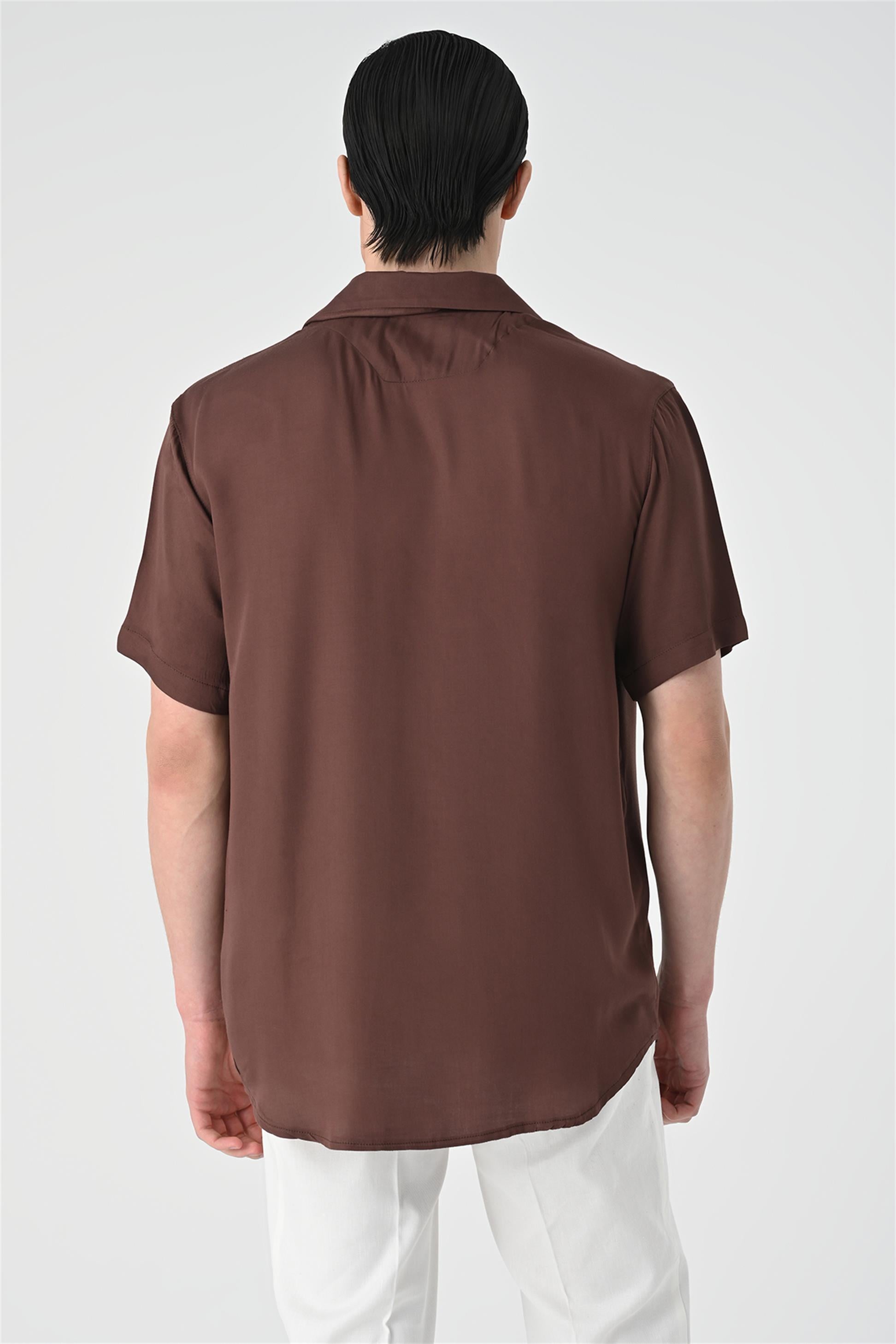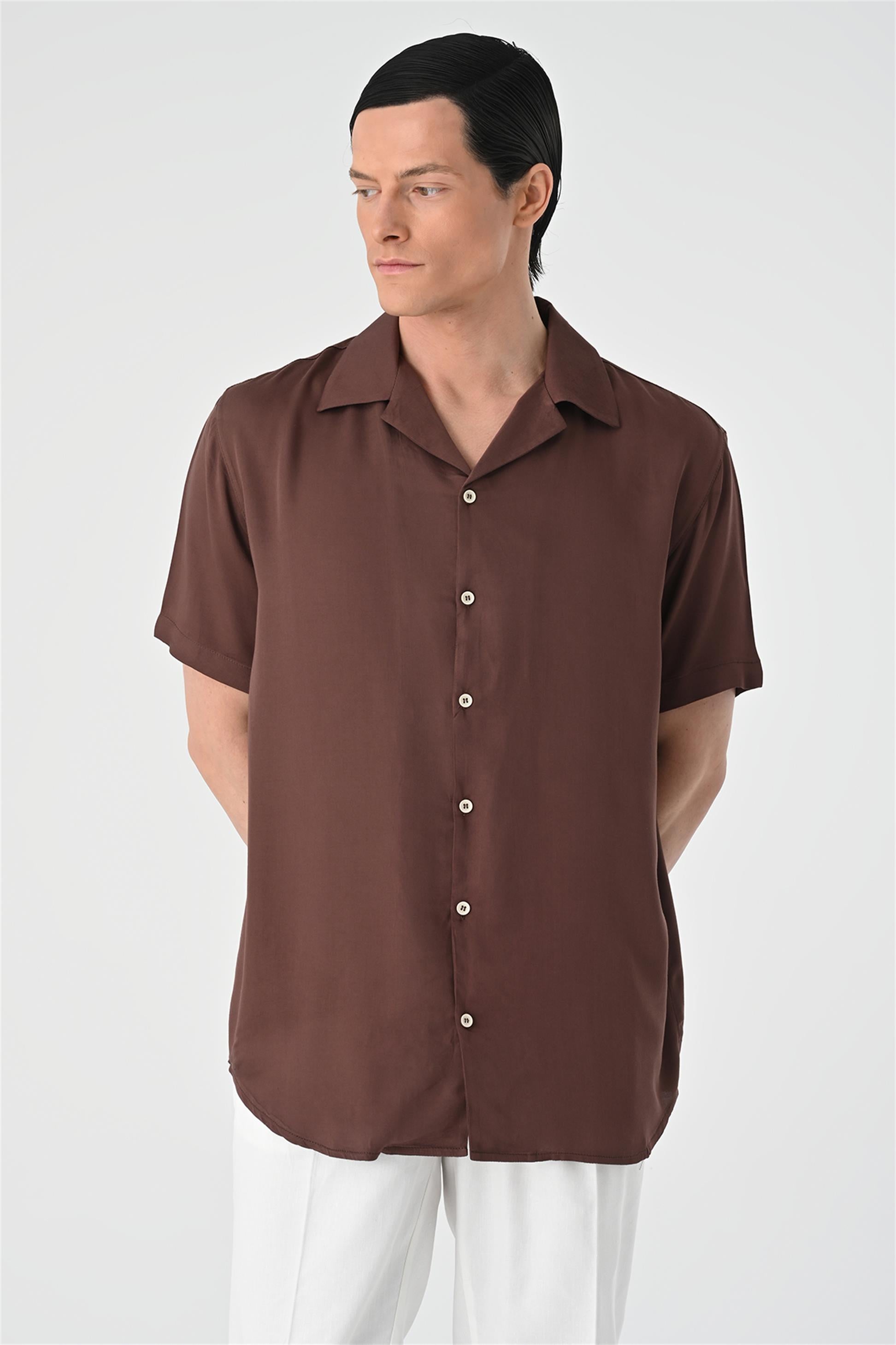 Kahve Apaş Yaka Oversize Kısa Kollu Erkek Gömlek
