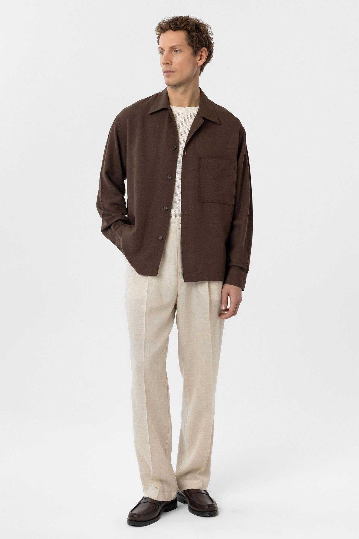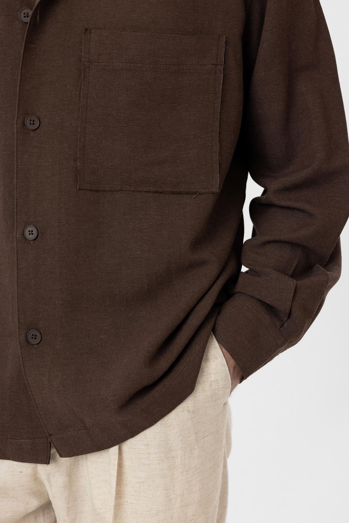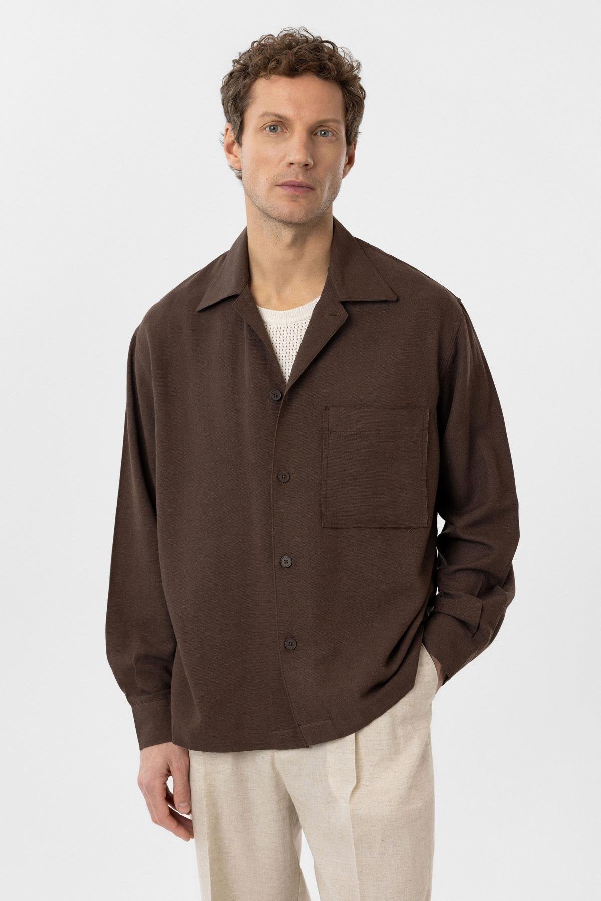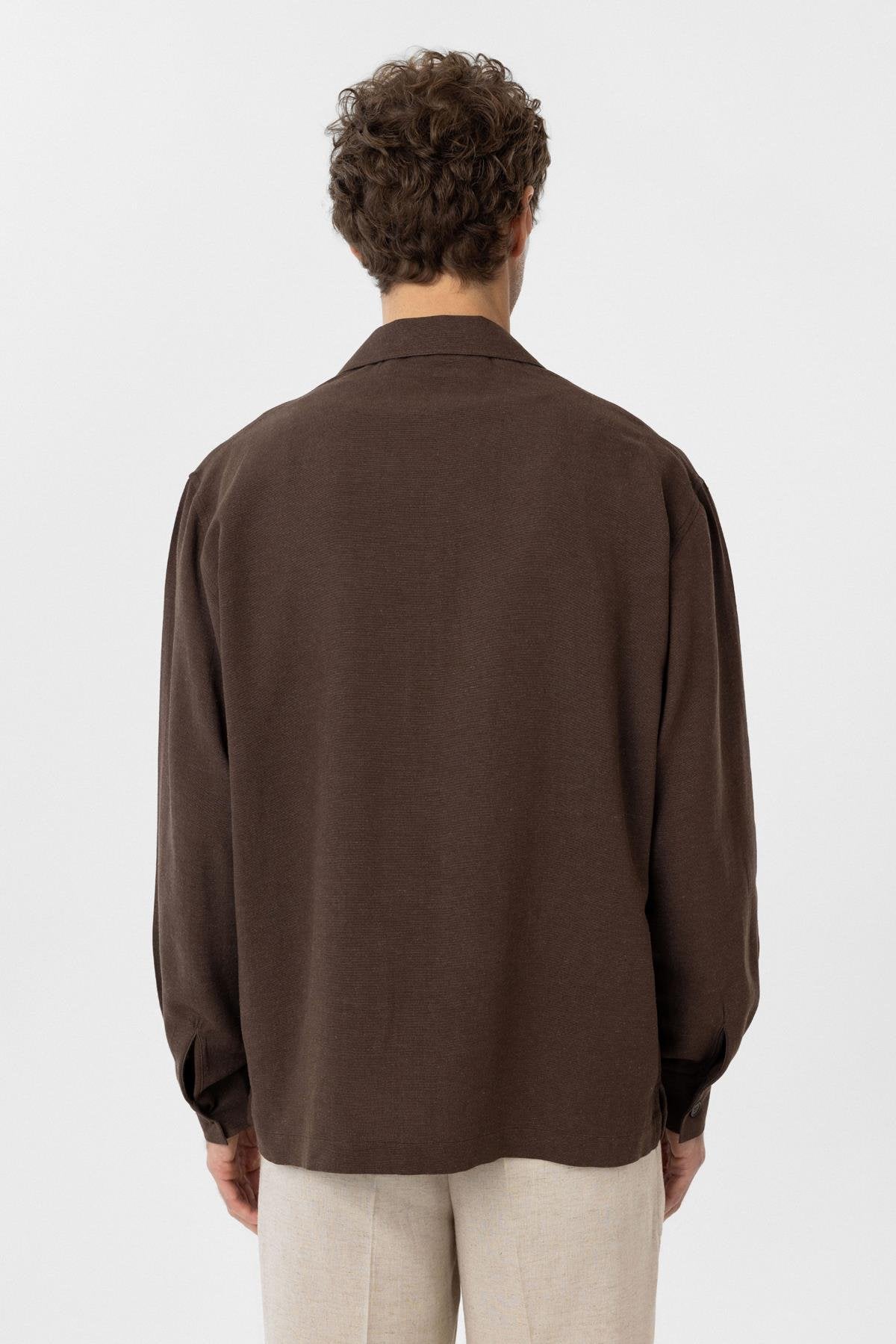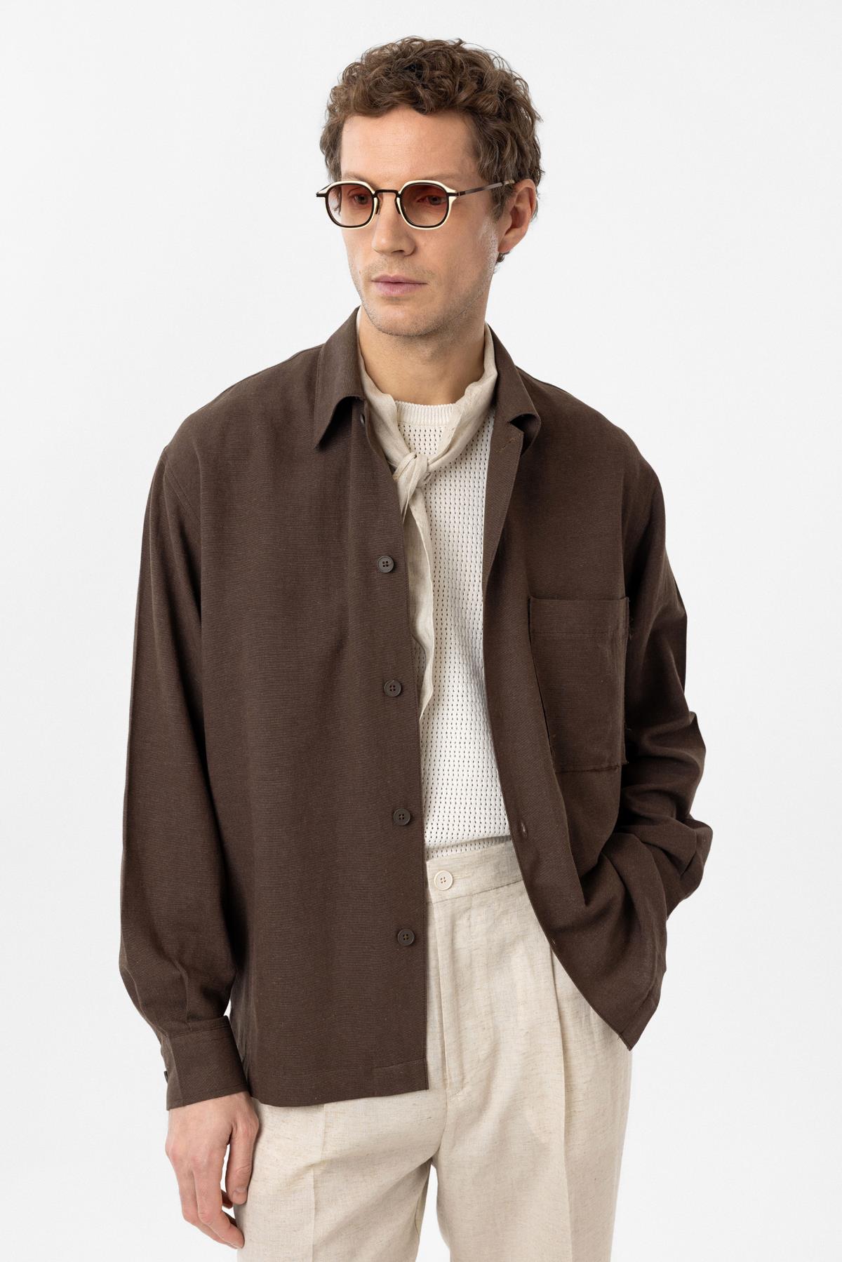 Kahve Keten Karışımlı Relaxed Erkek Gömlek