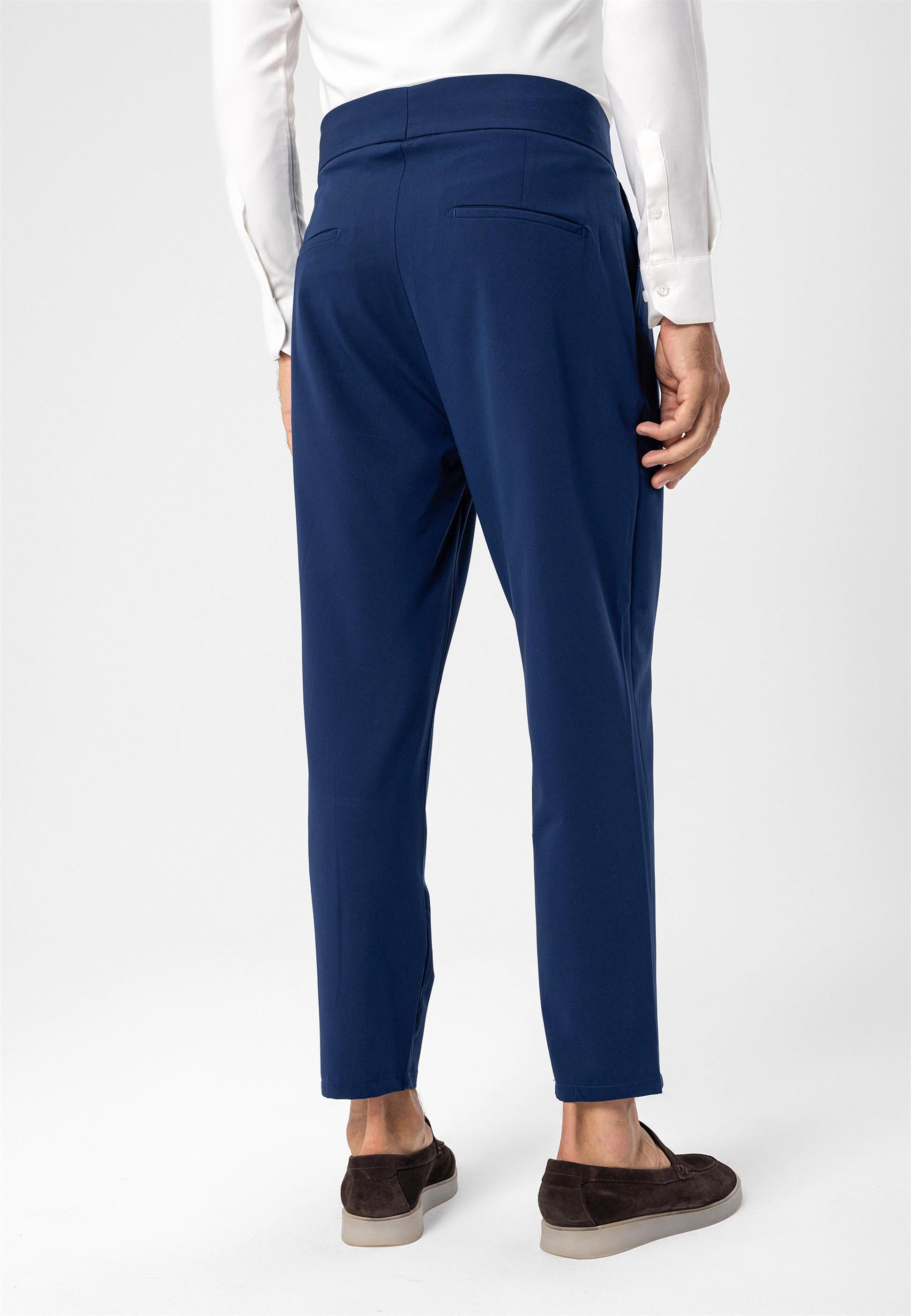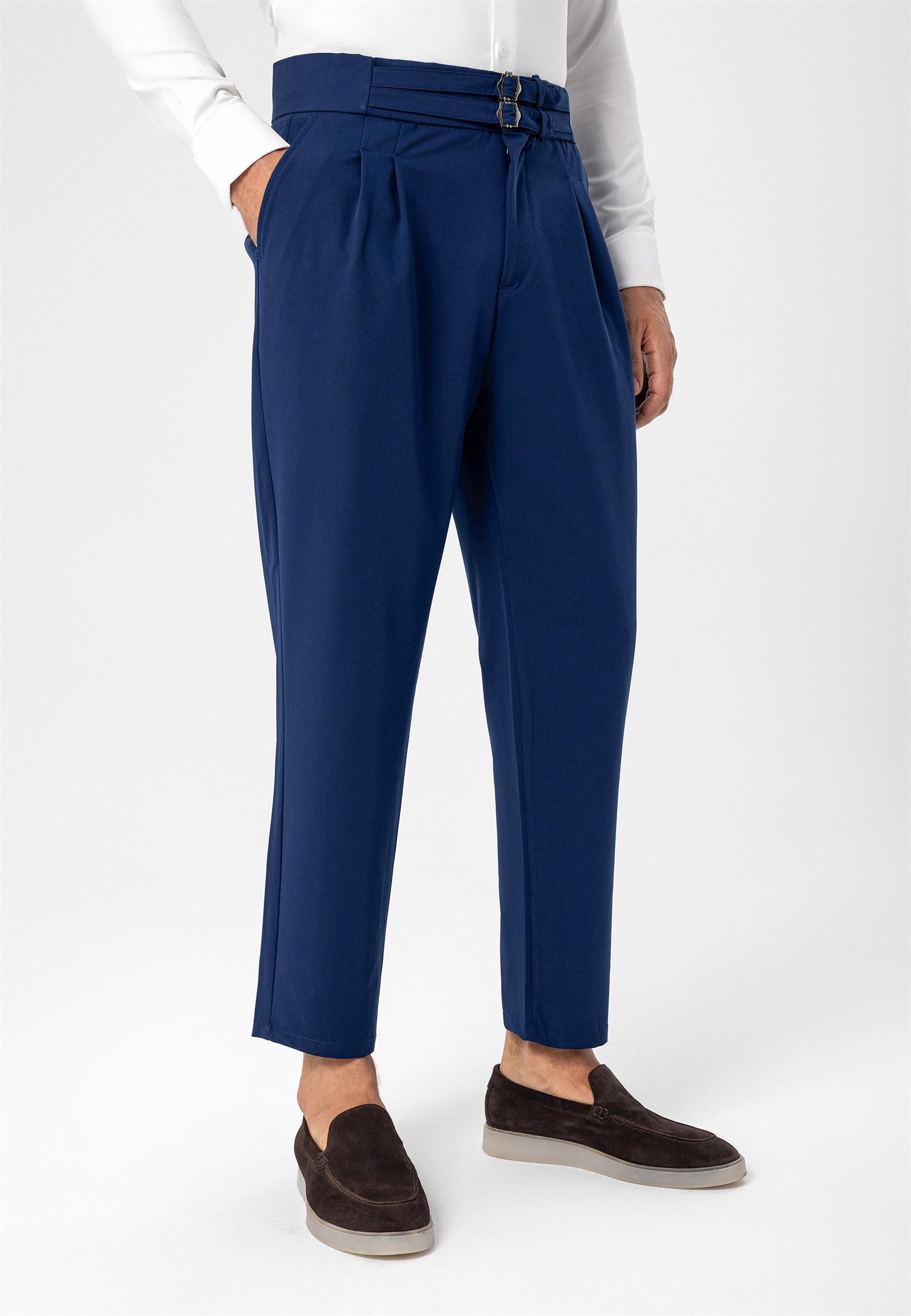 Lacivert Yüksek Bel Toka Kemerli Pileli Kumaş Pantolon