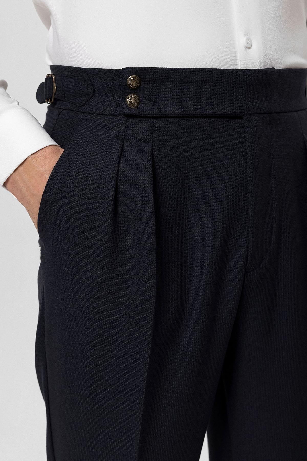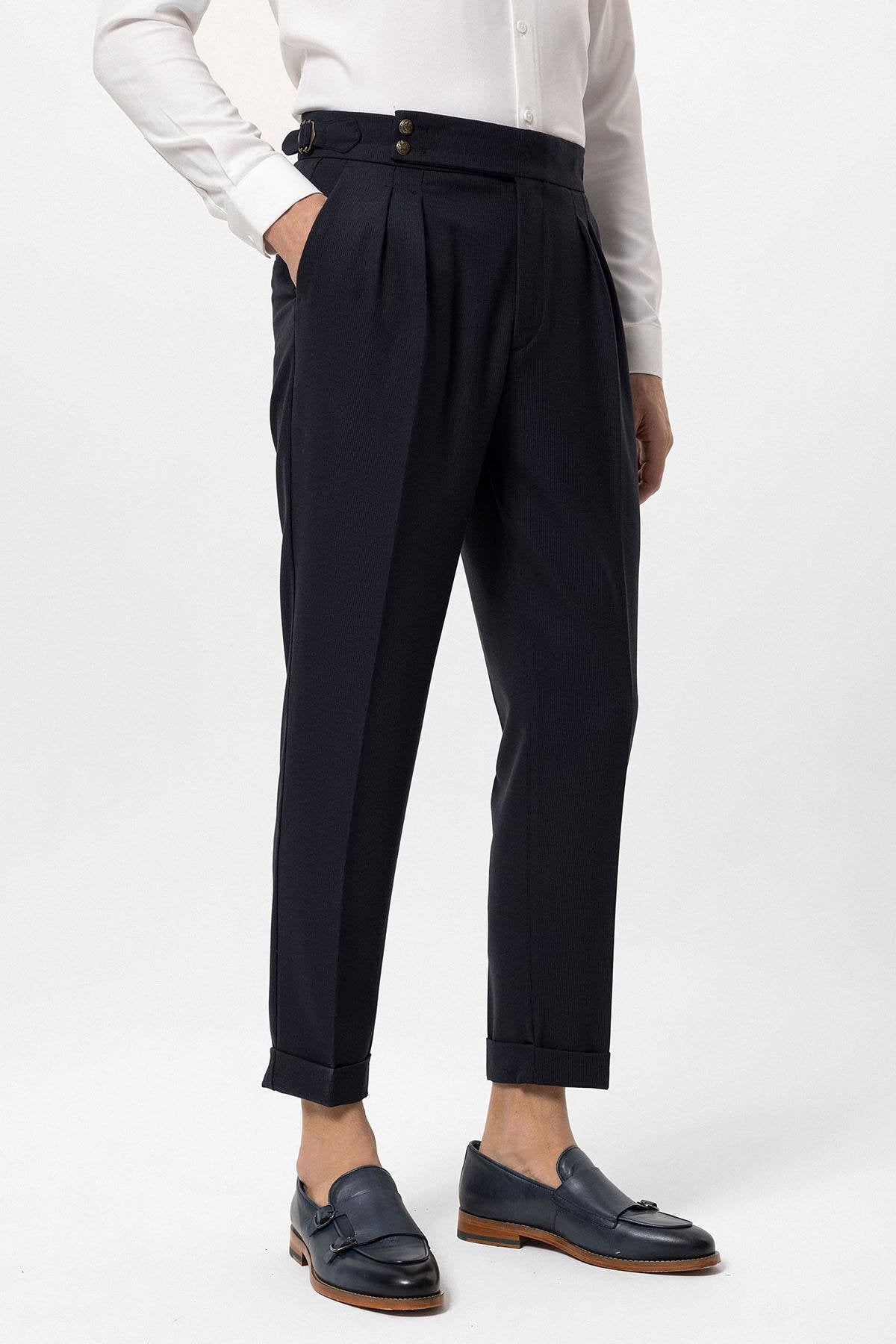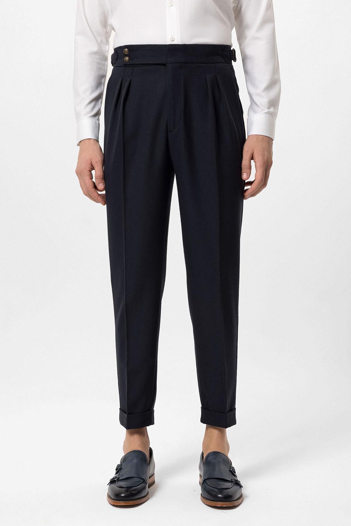 Lacivert Yüksek Bel Yandan Tokalı Pileli Kumaş Pantolon