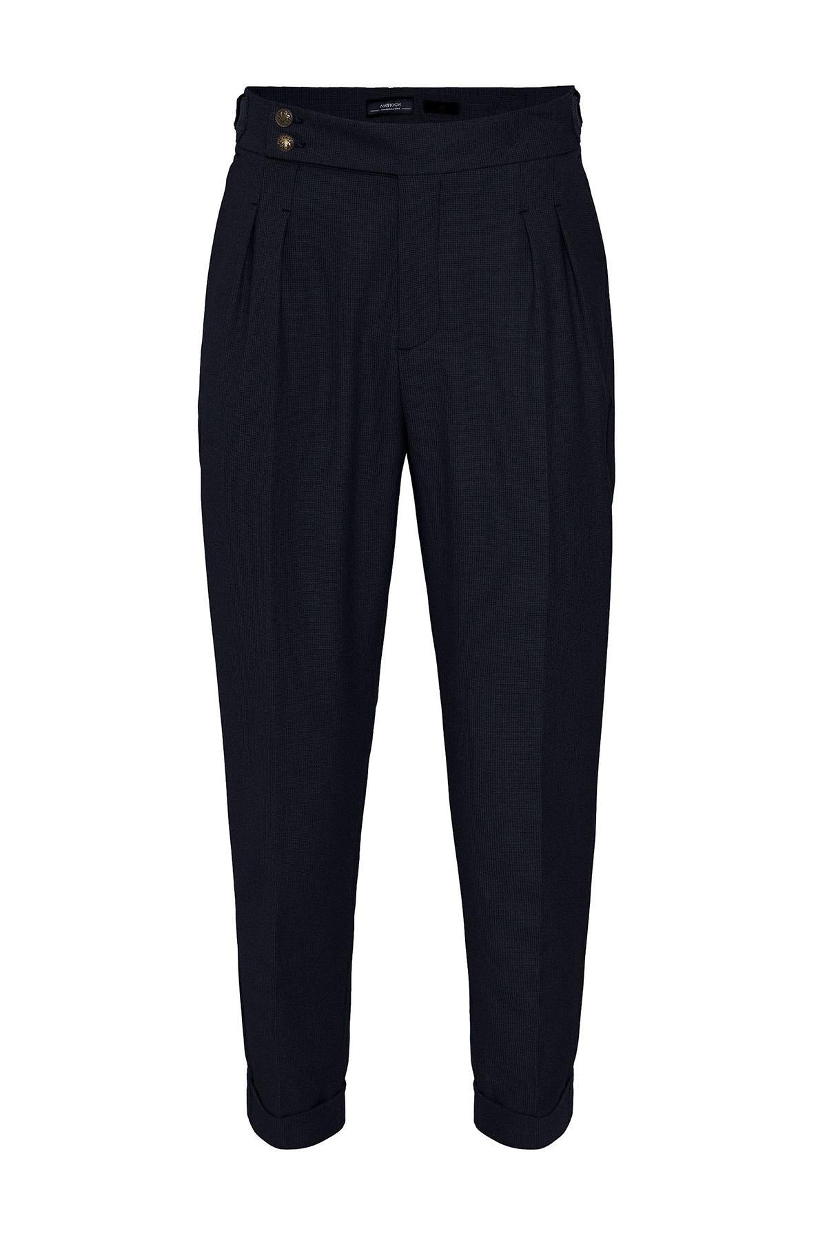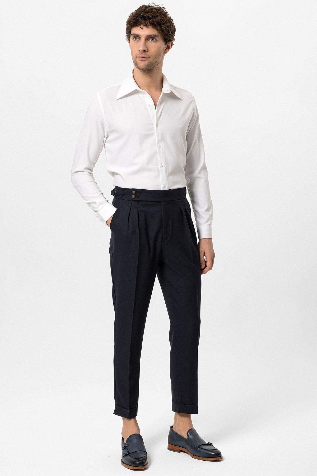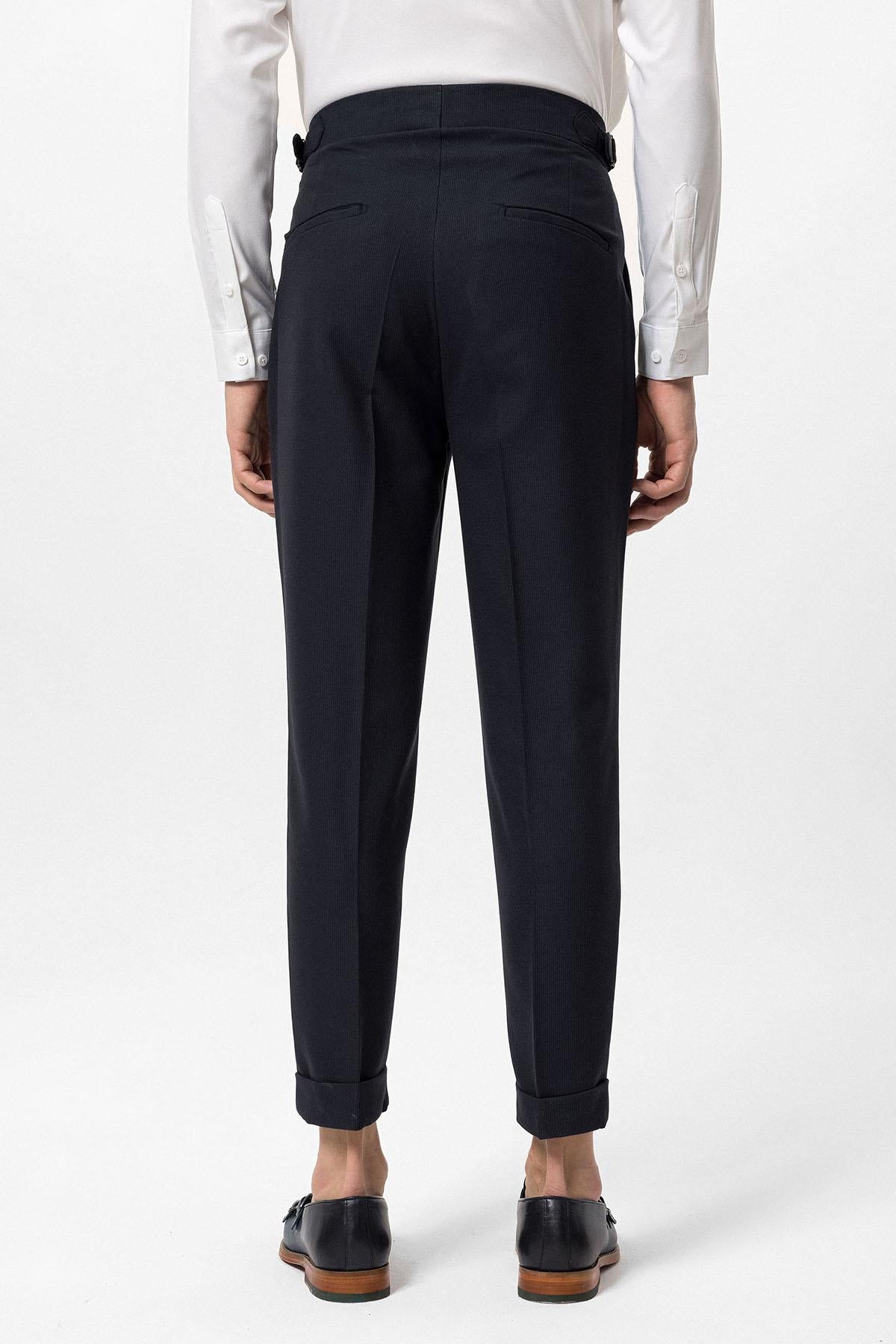 Lacivert Yüksek Bel Yandan Tokalı Pileli Kumaş Pantolon