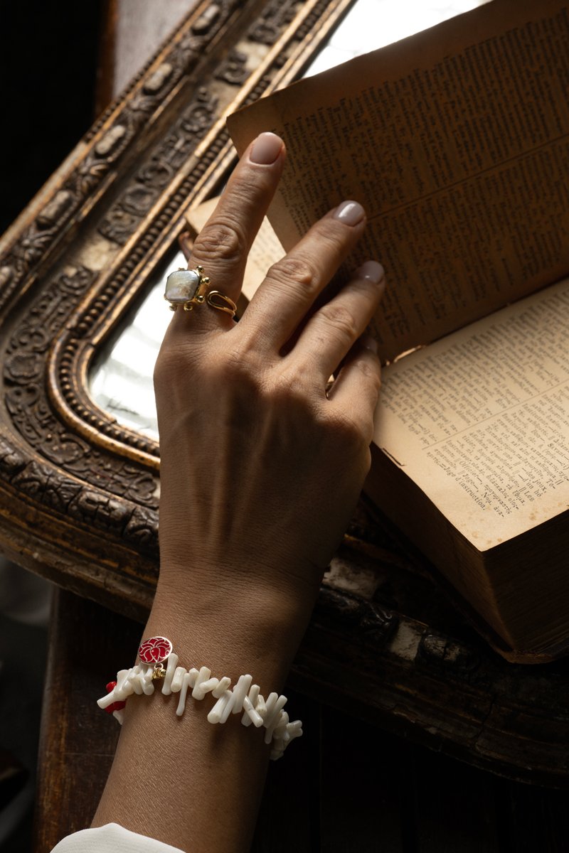 Beyaz mercan ve lotus gümüş aparat kullanılmıştır.