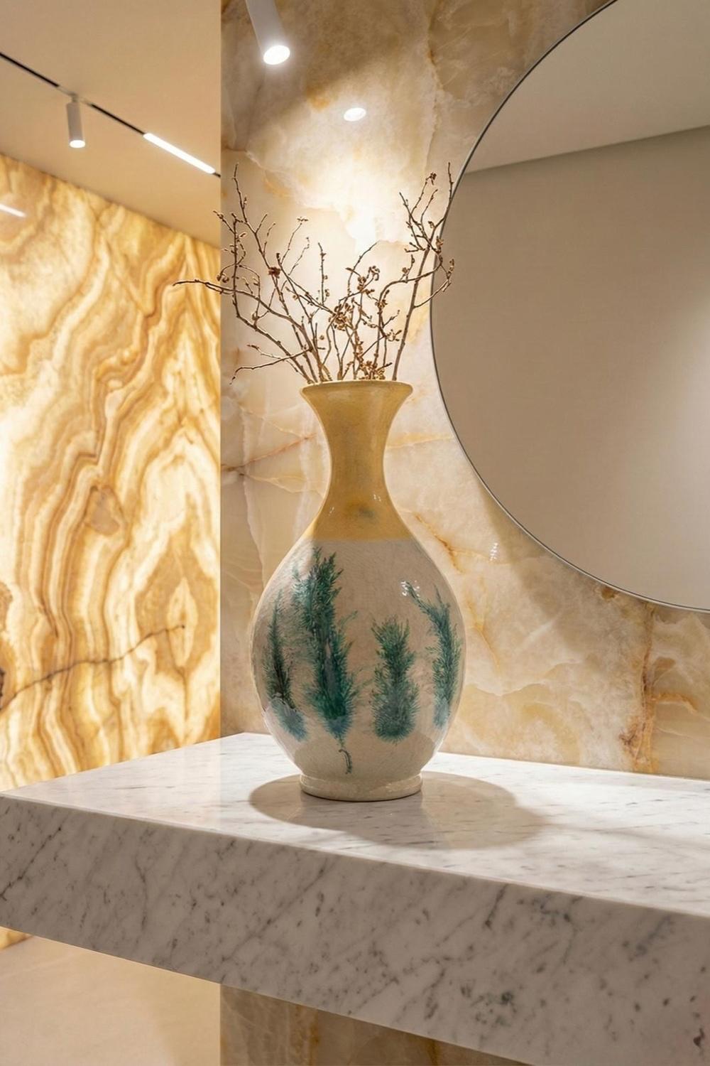 Yumuşak renk paleti ve organik fırça detayları sayesinde mermer yüzeylerde, çağdaş banyolarda, oturma odalarında, antrelerde veya otel stilinde dekore edilmiş iç mekânlarda kusursuz bir tamamlayıcıdır.