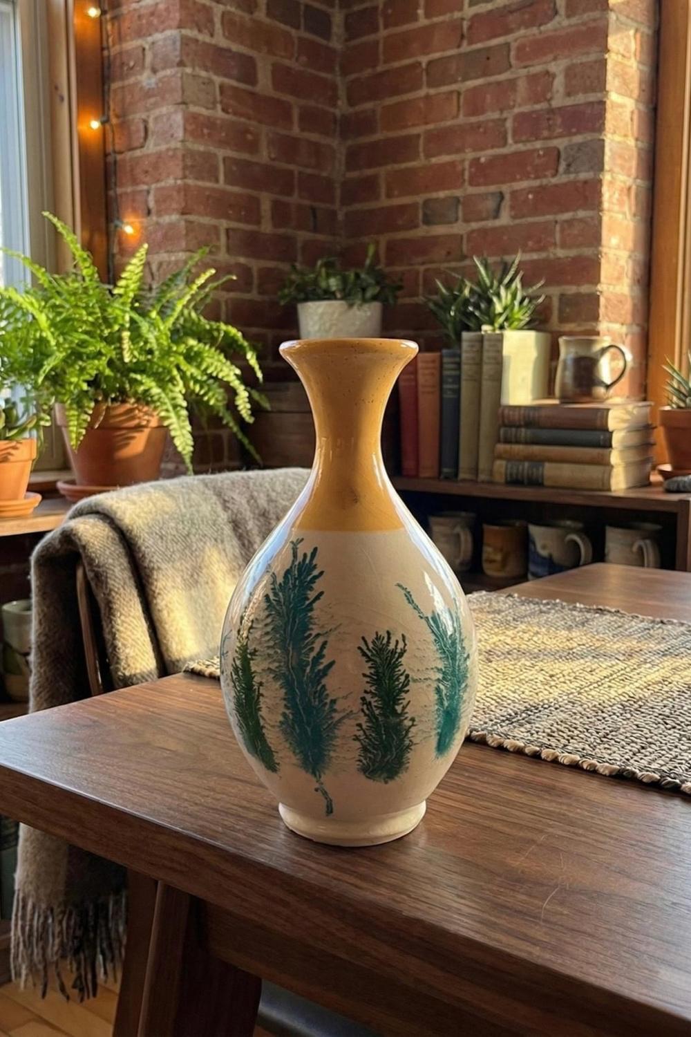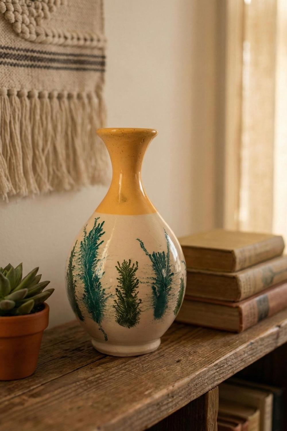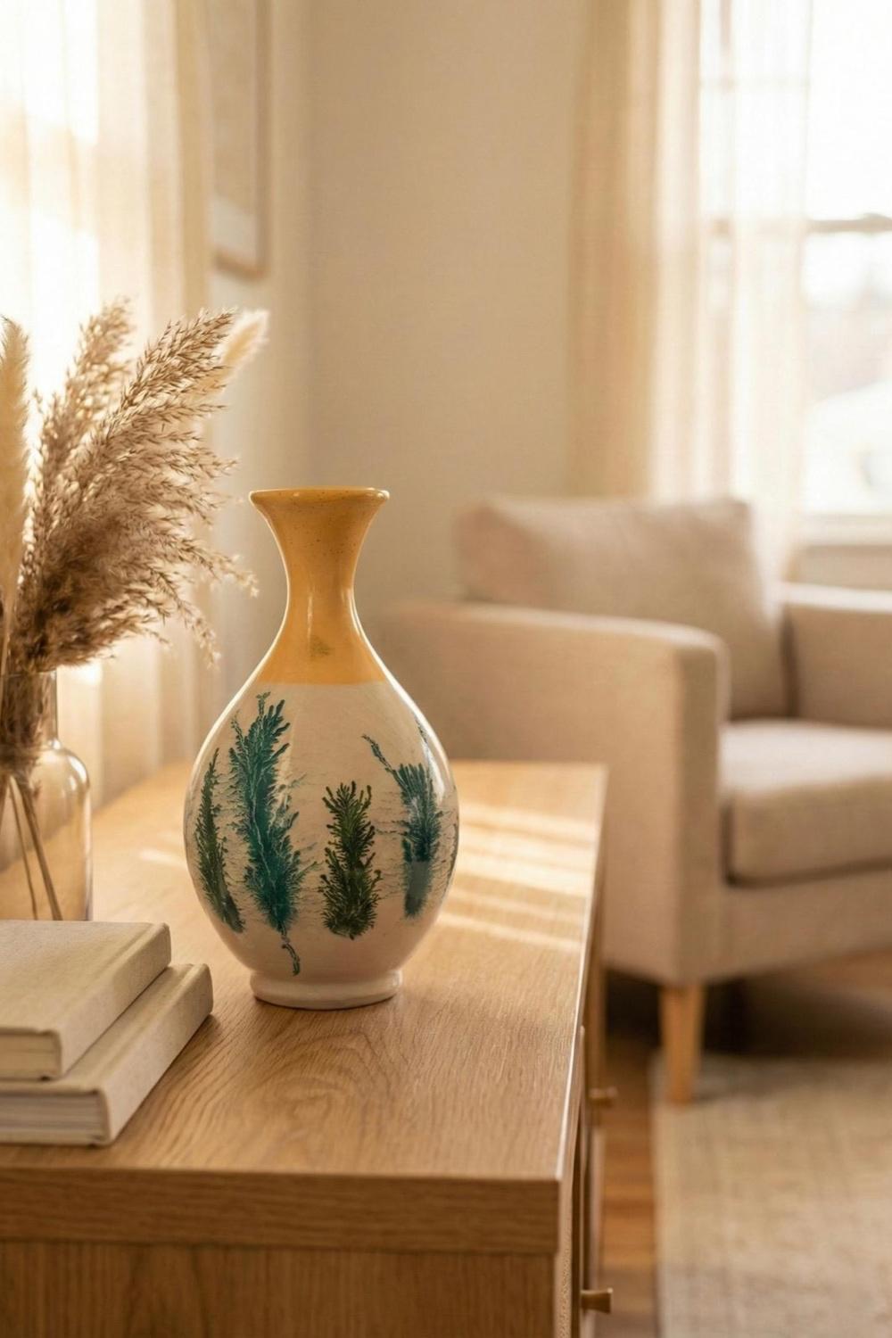 Zarif botanik desenlere sahip bu el boyaması seramik vazo ile yaşam alanlarınıza sofistike bir dokunuş katın.