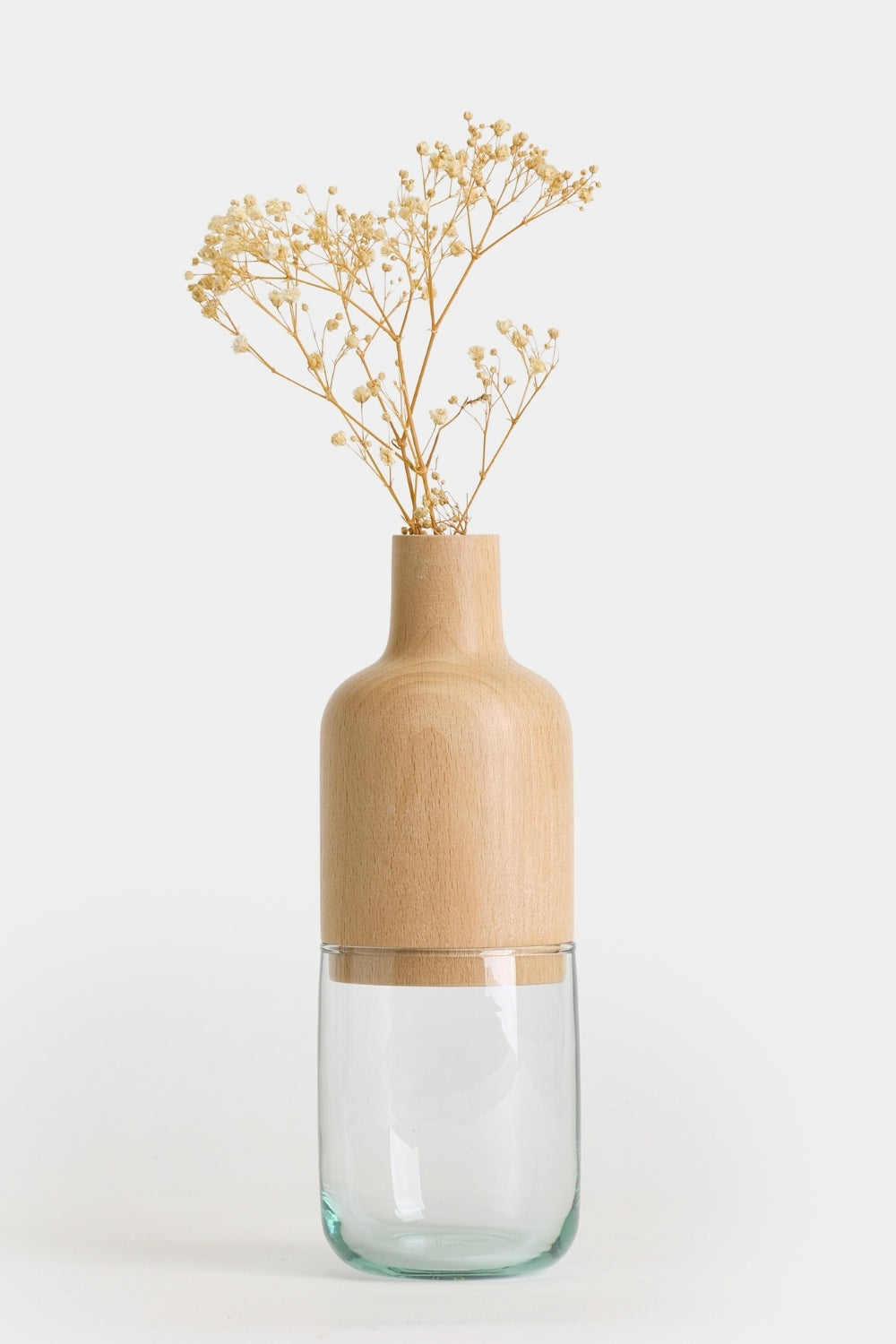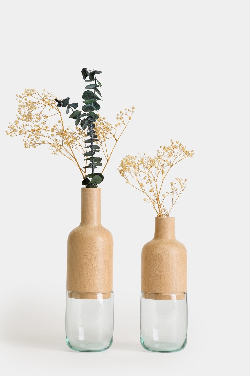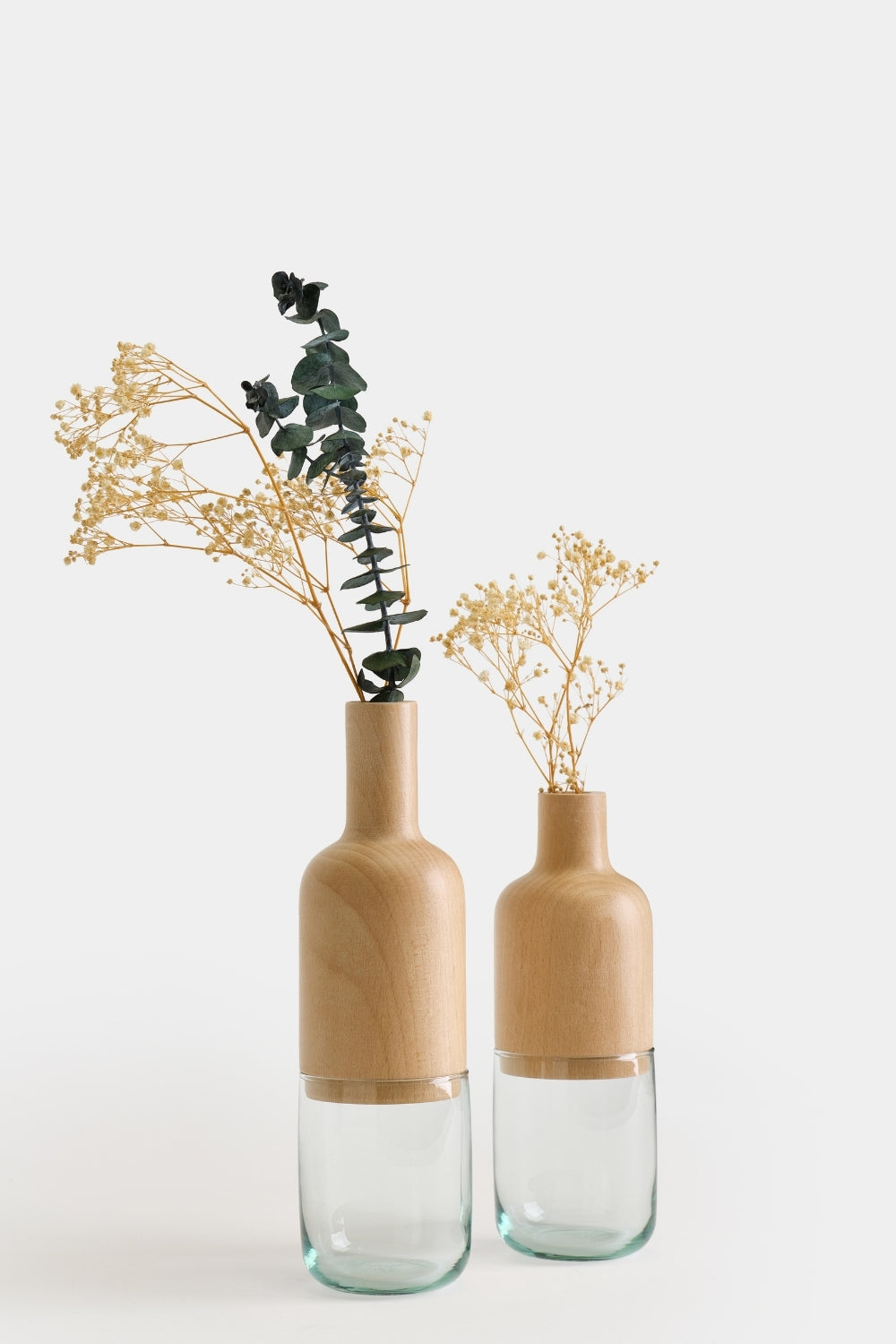 Ürün Özellikleri:Malzeme: Cam ve Masif AhşapBoyutlar: Büyük Vazo: Çap: 7 cm, Yükseklik: 24 cm, Küçük Vazo: Çap: 7 cm, Yükseklik: 20 cm,Vazo Ağız Çağı: 1,8 cmDoğal malzeme: Her biri benzersiz el işçiliği
