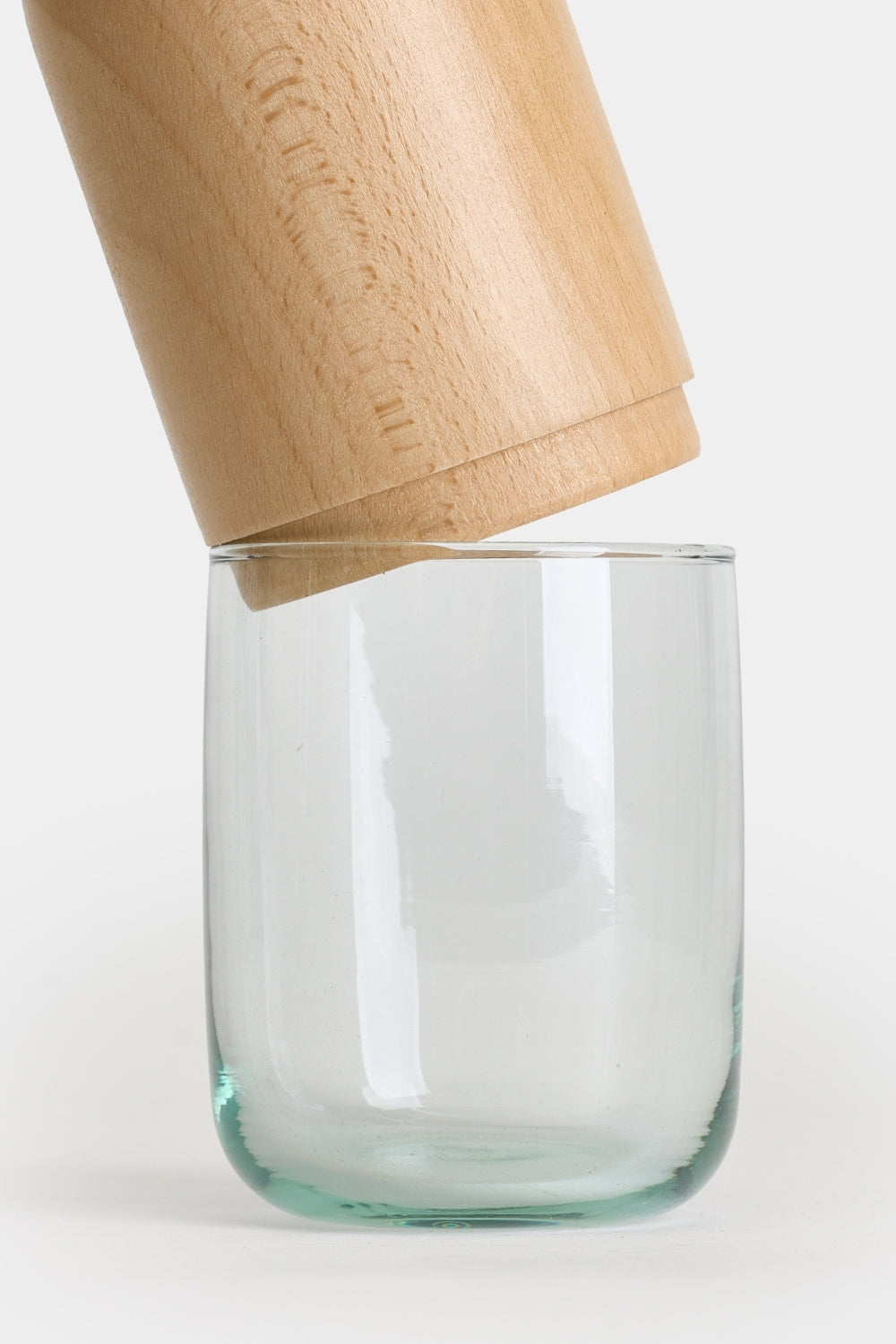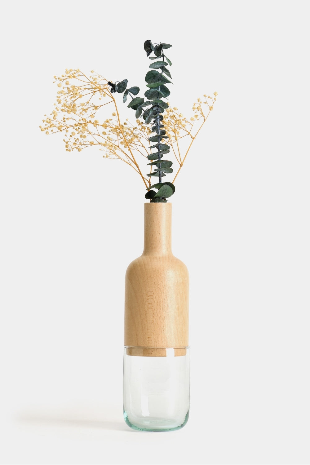 Tarz ve İlham:Masif ahşabın sıcaklığı ve köklü duruşu, camın saydam ve hafif yapısıyla buluşur. Ahşap ve cam kısmının yumuşak ve silindirik hatları içine koyacağınız bitkilerin veya çiçeklerin gövdesini ve suyunu gizemli bir atmosferde tutarak meditatif bir ortam yaratır.