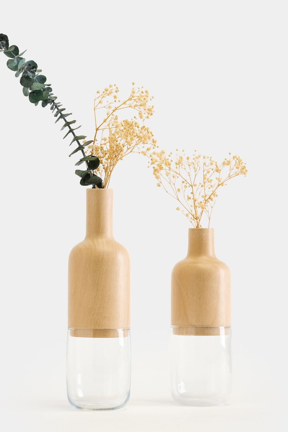 Ürün Özellikleri:Malzeme: Cam ve Masif AhşapBoyutlar: Büyük Vazo: Çap: 7 cm, Yükseklik: 24 cm, Küçük Vazo: Çap: 7 cm, Yükseklik: 20 cm,Vazo Ağız Çağı: 1,8 cmDoğal malzeme: Her biri benzersiz el işçiliği