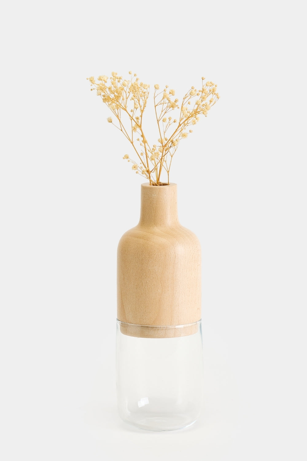Tarz ve İlham:Masif ahşabın sıcaklığı ve köklü duruşu, camın saydam ve hafif yapısıyla buluşur. Ahşap ve cam kısmının yumuşak ve silindirik hatları içine koyacağınız bitkilerin veya çiçeklerin gövdesini ve suyunu gizemli bir atmosferde tutarak meditatif bir ortam yaratır.