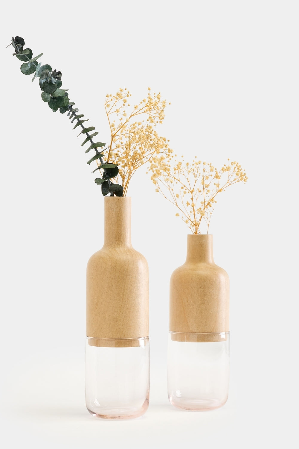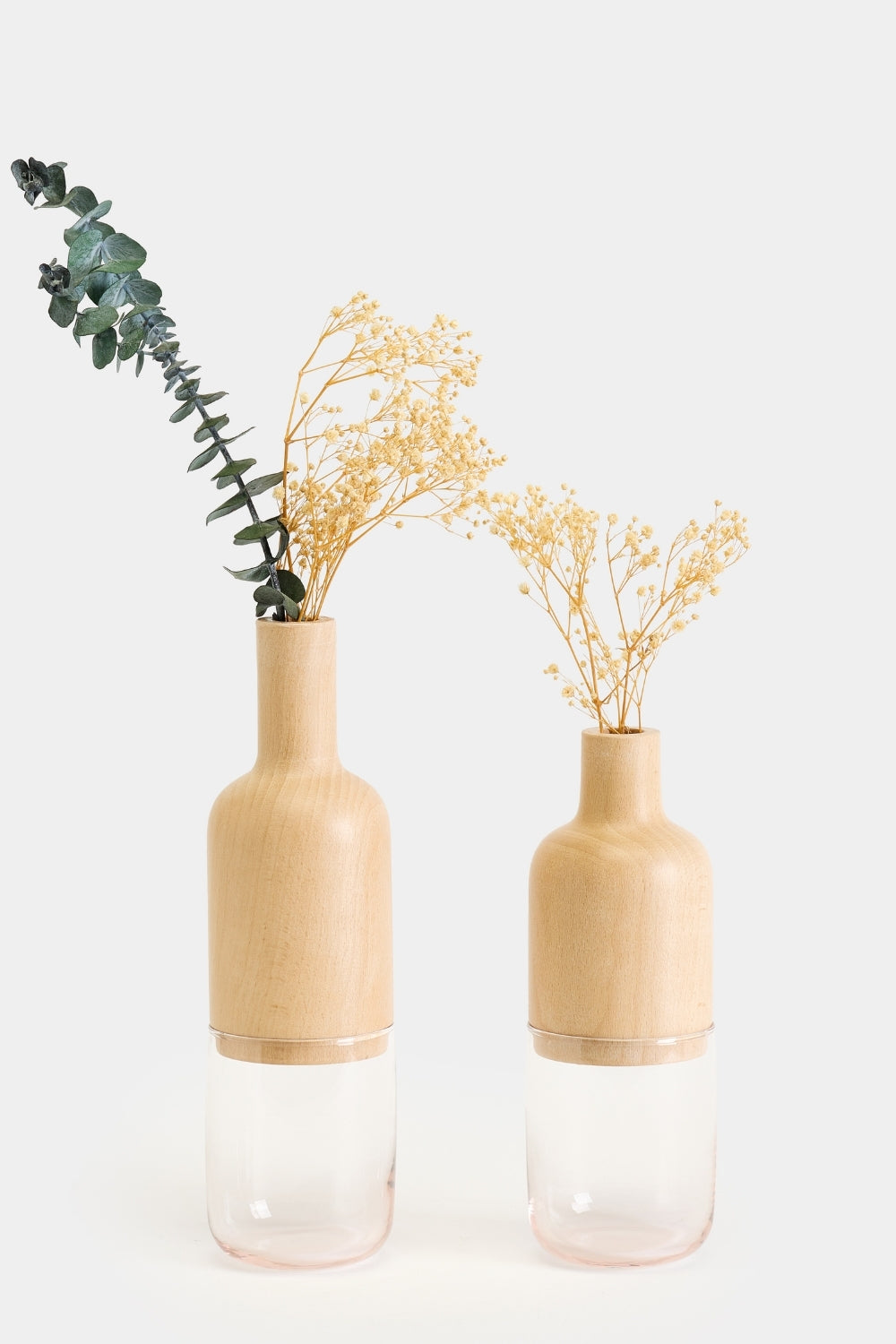Ürün Özellikleri:Malzeme: Cam ve Masif AhşapBoyutlar: Büyük Vazo: Çap: 7 cm, Yükseklik: 24 cm, Küçük Vazo: Çap: 7 cm, Yükseklik: 20 cm,Vazo Ağız Çağı: 1,8 cmDoğal malzeme: Her biri benzersiz el işçiliği
