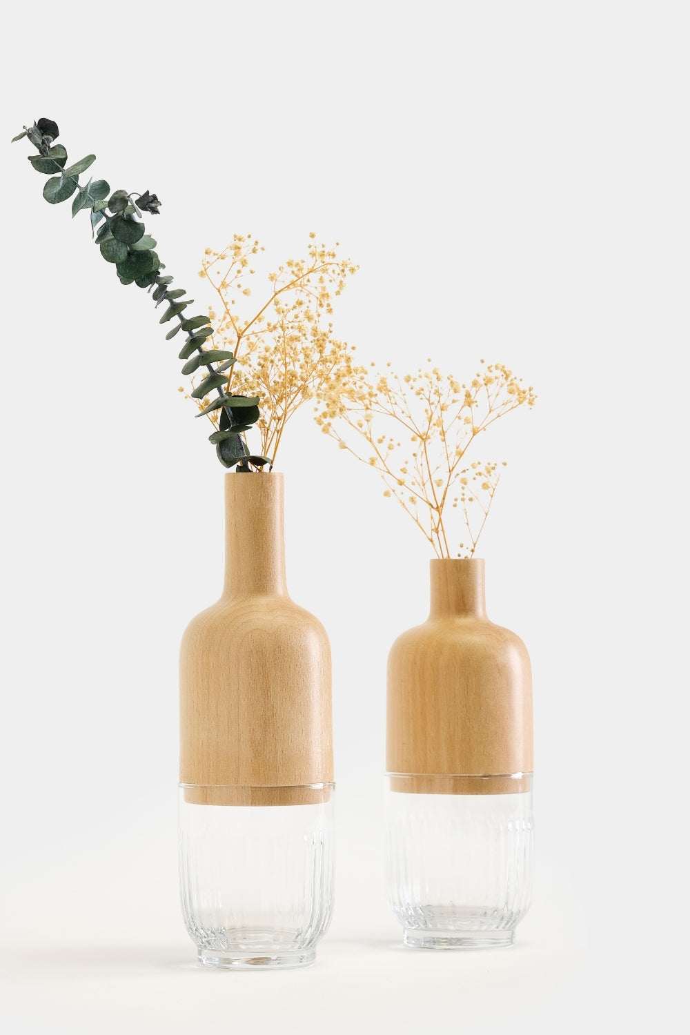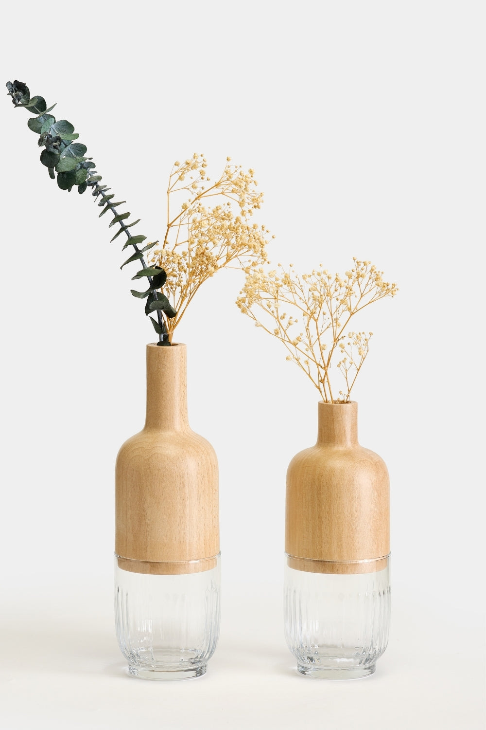 Ürün Özellikleri:Malzeme: Cam ve Masif AhşapBoyutlar: Büyük Vazo: Çap: 8 cm, Yükseklik: 25 cm, Küçük Vazo: Çap: 8 cm, Yükseklik: 20 cm,Vazo Ağız Çağı: 1,8 cmDoğal malzeme: Her biri benzersiz el işçiliği