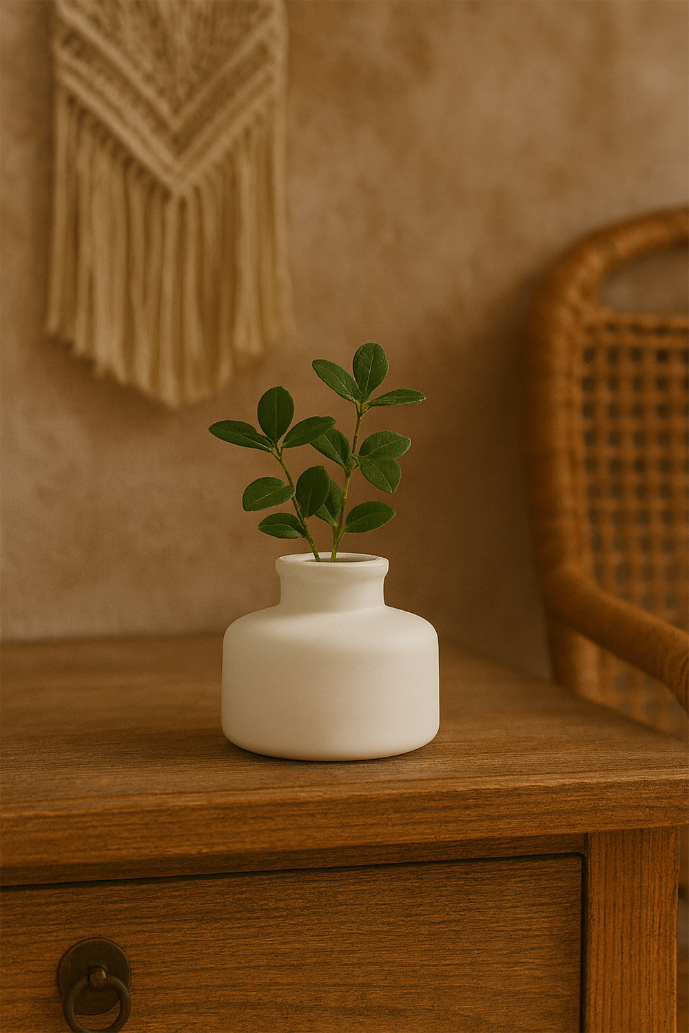 Yuvarlak Vazo, yumuşak hatları ve dengeli formuyla bulunduğu ortama huzurlu ve dengeli bir uyum kazandırır. Minimal ölçüleri sayesinde masa, konsol ya da raf üzerinde rahatlıkla konumlandırılabilir; tek başına sade bir vurgu oluşturur.