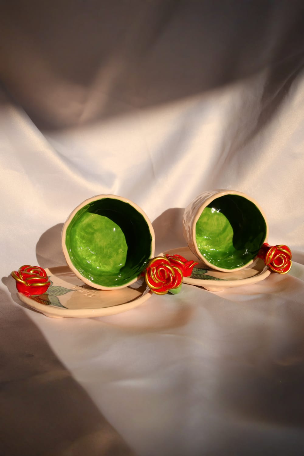 Altın Detaylı Gül Çiçek Kulplu Yeşil Yaprak Çizimli 2'li Türk Kahvesi Seti- Gül Kulplu El Yapımı Seramik Fincanlar