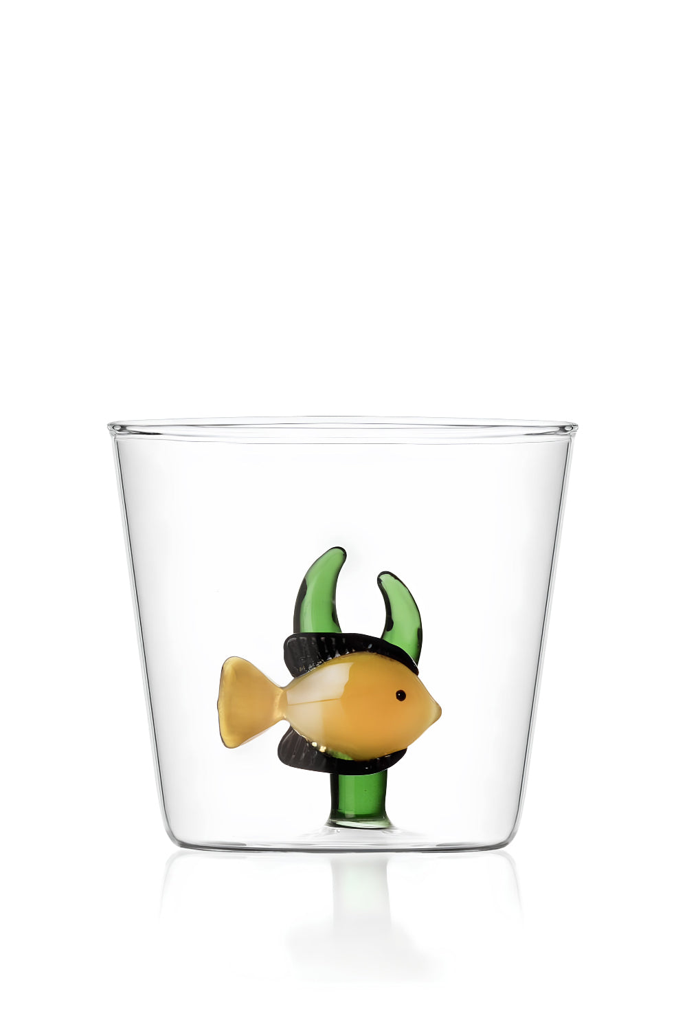 Marine Garden koleksiyonundan amber balık ve yeşil deniz yosunu figürlü cam su bardağı.