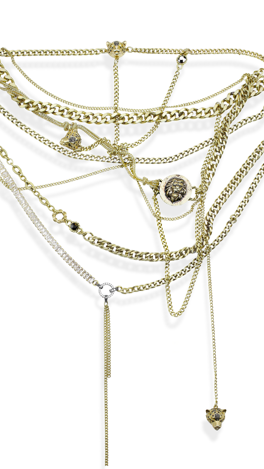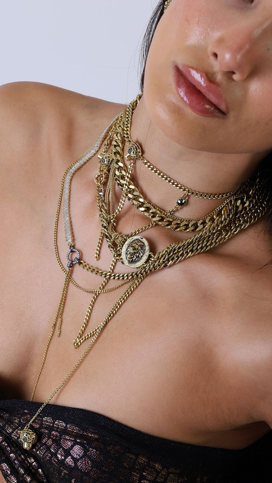 Kristal taşların parlaklığı, feminen enerjinin zarif yanını yansıtırken; tasarımın merkezindeki aslan ve panter charm’ları, içgüdüsel liderliği ve özgüveni hatırlatır. Kalınlıkları farklı 22 ayar altın kaplama pirinç zincirler, bu tasarımı yalnızca bir kolye olmaktan çıkarır ve kadının içsel imparatorluğunu sembolize eden bir zırha dönüştürür.