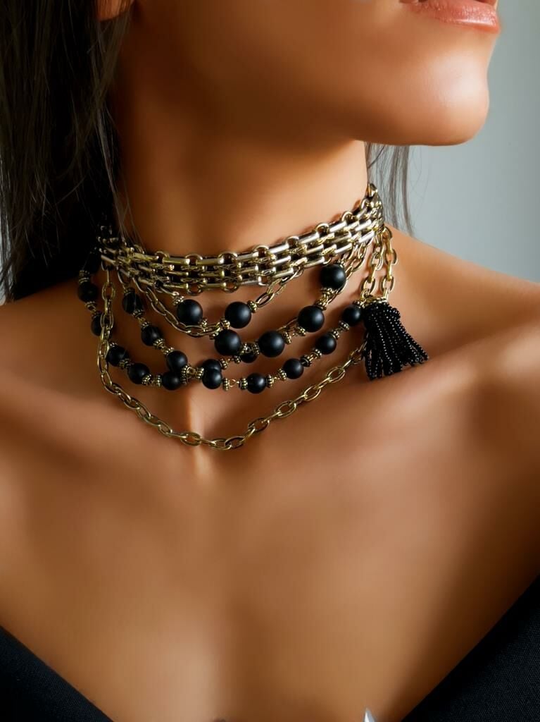 Onyx Doğal Taş Zincir Kolye, derin ve gizemli güzellikleriyle tanınan siyah onyx taşlarının asaletini yansıtıyor. 22 ayar altın kaplama pirinç zincirin özenle işlenmiş halkaları arasına yerleştirilen bu değerli taşlar, kolyeye hem bir ağırlık hem de nadir bir şıklık katıyor. Onyx Doğal Taş Zincir Kolye'nin zarafetini tamamlayan, zengin bir doku sunan siyah hint püskülü, hareket katarken geleneksel ve modern tasarım unsurlarını birleştiriyor. Her bir onyx taşı, kendine özgü karakteriyle taşıdığı anlamı ve gücü simgelerken, püskülün yumuşaklığı ve esnekliği Onyx Doğal Taş Zincir Kolye'nin çekiciliğini artırıyor.