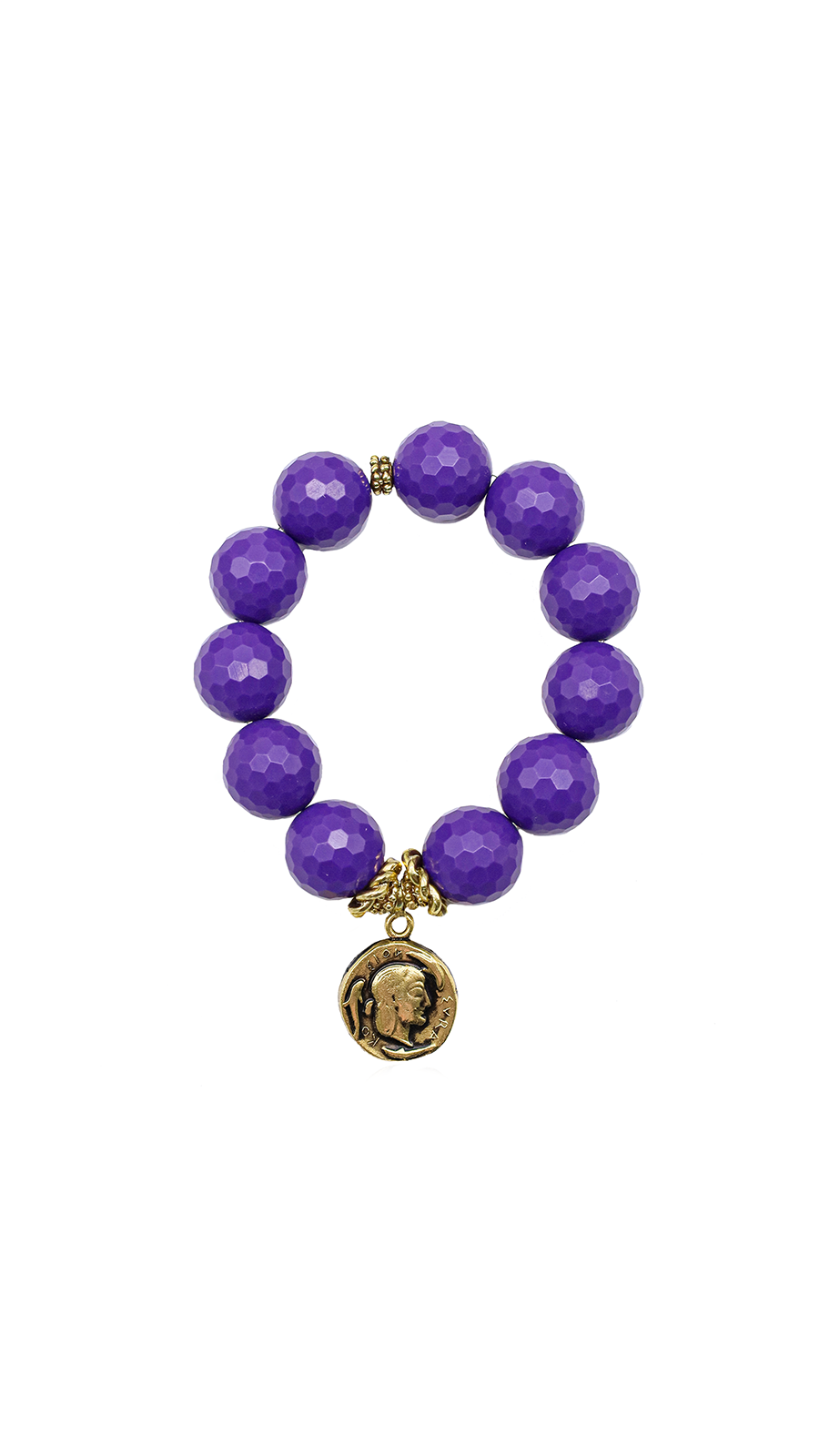 Mor oniks taşlarının derin enerjisiyle örülü bu maksimalist bileklik, her adımda kendine güveni ve kararlılığı hatırlatır. Bilekliğin merkezinde yer alan 22 ayar altın kaplama madalyon, geçmişin ihtişamını ve zamansız liderlik ruhunu simgeliyor.