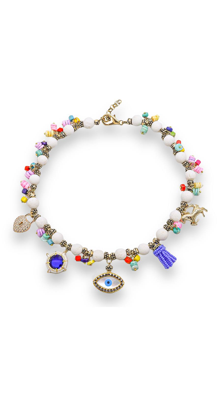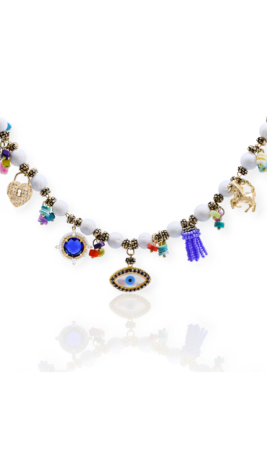Svente Doğal Taş Kolye, dünya çapında seçilmiş malzemelerin ve simgelerin bir araya getirildiği bir kültürlerarası harman sunuyor. Beyaz mercan taşlarının doğallığı ve 22 ayar altın kaplamalı pirinç halkaların şıklığı, bu kolyenin alışılmışın dışında bir görünüm kazanmasını sağlıyor. Aralıklarla yerleştirilmiş renkli sedef taşlar ise tasarıma enerji ve renk katıyor. Svente Doğal Taş Kolye'nin merkezine doğru ilerledikçe, at, kilit, göz, hint püskülü ve kristal taş gibi semboller, dünyanın farklı köşelerinden esintiler taşıyor ve kolyeye derin bir anlam ve karakter kazandırıyor. Svente Doğal Taş Kolye, sadece bir aksesuar olmanın ötesinde, takan kişinin kişisel hikayesini ve ruhunu yansıtan bir sanat eseri olarak öne çıkıyor.