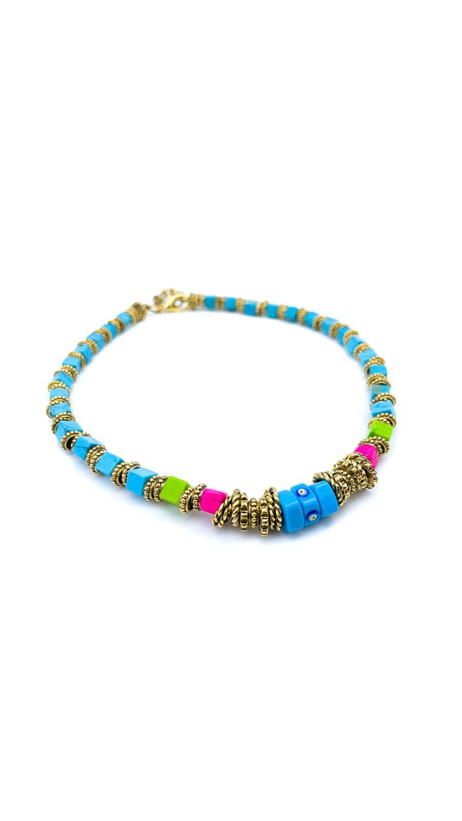 Tallone Doğal Taş Kolye, denizin derin mavisinden ilham alan havlit taşlarıyla başlayarak doğanın benzersiz renk paletini boynunuza taşıyor. 22 ayar altın kaplama pirinç halkalar, taşların doğal güzelliklerini vurgularken, pembe ve yeşil tonlarındaki havlit taşlar kolyenin merkezine doğru zarif bir geçiş sağlıyor. Kolyenin kalbinde yer alan Murano cam taşları ise bu sanat eserini tamamlıyor, ona sofistike bir parlaklık ve benzersiz bir dokunuş katıyor. Tallone Doğal Taş Kolye, hem zarafeti hem de doğal güzelliği bir araya getirerek tarzınıza eşsiz bir dokunuş katar.