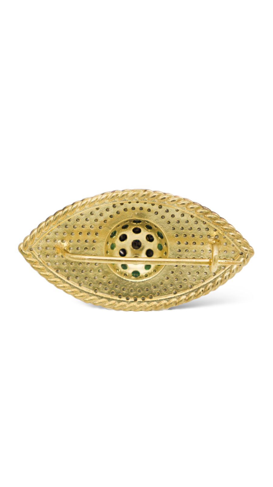 Sanatsal bir dokunuşla hayat bulan Yeşil Göz Broş, 22 ayar altın kaplama pirincin asil parlaklığında, özenle seçilmiş kristal taşların büyüsünü barındırır. Her bir taş, derin yeşil tonlarının eşsiz dansını yansıtarak, göz alıcı bir kompozisyon oluşturur. Yeşil Göz Broş, hem antik bir dokunuşa sahip olup hem de modern bir zarafetle şekillenir. Takıldığı her an, sade ama etkileyici bir sanat eserini yanınızda taşımanızı sağlar.
